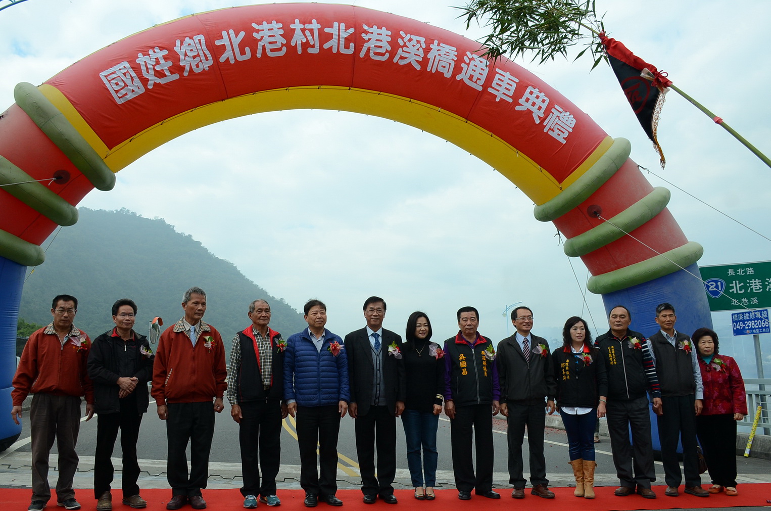 位於國姓鄉北港村的北港溪橋,22日舉行新橋完工通車典禮,縣長林明溱牽著高齡92歲的溫文枝老夫婦,在鑼鼓喧天及鞭炮聲中,和當地民眾走過新建完成的北港溪橋,並從糯米橋繞行一圈,許多民眾也準備了豐富的牲禮祭品於橋頭祭拜普渡,祈求通車平安,現場人聲鼎沸、熱鬧滾滾。