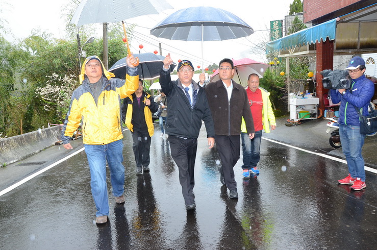 縣長林明溱29日上午冒雨前往鹿谷鄉內湖村興產路視察道路改善情況與工程品質,並聽取民眾意見,民眾對於林縣長劍及履及的行政效率及完工後的AC路面品質表達高度肯定。