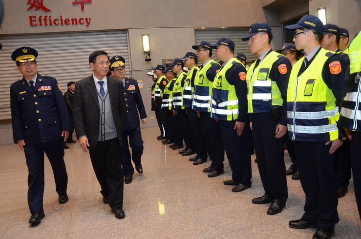 縣府警察局為展現105年春安工作期間維護治安決心,1日晚間9時30分召集所屬員警、憲兵及義警、民防、義交、志工、守望相助隊等相關民力,在該局大廳舉行勤前教育、警力及裝備展示,由縣長林明溱主持,並校閱春安警力,場面壯觀。林縣長表示,今年春安工作是以治安平穩、交通順暢及熱心服務等三項重點為主軸,希望讓民眾安心過好年,值勤期間也要特別注意自身安全。