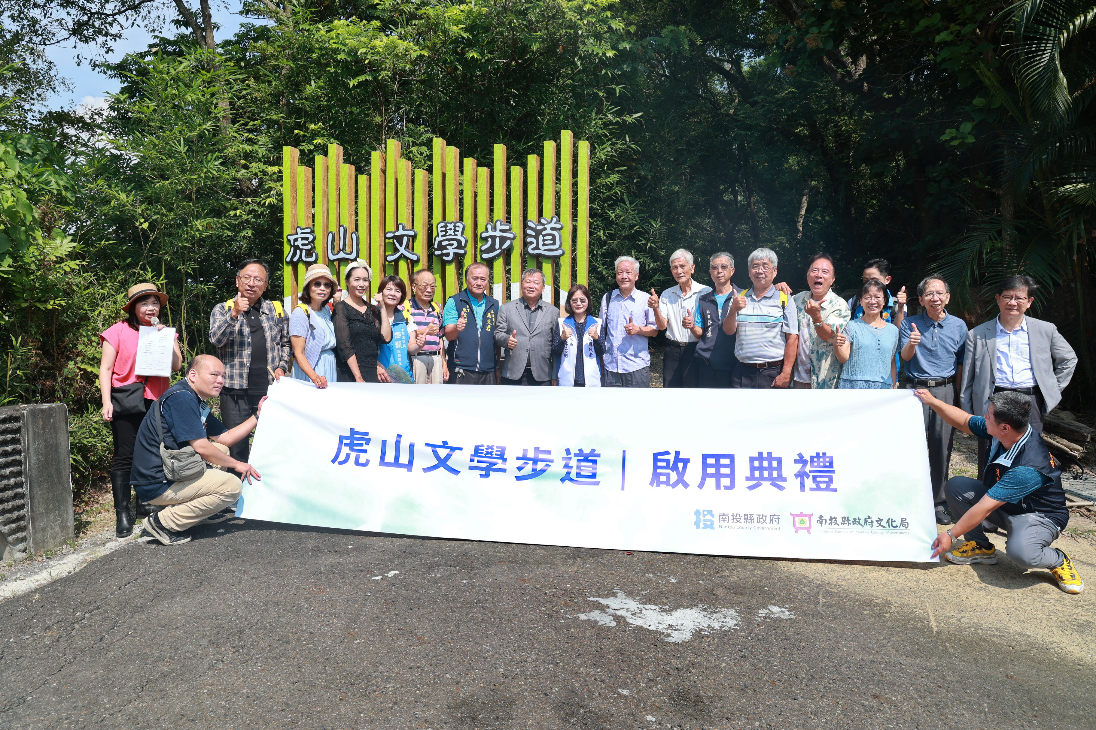 隨後,王副縣長及出席活動作家,一起為虎山文學步道揭牌,並偕同「巡禮」。現場聽作家創作動機及詩詞意涵,讓人心領神會外,更是一場作家的交流,彼此惺惺相借。虎山文學步道的15件文學作品有:向陽〈中興光影〉、李威熊〈人生步道〉、鄧相揚〈以中興新村為名〉、蕭蕭〈南投製茶人〉、林黛嫚〈回家〉、李瑞騰〈題虎山步道〉、簡榮聰〈省府庭園遊觀〉、林廣〈中興映像〉、焦桐〈夢回中興新村〉、李展平〈誰在耳邊輕喚〉、陽荷〈眷舍小巷〉、潘樵〈山林裡有風〉、陳秀枝〈虎山•人生〉、張欣芸〈印在心底的指紋〉、林文龍〈虎山頌〉,作品均以中興新村為意象。虎山文學步道是平易近人的「羽量級步道」,民眾在健行踏青時,亦能欣賞優美的文學,輕鬆體驗近郊旅遊的樂趣。