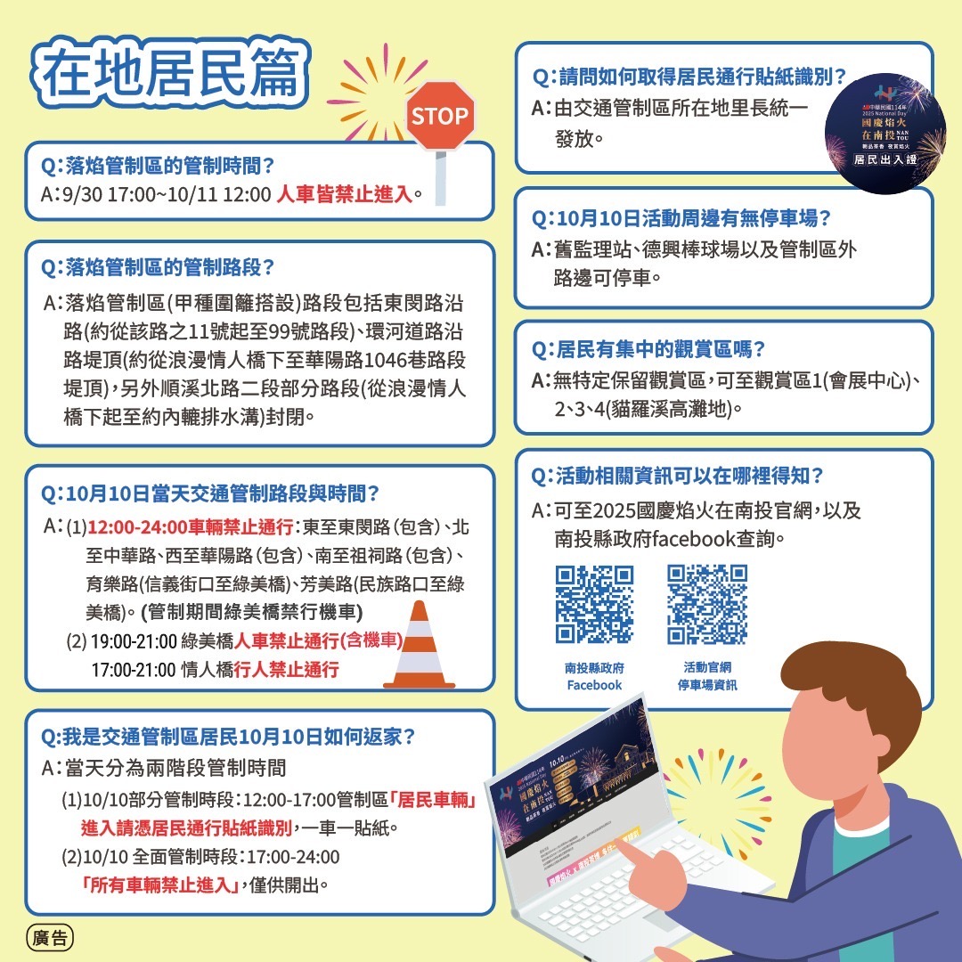 南投縣政府提醒,活動期間人潮眾多,請市民留意交通與安全管制,共同營造安全有序的觀賞環境。國慶當晚,除了40分鐘壯麗焰火,現場還有DJ混音焰火秀與壓軸演唱卡司,邀請大家一同見證南投夜空最閃耀的時刻。