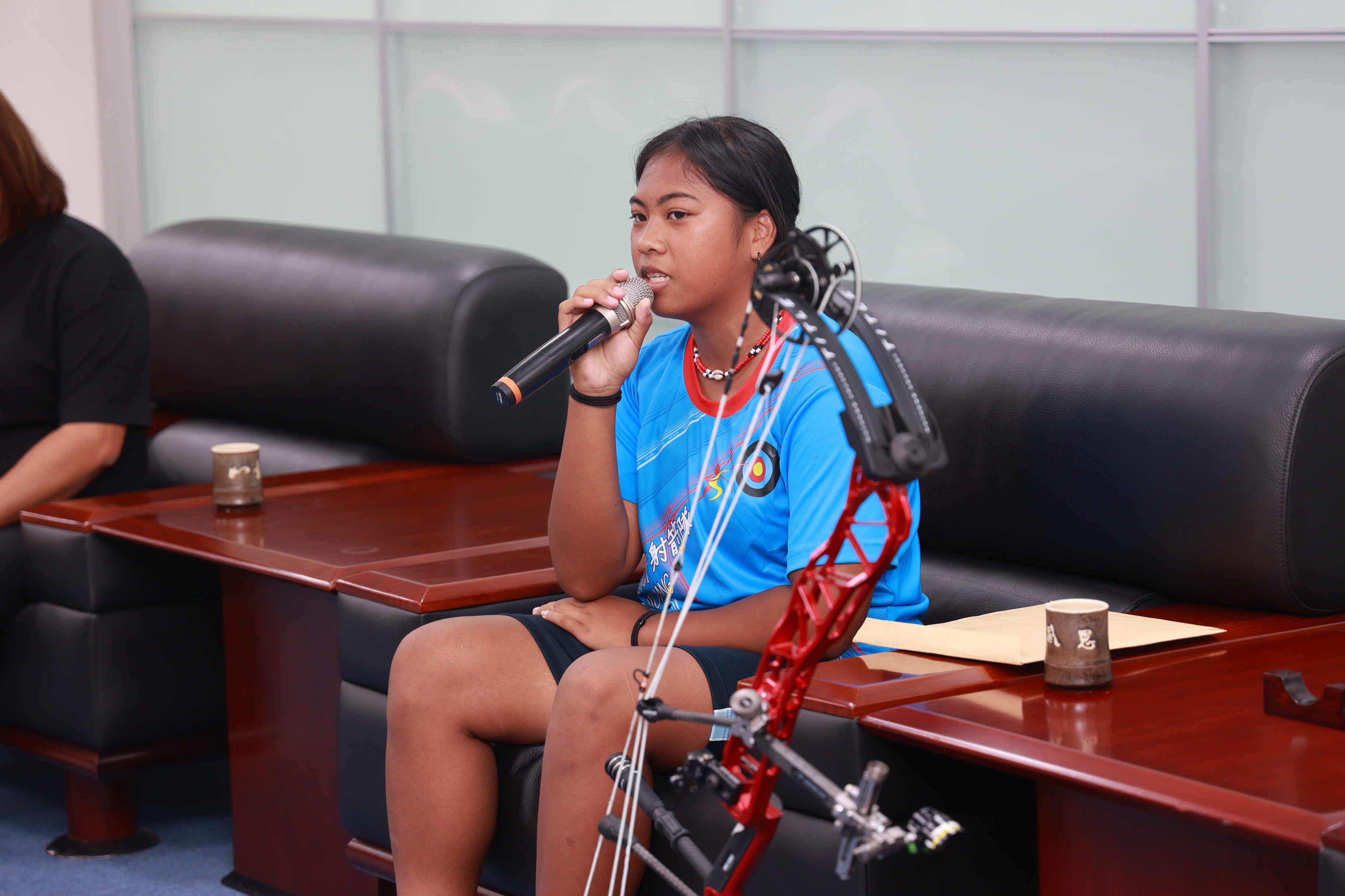 榮獲今年總統教育獎的田萱,是旭光高中國中部學生,日前獲得許淑華縣長贈送的專屬射箭弓,帶著這把弓及感謝的心,田萱向縣長、副縣長及協會致謝,並表示將會持續努力,不辜負大家的期望。