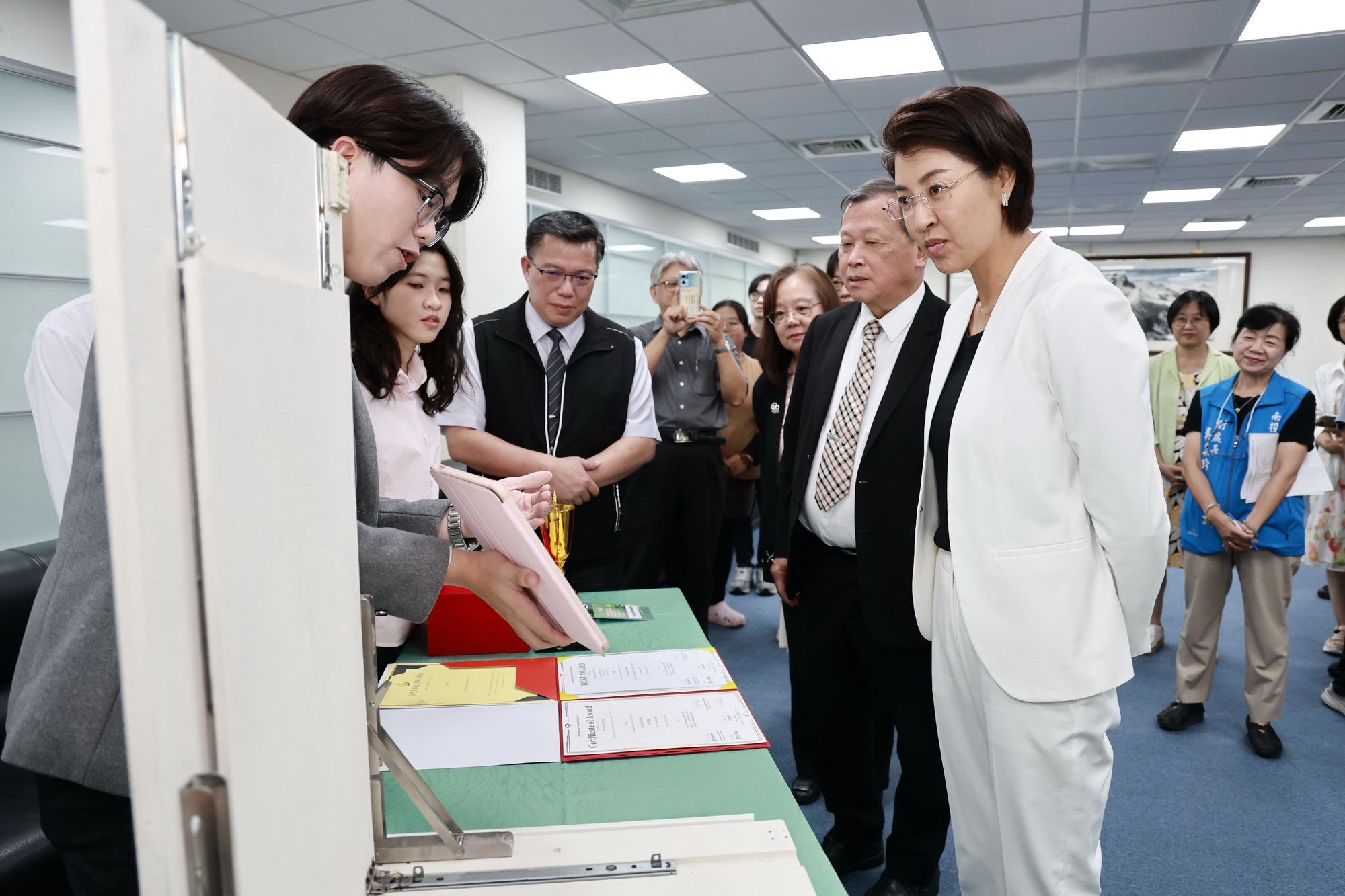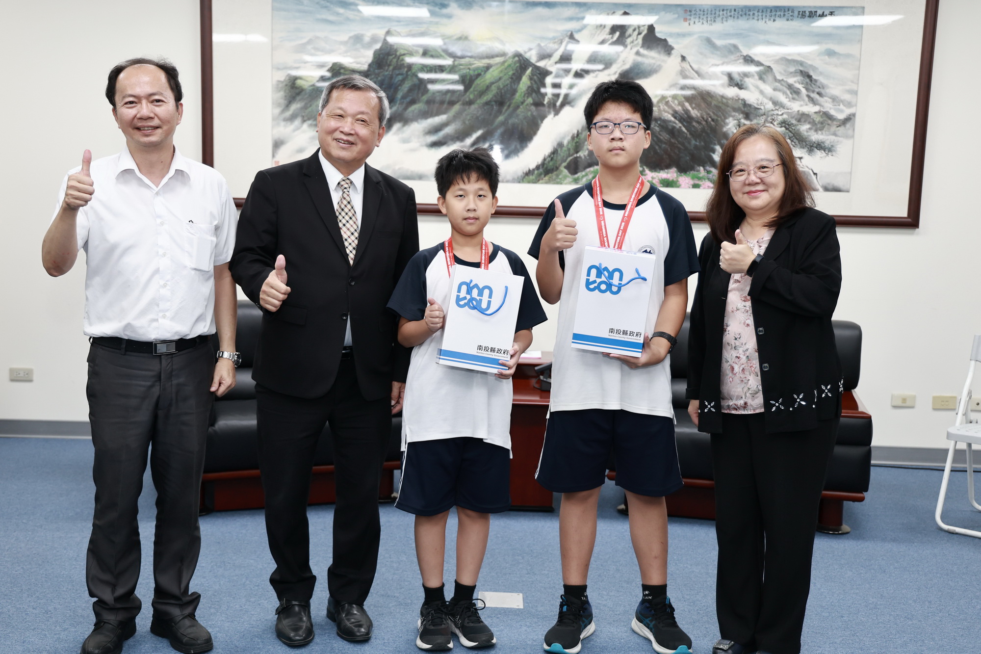 南投高中與鯉魚國小學生團隊日前參加2025年印尼國際青少年發明家日(International Young Inventors Award, IYIA)競賽,在全球21國共486件參賽作品中脫穎而出,分獲金、銀牌佳績。副縣長王瑞德3日於縣長室接見表揚並頒發獎品,肯定他們的優異表現,縣長許淑華也驚喜現身,到場關心鼓勵,並聆聽學生們的創意發想與作品介紹。