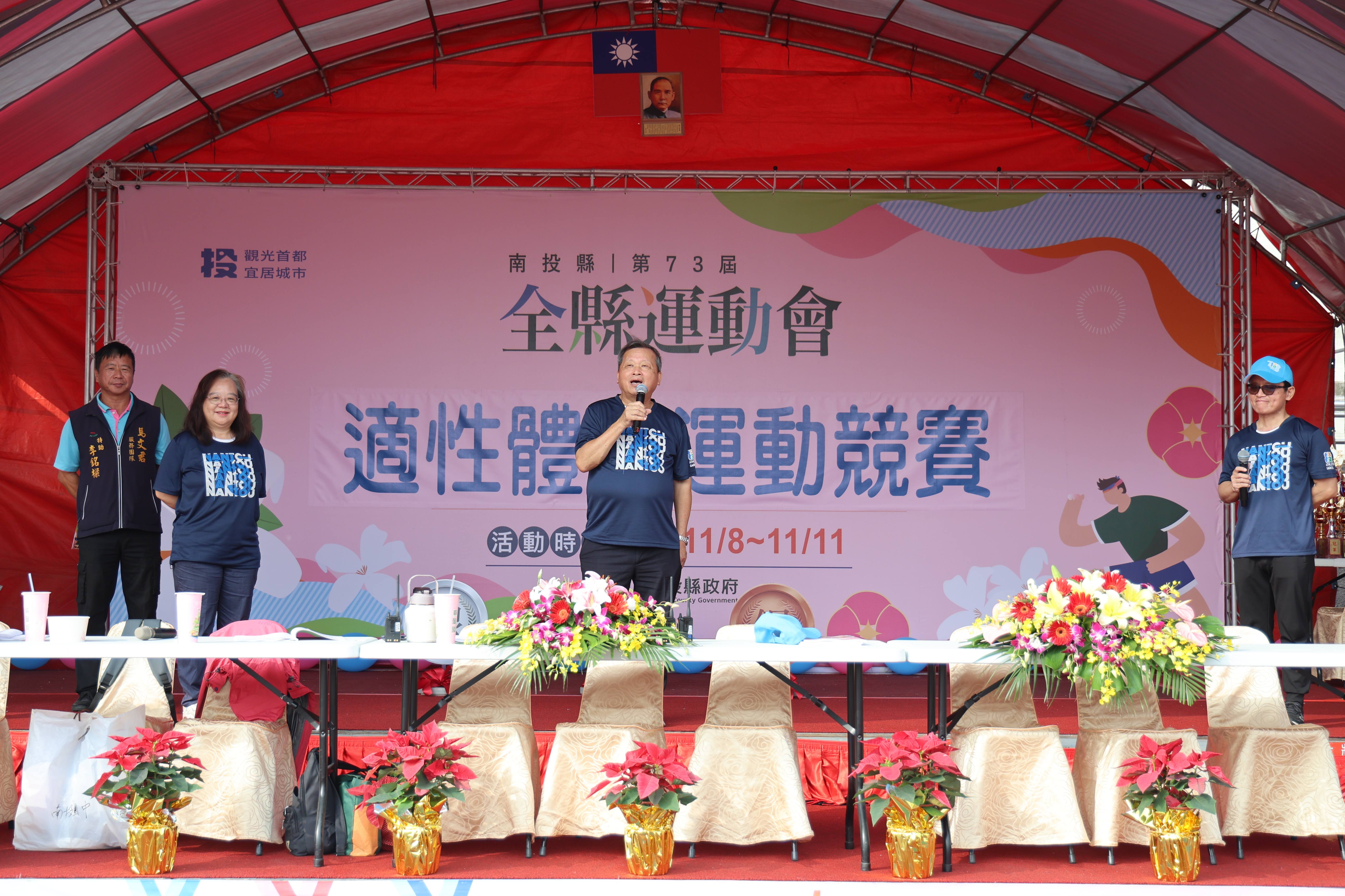王副縣長指出,很高興代表許淑華縣長主持第73屆的南投縣適性體育競賽開幕活動,適性體育競賽就是提供身心障礙的學生及安置社福機構的大小夥伴,走向陽光展現活力與樂觀的運動會,今天冬陽露臉、微涼,是非常適合大小夥伴們在運動場上奔馳的好天氣,期待與希望所有身心障礙大小朋友,就跟今天的陽光一樣,永遠都是亮麗積極,保持樂觀陽光的心情,去擁抱自己的美好生活。