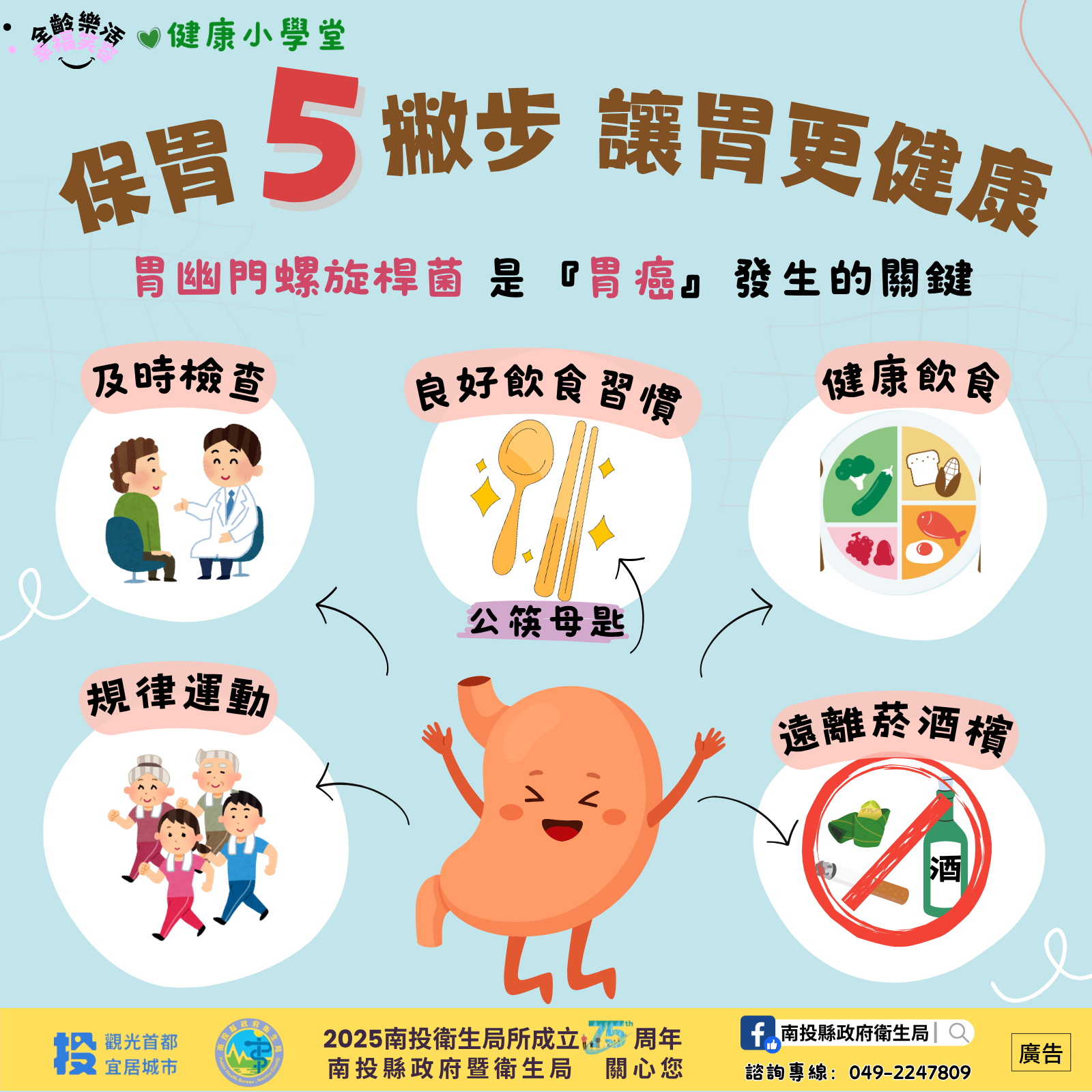 縣府衛生局長陳南松提醒民眾,無論年齡、職業或健康狀況,都應重視腸胃健康與癌症風險。特別是有胃病史或家族病史者,更應定期檢查,雖然胃瘜肉相當常見,但仍不可掉以輕心,尤其增生性與腺瘤性胃瘜肉具有較高的癌化風險,一旦發現應及早治療,避免病情惡化。再次呼籲民眾可從日常生活中落實「保胃5撇步」,遠離胃癌風險: