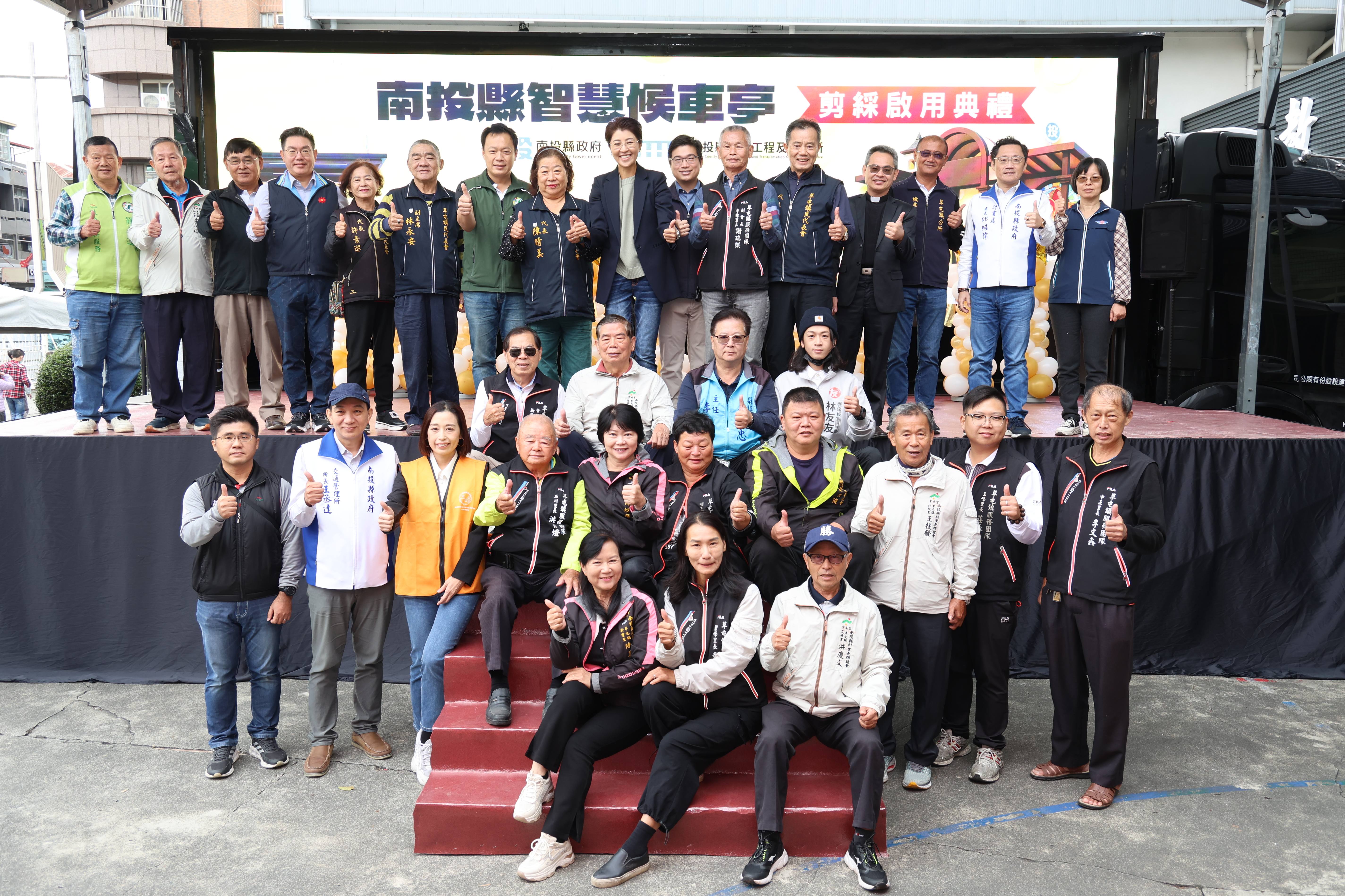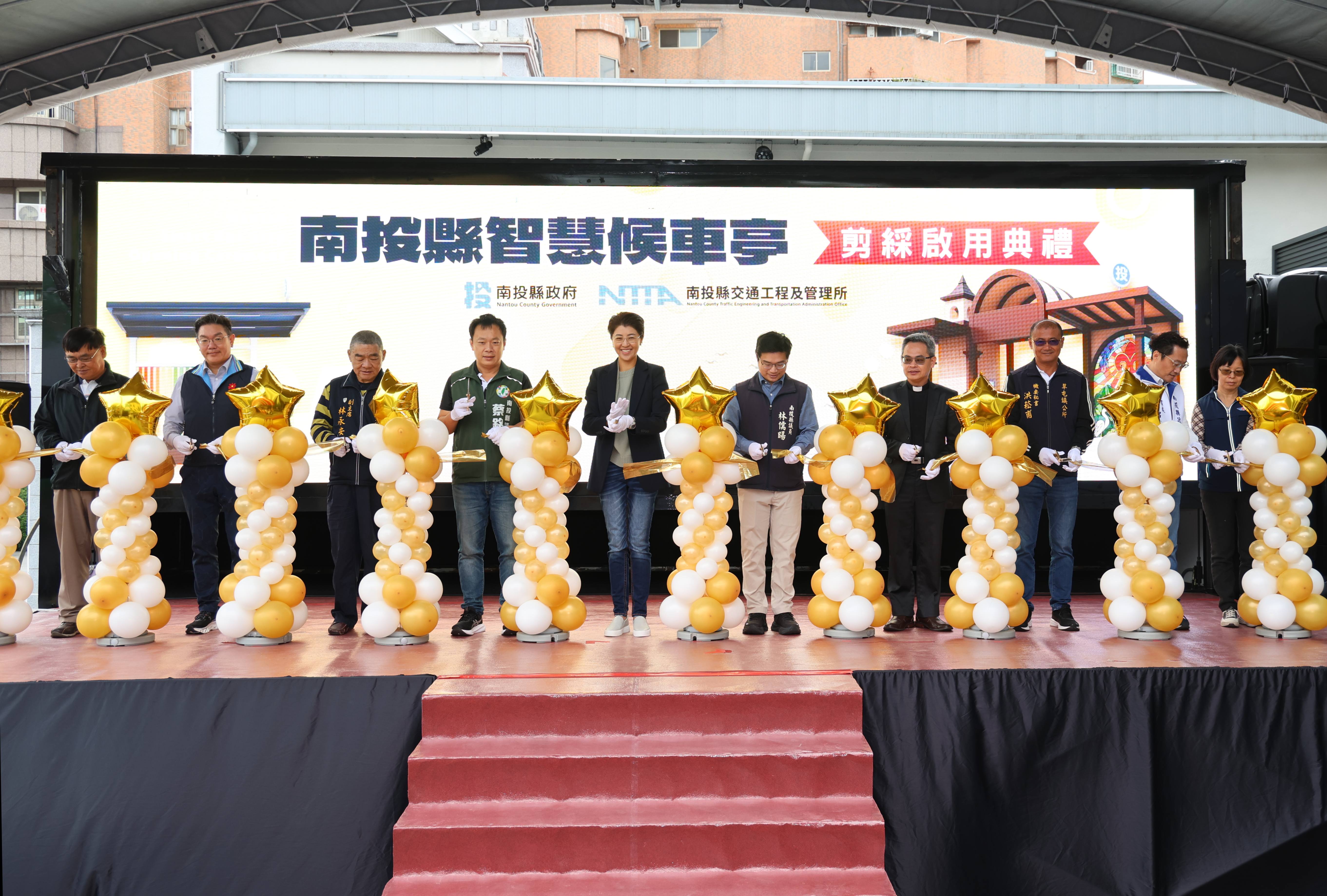 南投縣政府為提升通勤民眾交通便利,積極調查全縣候車亭改善需求,並推動候車亭改善與建置,今年共完成10處智慧候車亭及6處智慧站牌,除提供即時的班車到站或等候時間,還有按鈕即以亮燈提醒「運轉手」民眾有搭車需求的「乘車服務鈕」,19日在全新改頭換面的草屯鎮基督長老教會前大觀站特色候車亭,舉辦智慧候車亭啟用典禮,親自剪綵的縣長許淑華開心表示,明年至少還會再新增28處智慧候車亭或站牌,希望各鄉鎮村里長大力協助取得用地,加速智慧型候車服務普及全縣。
