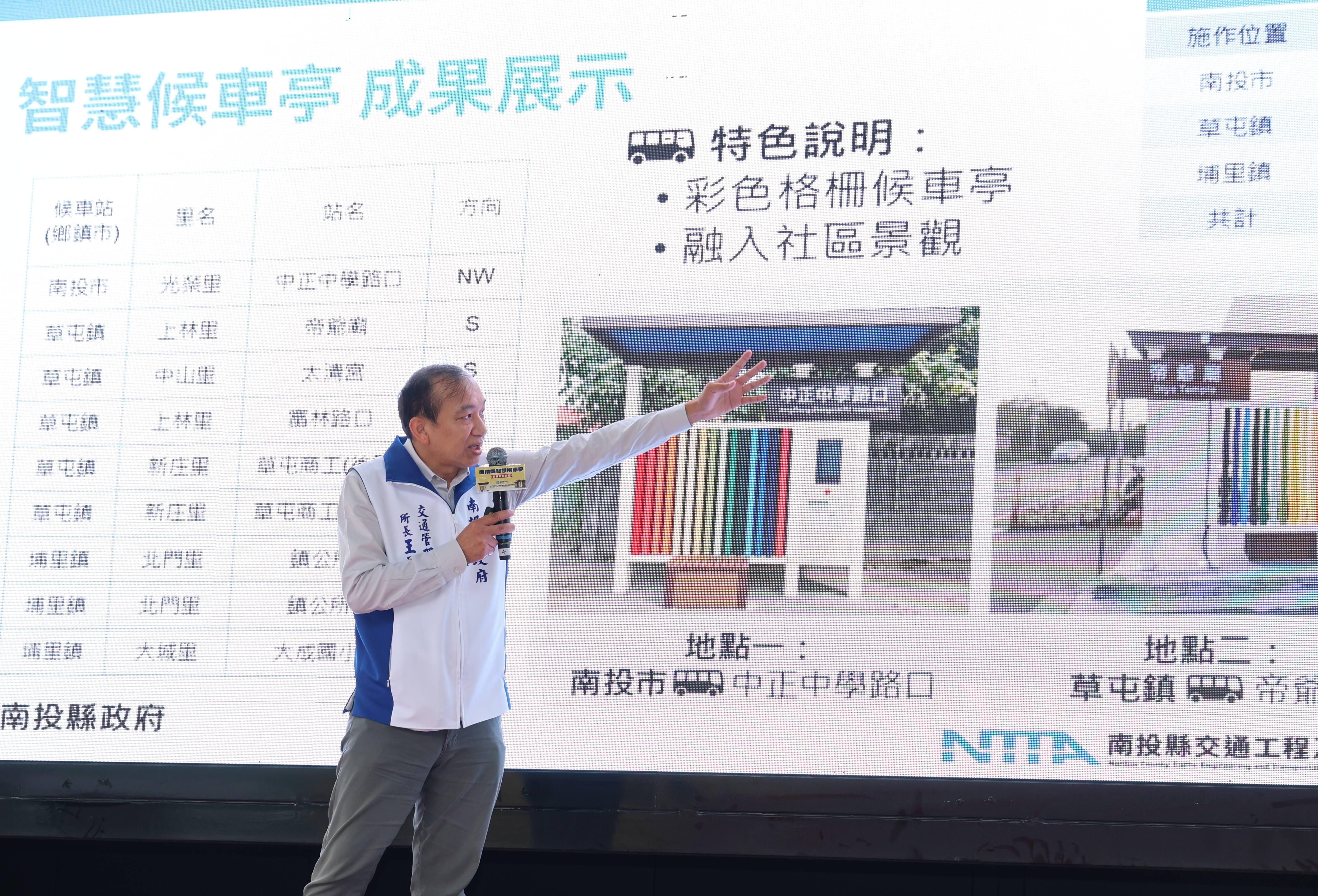 南投縣交通管理所長王丞達簡報指出,本興建的候車亭除照明、座椅等基礎設施,也首次規模性引進智慧候車亭與智慧站牌設計,提供通勤民眾即時到站資訊,讓民眾候車更加便利。