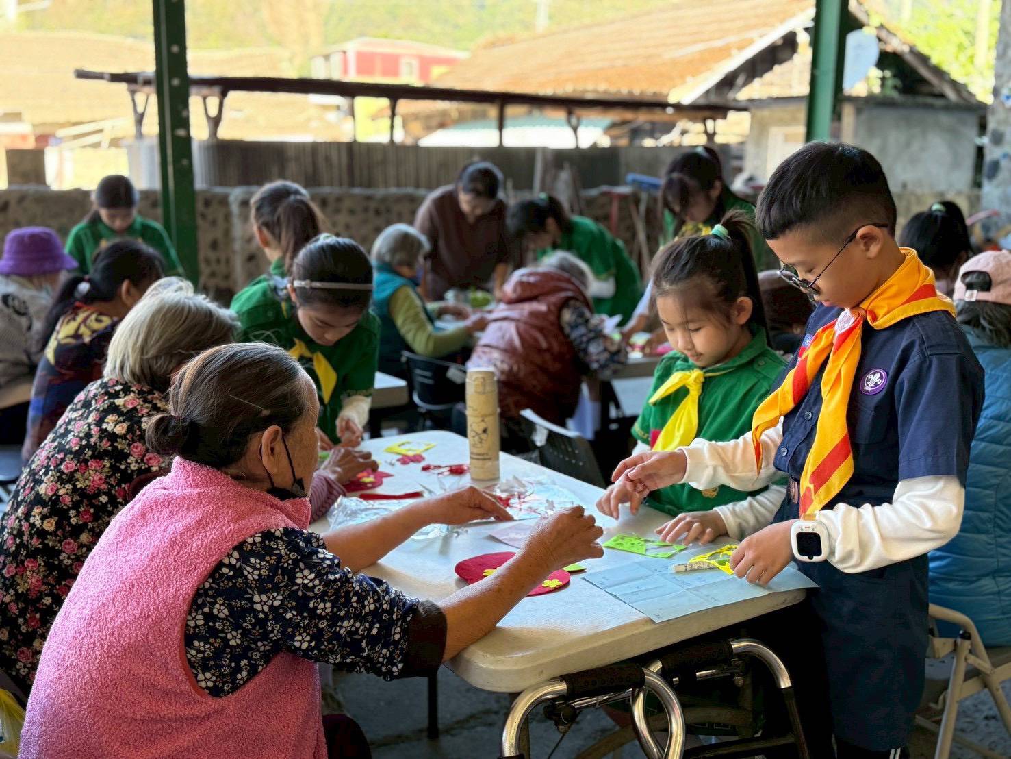 活動開始前,學生們在大會安排下進行環境認識及任務說明,隨後分別前往兩個據點展開關懷服務。學生們帶來多元精彩的才藝演出,並與爺爺奶奶們共同手作紀念品,長者們臉上滿是笑容,現場互動熱絡。童軍以實際行動展現敬老精神,傳遞溫馨與祝福,也讓社區長者感受到滿滿關懷。
