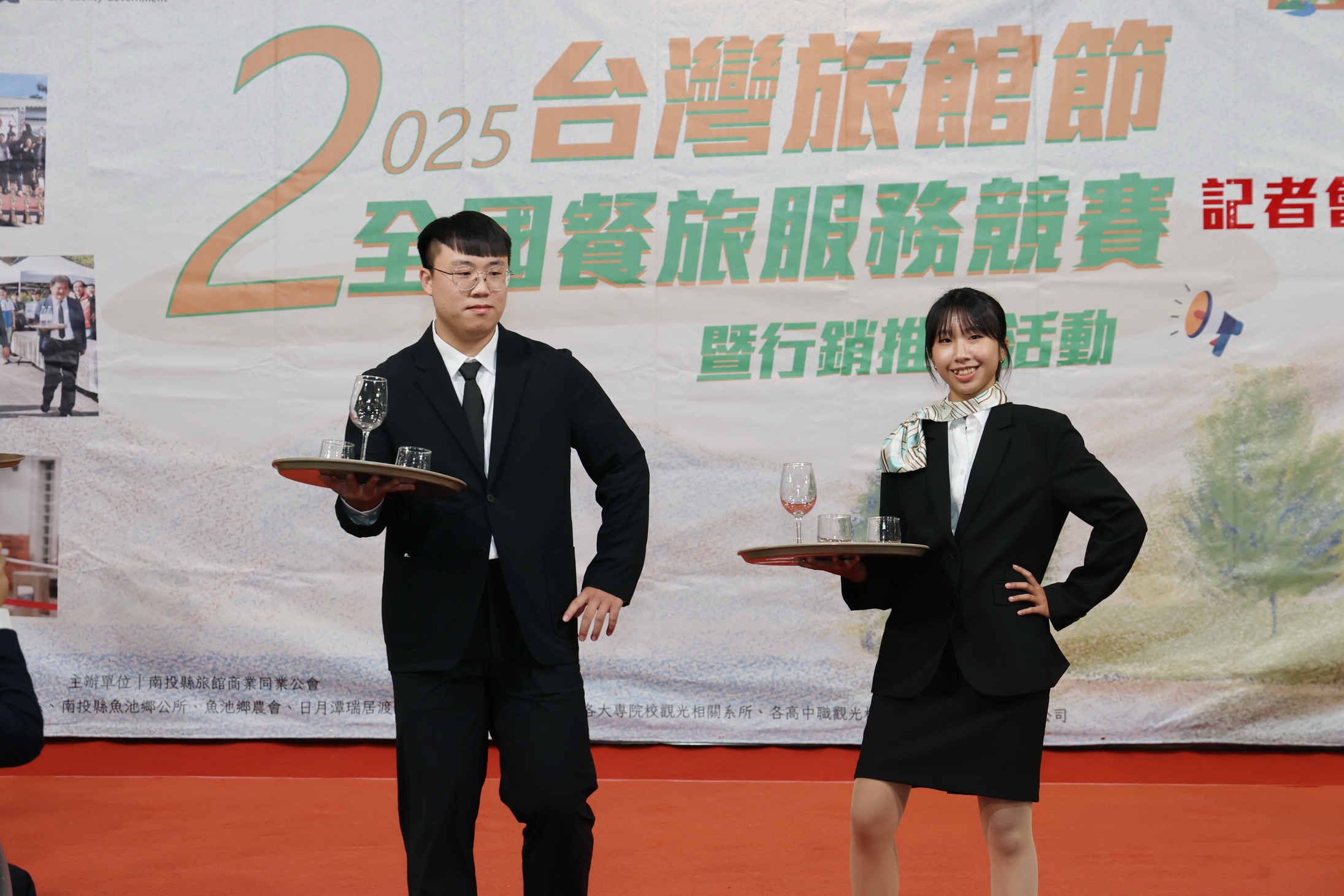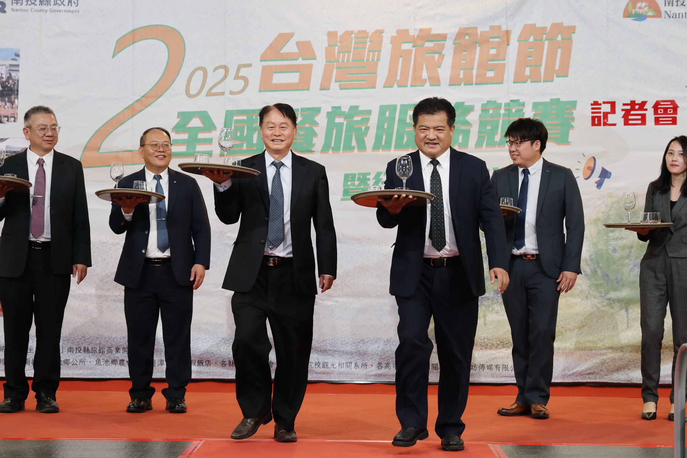 南投縣旅館商業同業公會26日在縣府一樓大廳舉辦賽前記者會,由縣府代理秘書長簡青松、交通部觀光署日月潭國家風景區管理處副處長湯維堯及旅館公會理事長暨日月潭觀光圈聯盟盟主李吉田共同主持,並一同下場體驗拖盤走秀,為全國最具指標性的餐旅技能盛會揭開序幕。