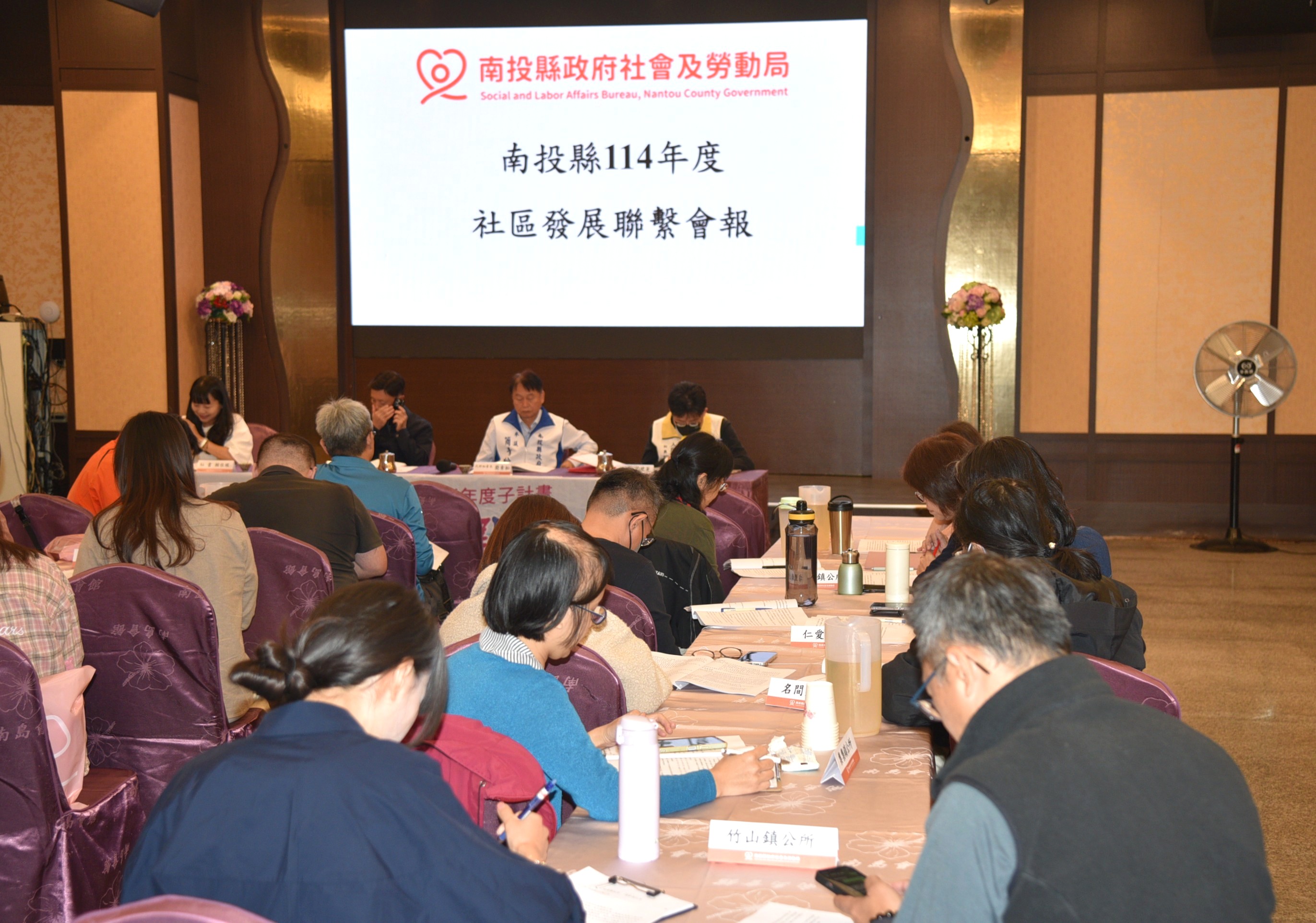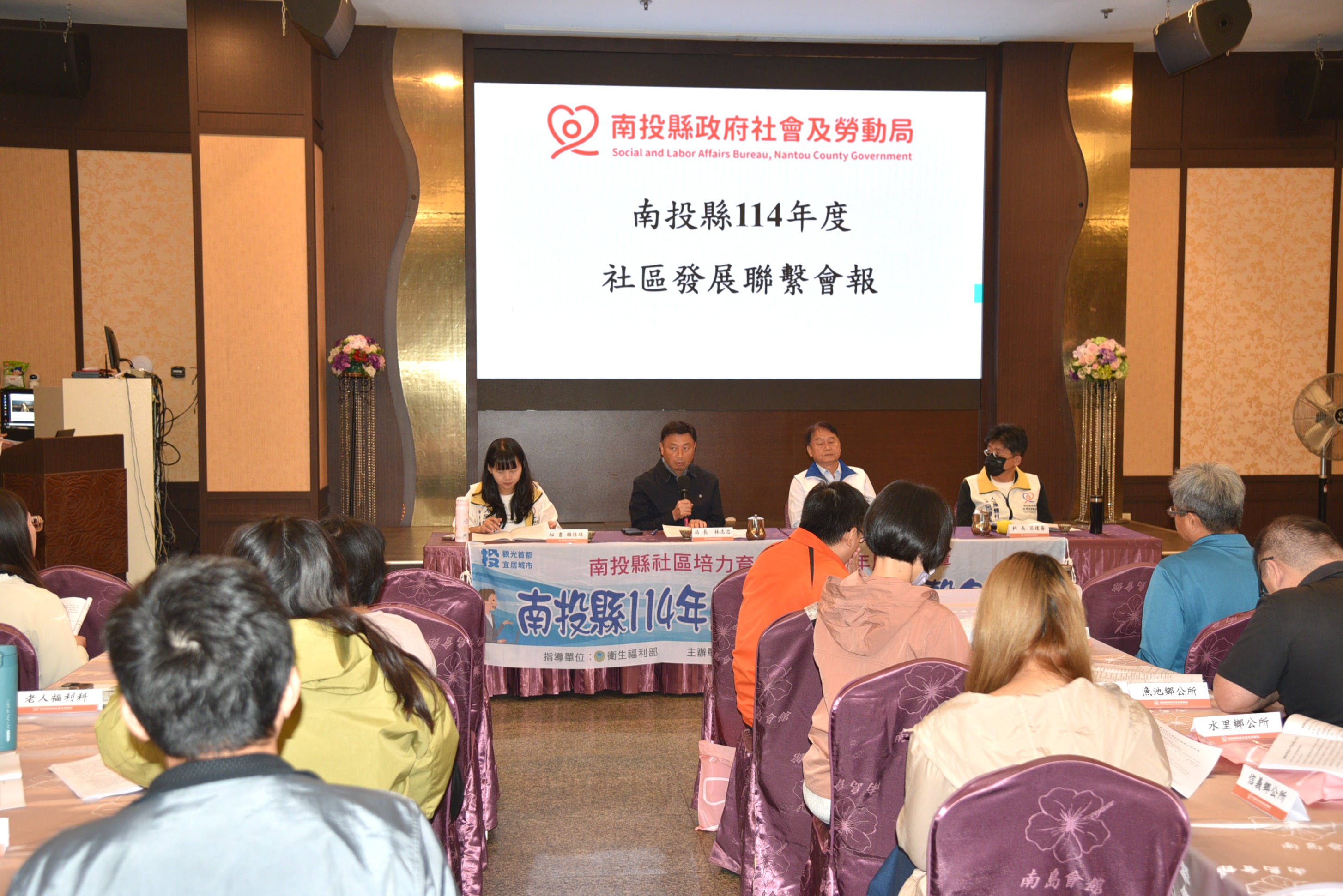 縣府社會及勞動局11月26日上午在南島會館會議室辦理「南投縣114年度社區發展業務聯繫會報」,本次會議共有 41 位代表出席,包括全縣 12 個鄉鎮市公所的社區主管與承辦人員,以及縣府8 個局處的相關業務單位,共同就社區發展政策、推動成效及跨域合作進行交流與研商。