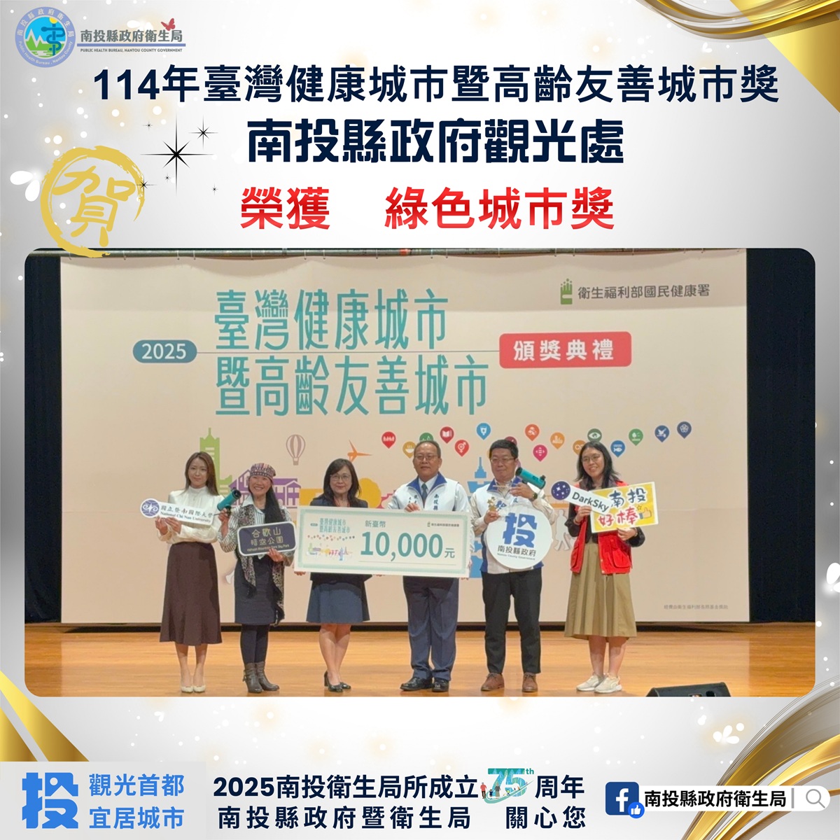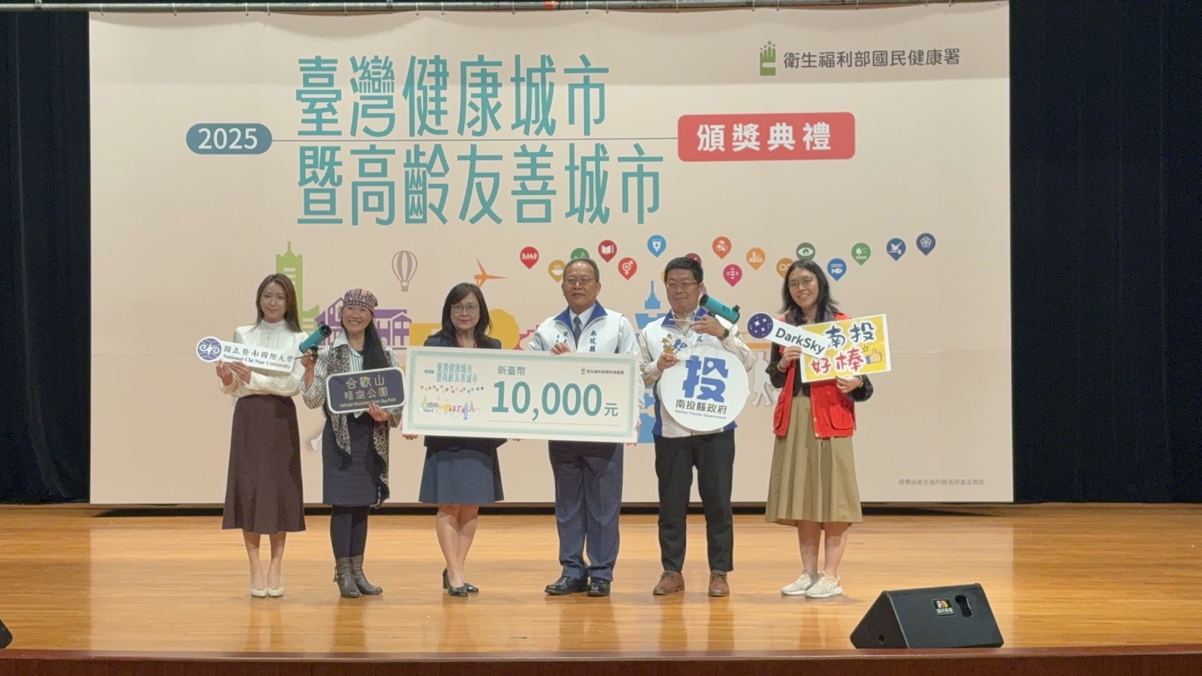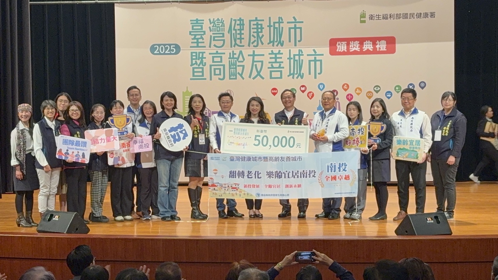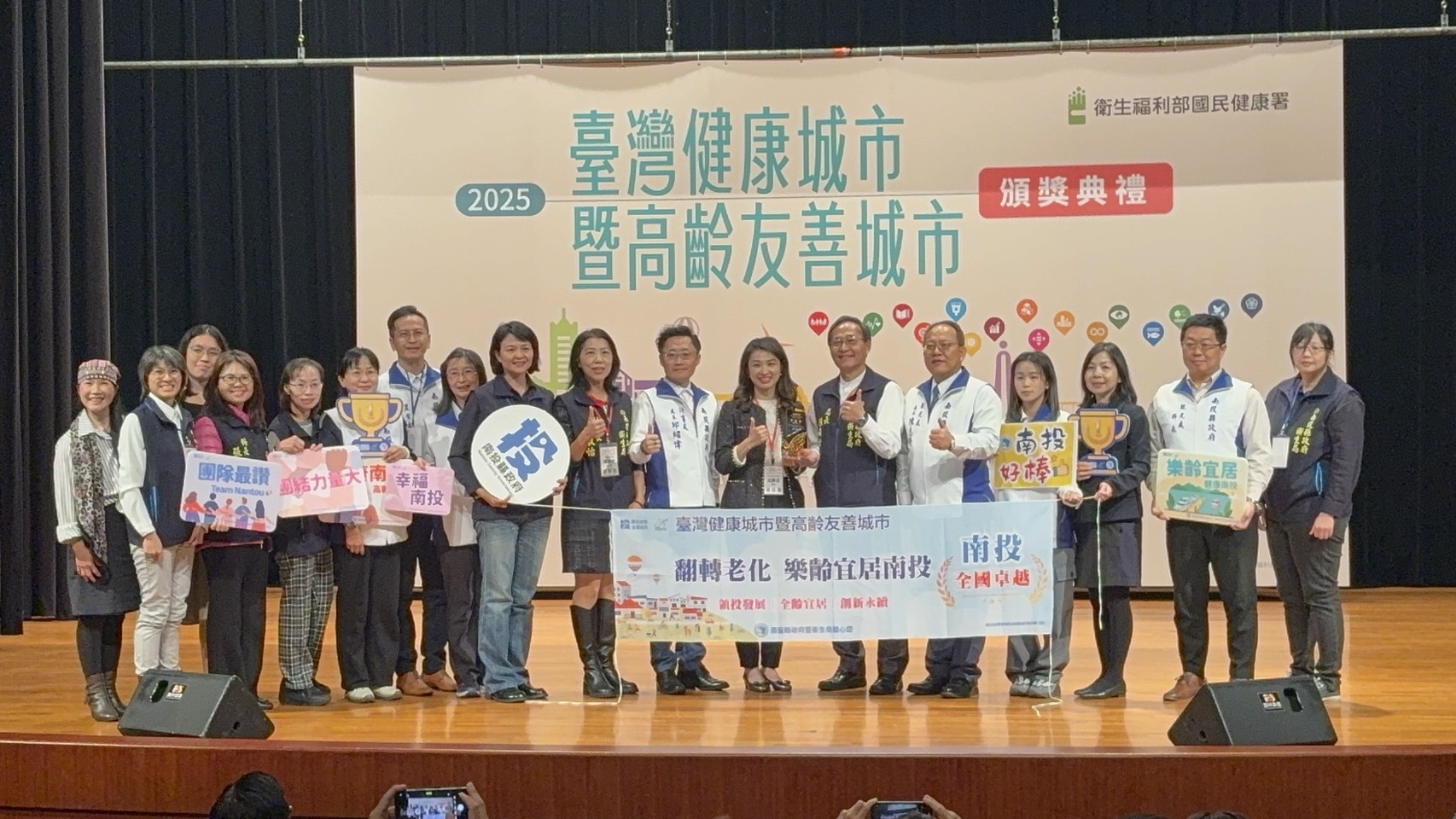 衛生福利部國民健康署11月28日於公務人力發展學院福華國際文教會館卓越堂舉辦「114年臺灣健康城市暨高齡友善城市獎頒獎典禮」,南投縣以《翻轉老化 樂齡宜居南投》勇奪全國唯一「縣市組–卓越獎」,取得最高的榮譽,由共同投稿單位首長、衛生局長陳南松及計畫處長邱紹偉出席代表領獎。