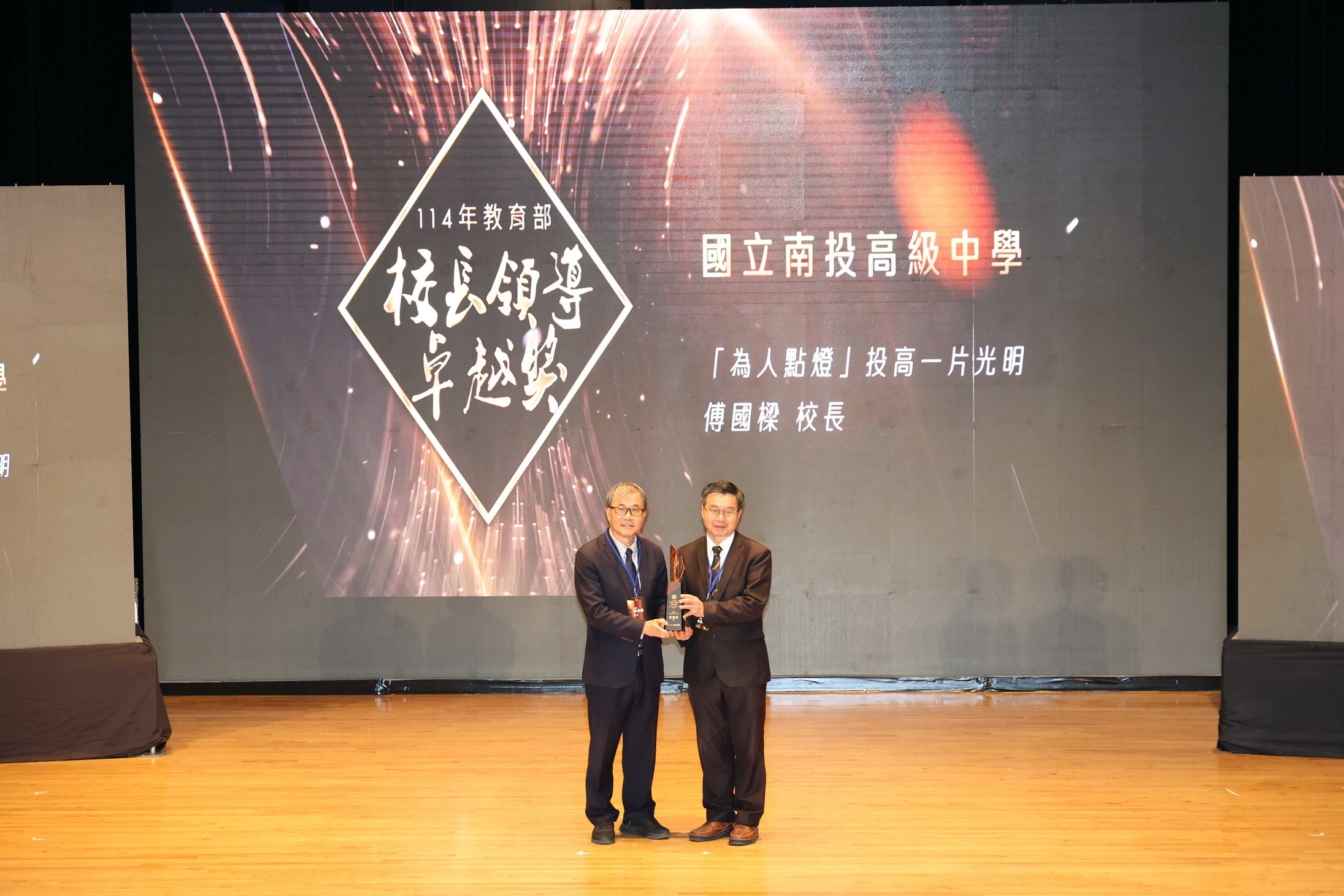 本次獲校長領導卓越獎的前國立南投高中傅國樑校長教育理念為「以人為本、多元適性、全人教育」,彰顯學習者主體性、獨特性、可塑性,每一位學生都是不一樣的獨特個體,各自擁有多元智慧與性向,「努力不是要超越別人,而是要成為更好的自己」。傅校長以「生而不有,為而不恃,長而不宰」思維,打造「適性揚才、成就每個學生的卓越優質高中」,落實教育政 策在各科教學領域及活動,推動「學術、技藝、體藝」金三角教育目標,讓學生都能適性發展。