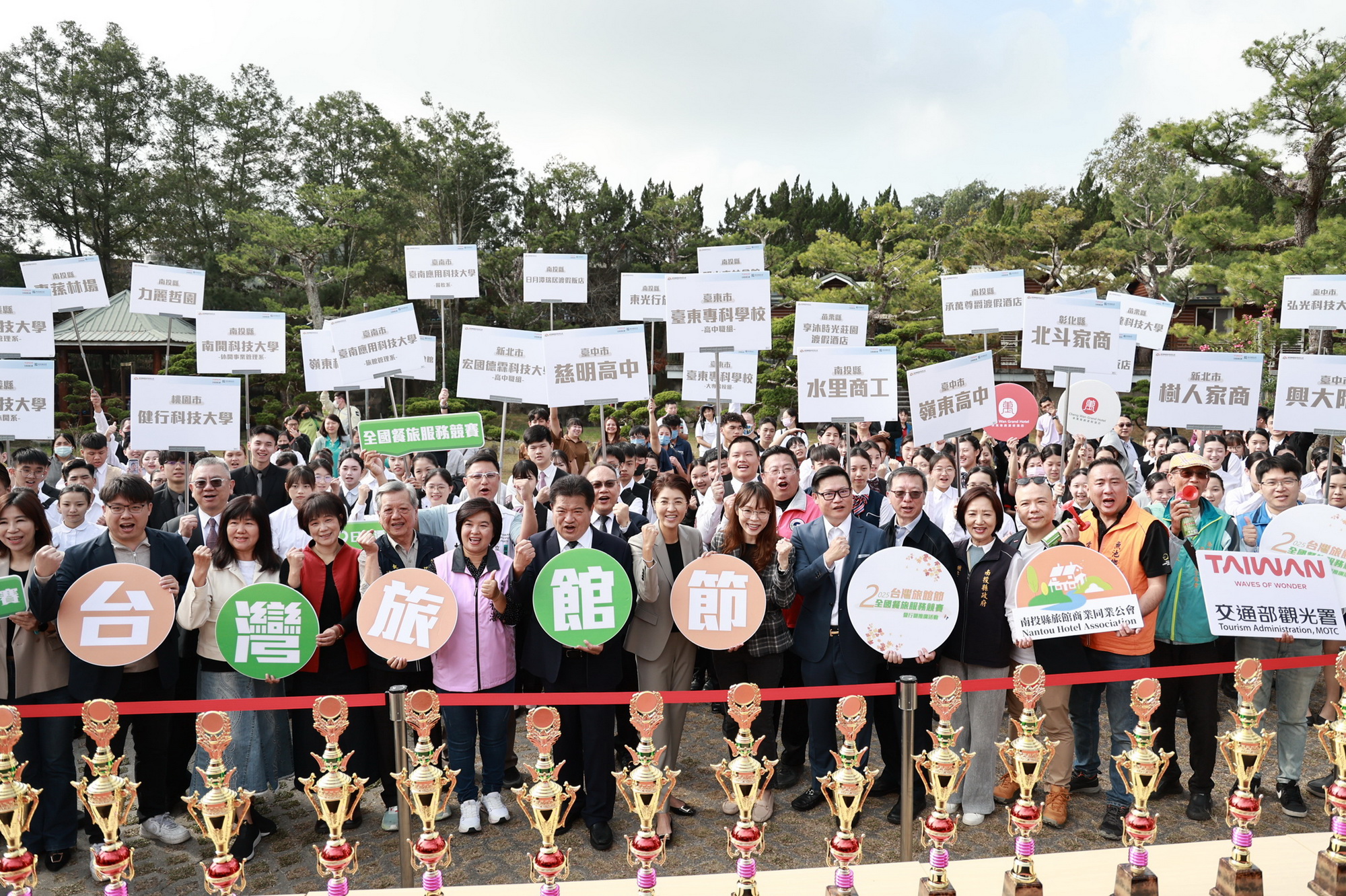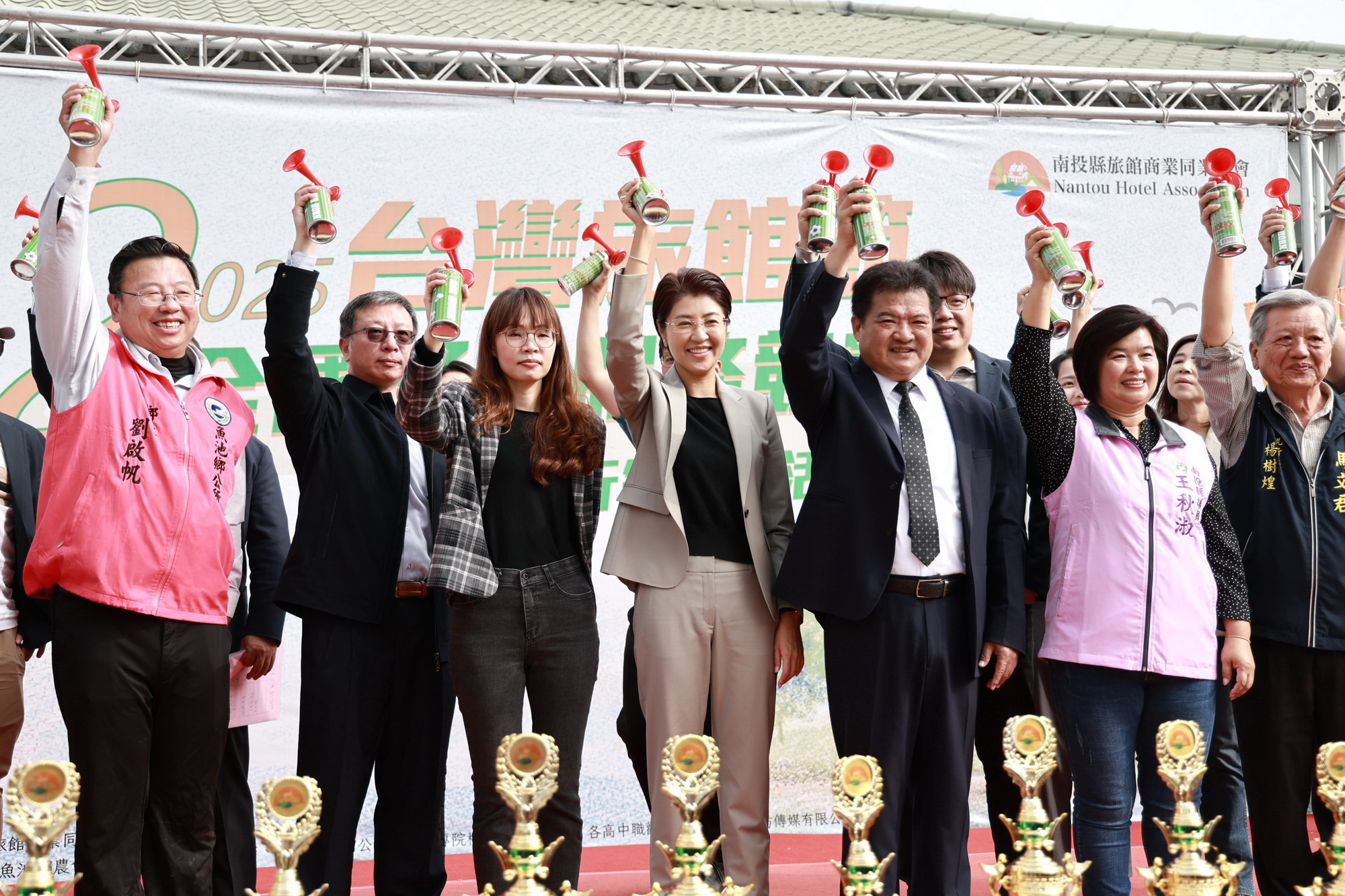 許縣長與南投縣旅館公會理事長李吉田、交通部觀光署旅宿組科長柯乃文、日月潭國家風景區管理處長柯建興、縣議員王秋淑、魚池鄉長劉啟帆等貴賓,共同啟動鳴笛,為活動開幕。