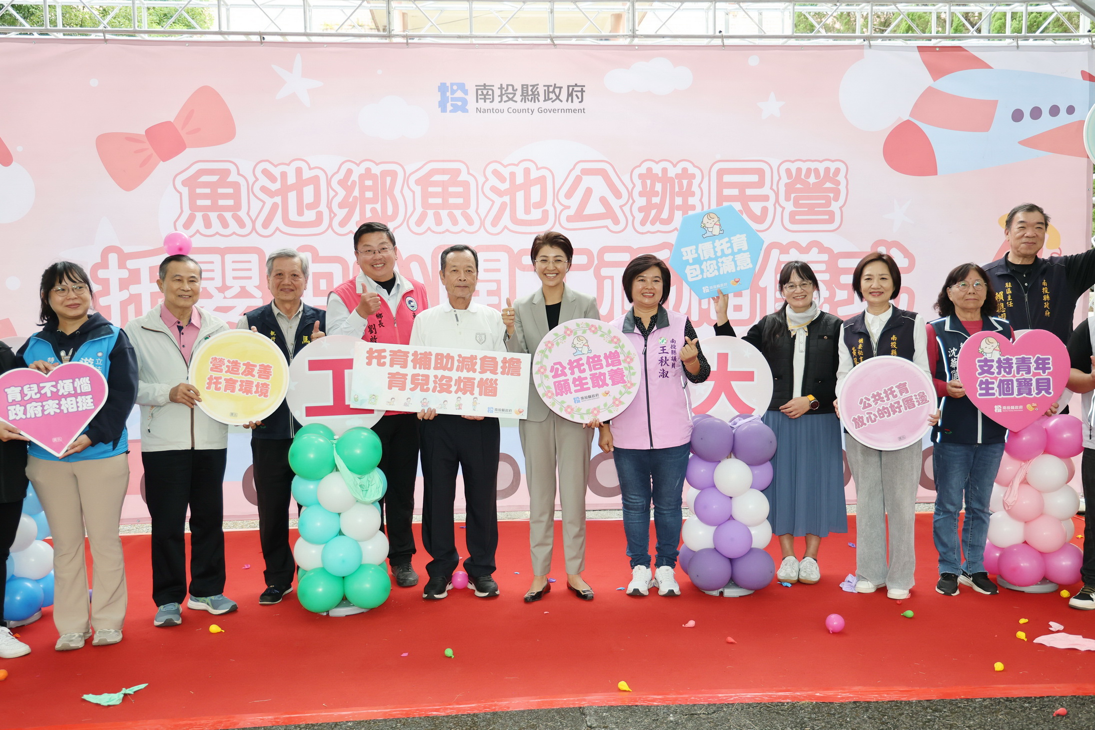 許縣長進一步表示,本縣托育機構已開辦數及可收托數:公辦民營托嬰中心5處110名,準公共托嬰中心3處133名,私立托嬰中心1處20名,共計9處263名,實際收托數236名。此次開工的托嬰中心位在魚池國中的校園裡,是「孩子成長最棒的場所」,環境安全、寧靜、綠意盎然,家長一看到就安心,這樣的場域正是我們希望提供給孩子的成長起點。預計在116年1月開幕,提供24名嬰幼兒接受專業照顧,家長也能安心工作,讓家庭與地方發展形成正向循環。未來托嬰中心啟用後,不只大幅提升地方托育量能,家長也能安心工作,「生活、育兒、職場」三方都能兼顧,形成鄉鎮最美的良性循環。