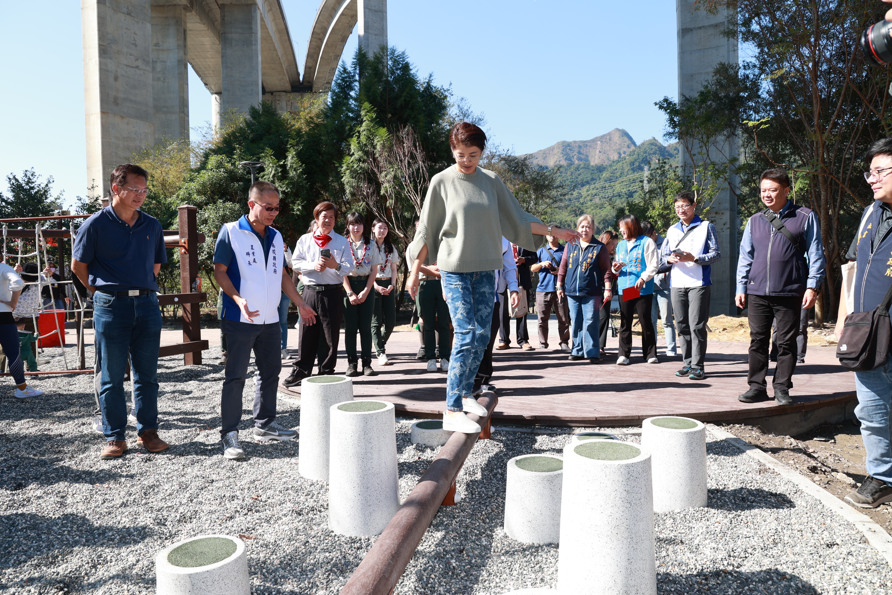 許縣長致詞表示,林明溱前縣長推動橋聳雲天綠雕園區,她到任縣府繼續建設,如今園區不僅保留原有綠雕藝術特色,更新增分齡遊戲場,有「13歲以上山訓挑戰區」及「5至12歲兒童遊戲區」,讓不同年齡層都能在安全前提下盡情體驗冒險與樂趣。
