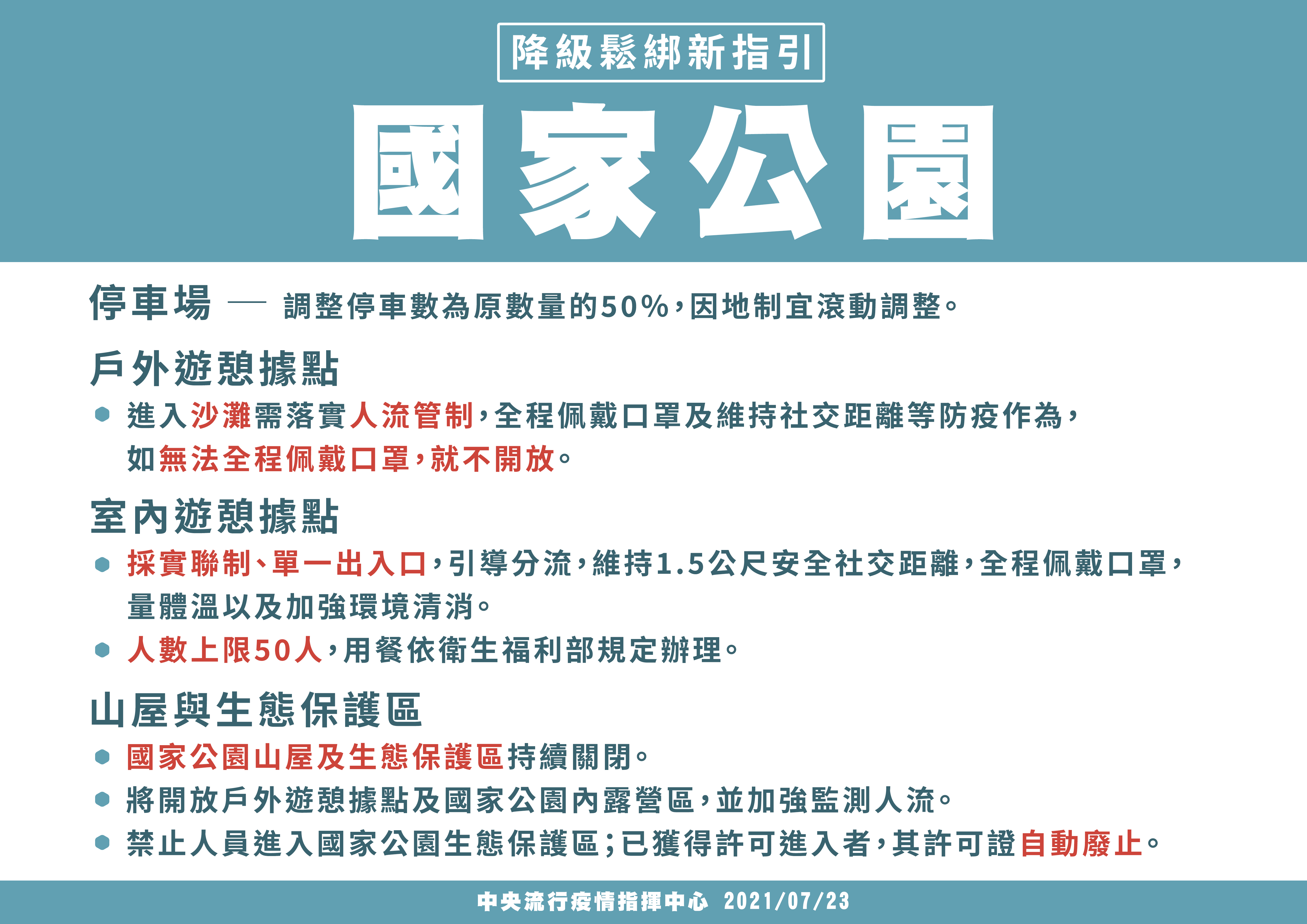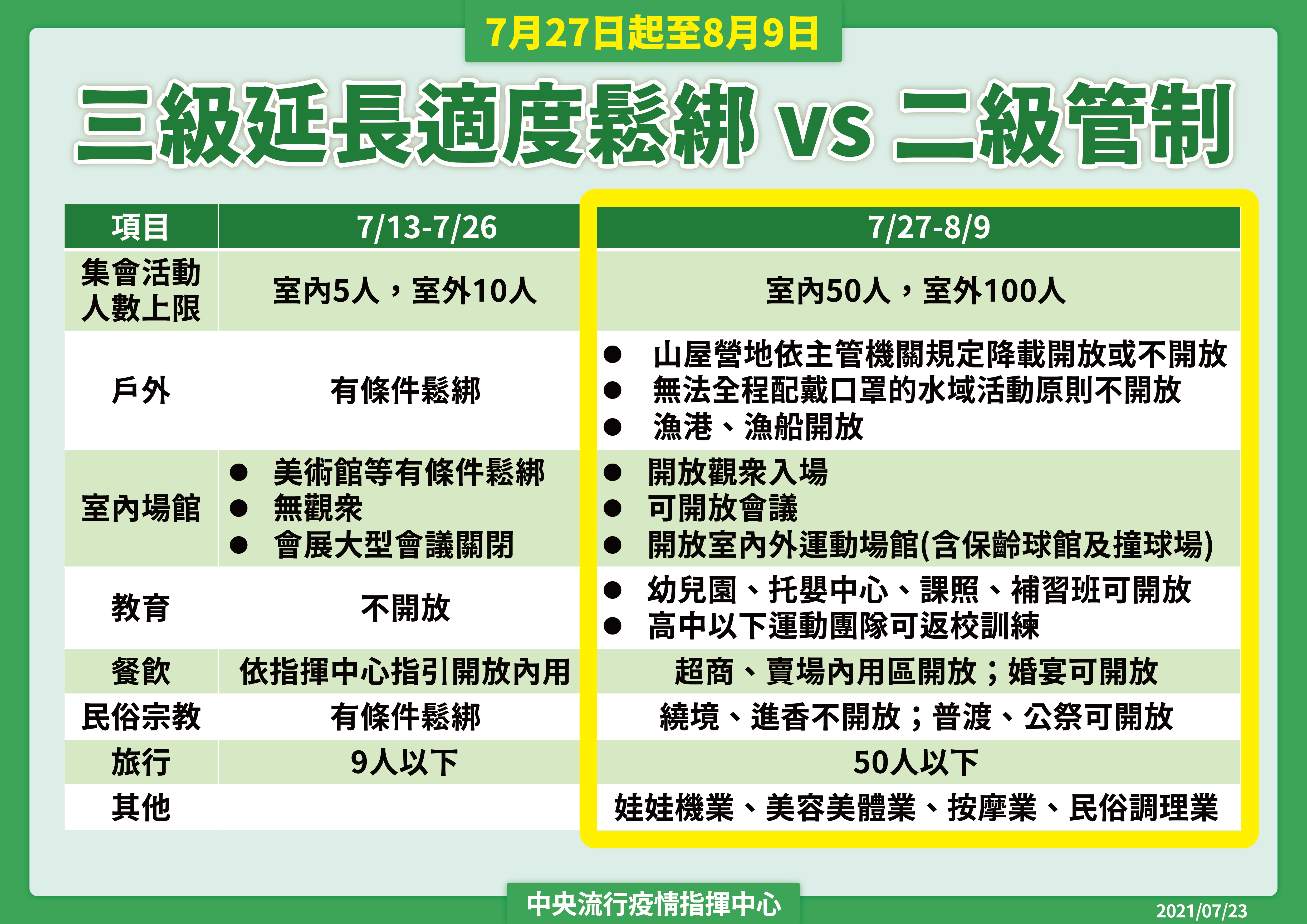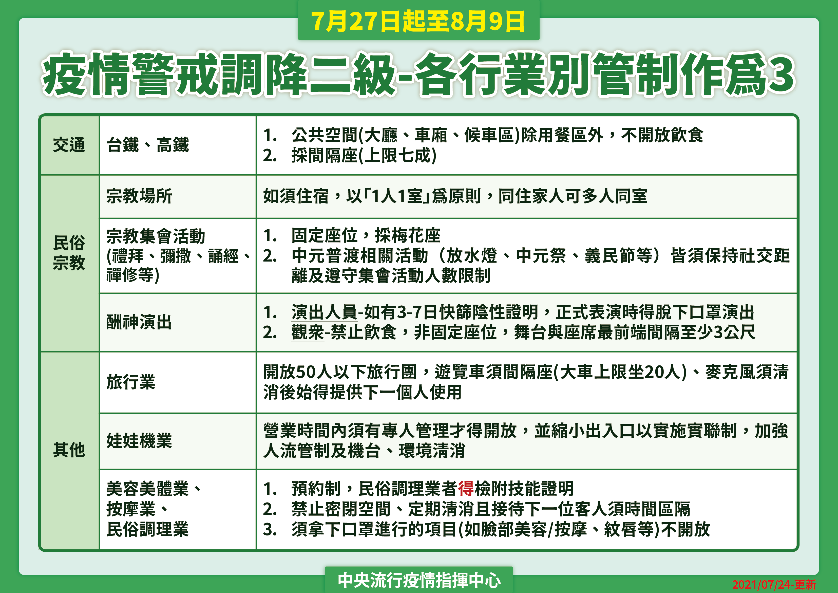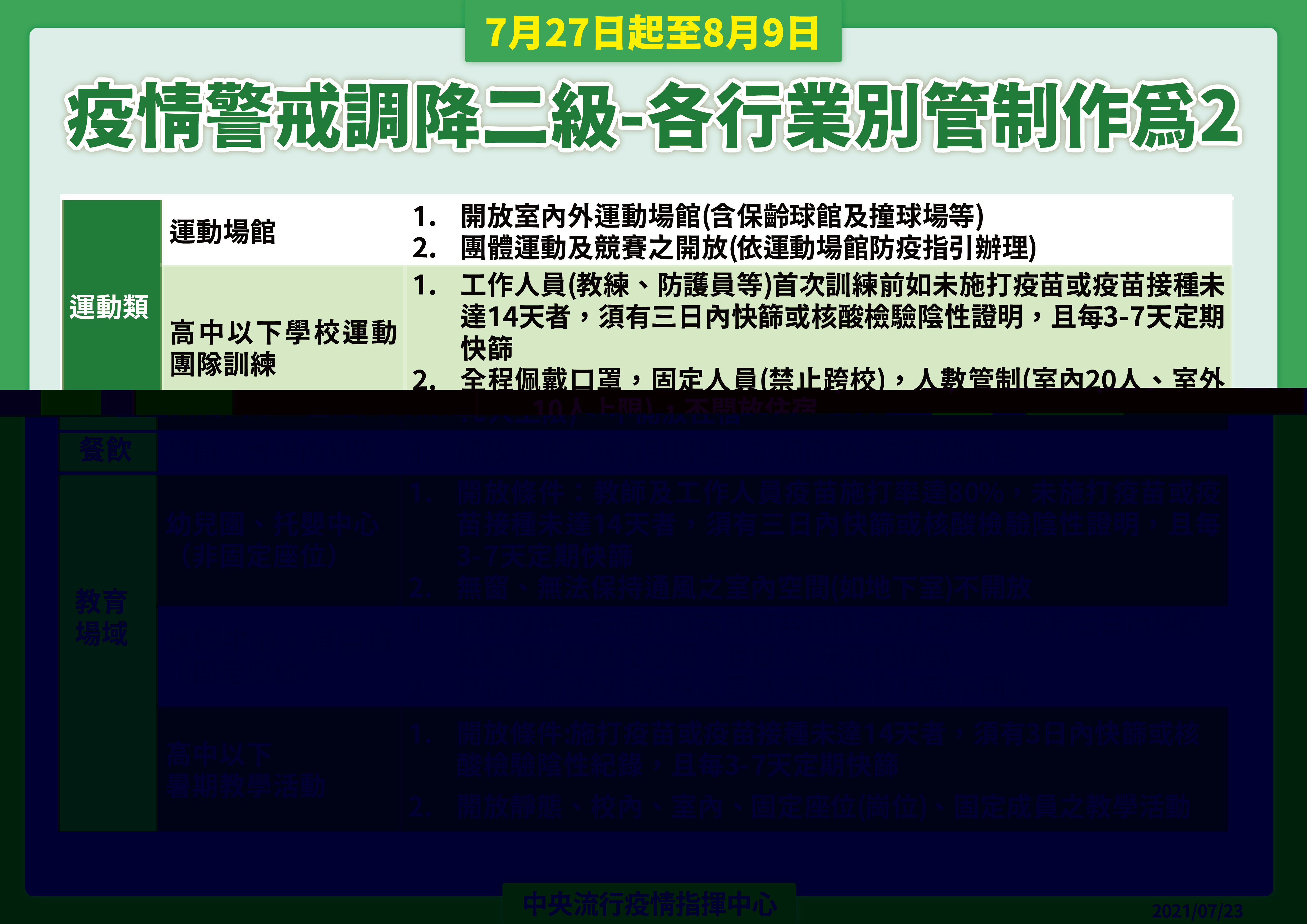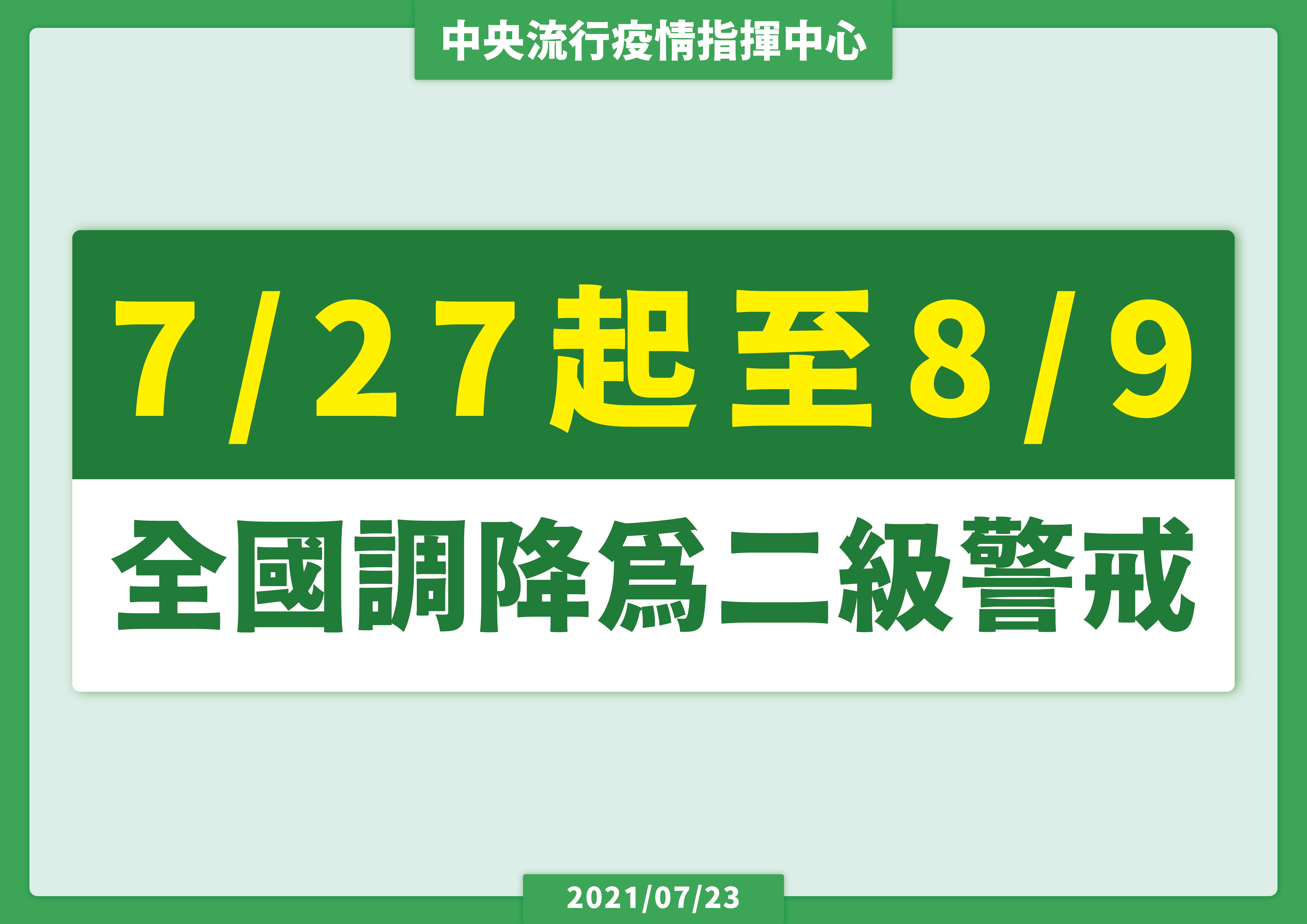 防疫宣傳 居家照護關懷手冊 防疫補助 勞工紓困 農漁畜牧 觀光紓困 企業紓困 租稅紓困 藝文紓困 中央各部會防疫專區 首頁 防疫宣傳 7/27至8/9全國... 7/27至8/9全國調降為二級警戒 各項措施 公佈單位:新聞及行政處 發佈日期:110/7/25