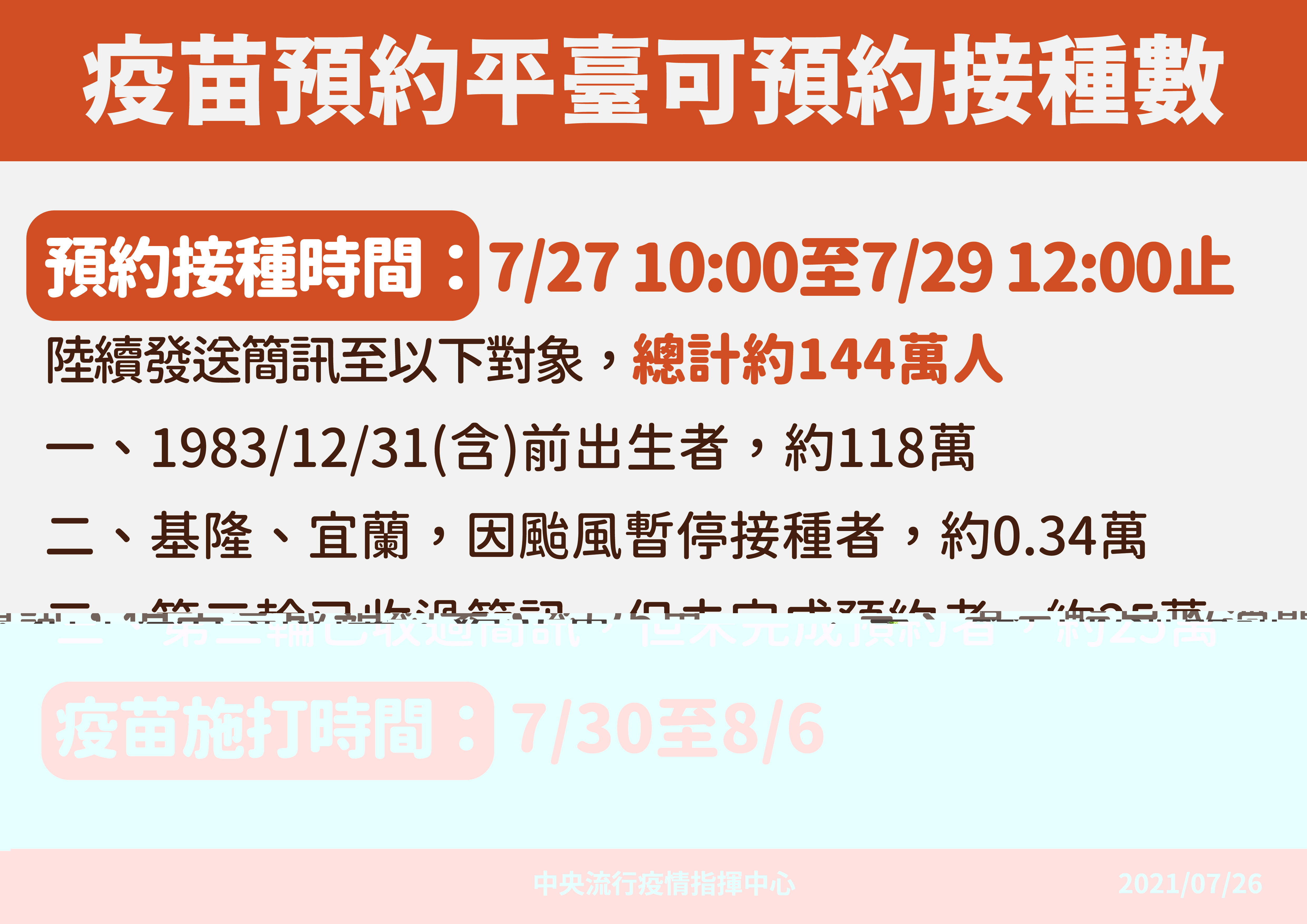 防疫宣傳 居家照護關懷手冊 防疫補助 勞工紓困 農漁畜牧 觀光紓困 企業紓困 租稅紓困 藝文紓困 中央各部會防疫專區 首頁 防疫宣傳 疫苗預約平臺可預約接... 疫苗預約平臺可預約接種數 公佈單位:新聞及行政處 發佈日期:110/7/26