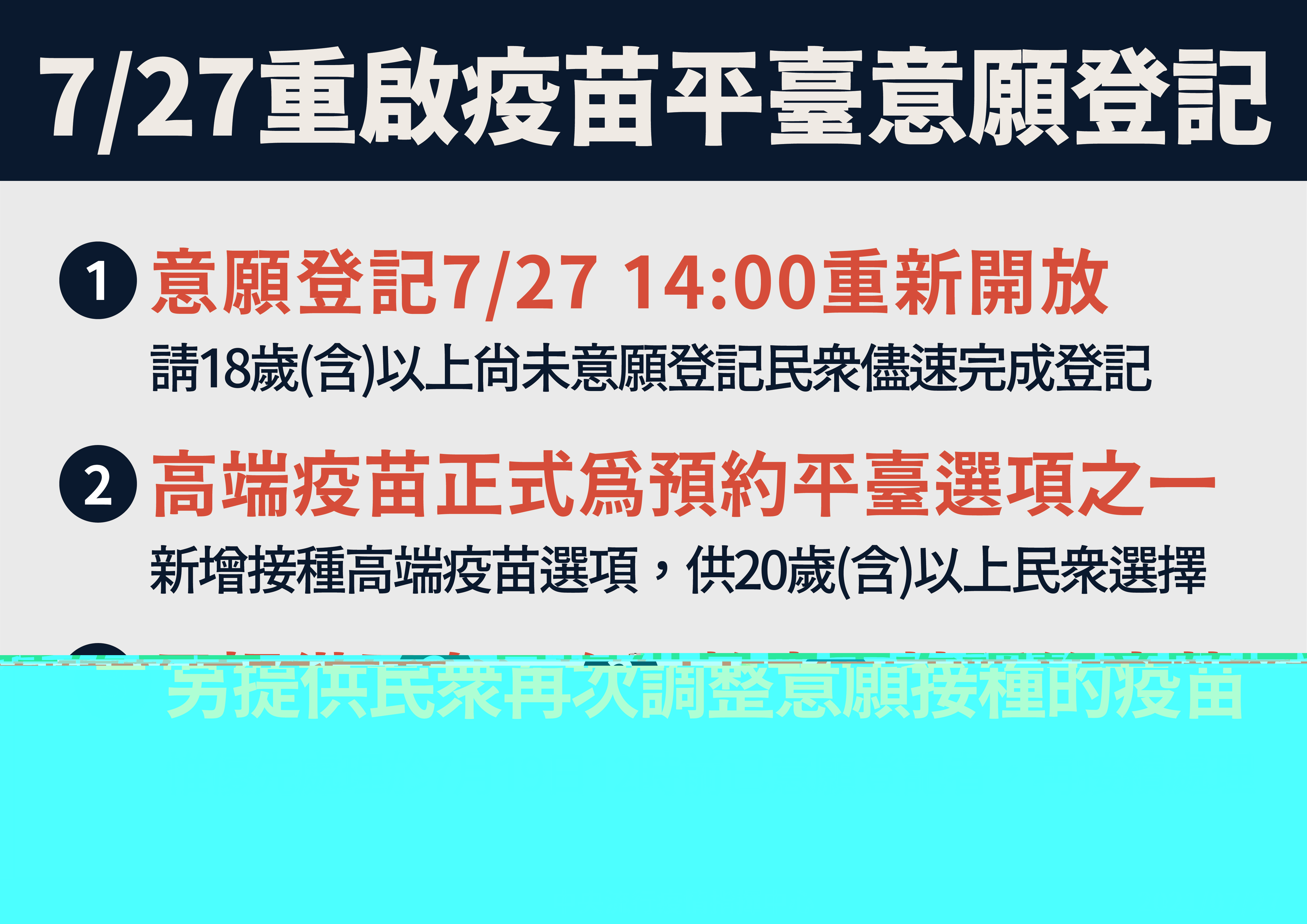 防疫宣傳 居家照護關懷手冊 防疫補助 勞工紓困 農漁畜牧 觀光紓困 企業紓困 租稅紓困 藝文紓困 中央各部會防疫專區 首頁 防疫宣傳 7月27日重啟疫苗平... 7月27日重啟疫苗平臺意願登記 公佈單位:新聞及行政處 發佈日期:110/7/27