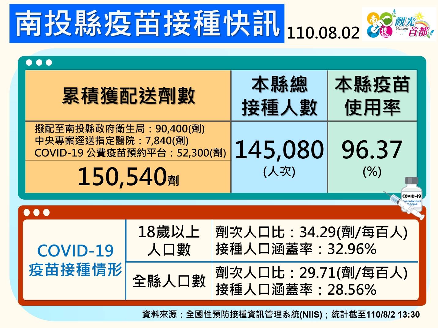 防疫宣傳 居家照護關懷手冊 防疫補助 勞工紓困 農漁畜牧 觀光紓困 企業紓困 租稅紓困 藝文紓困 中央各部會防疫專區 首頁 防疫宣傳 南投縣8月2日疫苗接... 南投縣8月2日疫苗接種快訊 公佈單位:新聞及行政處 發佈日期:110/8/3