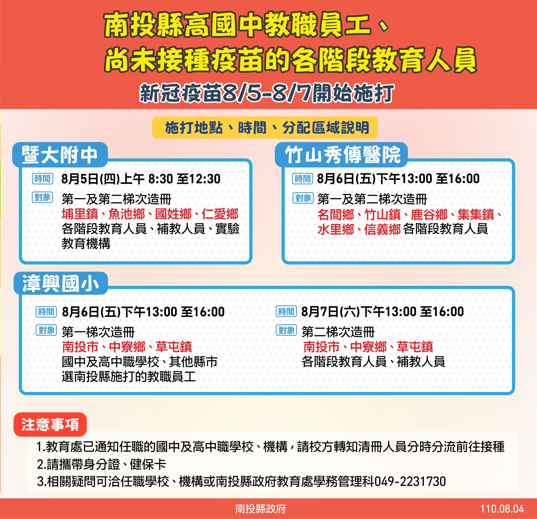 防疫宣傳 居家照護關懷手冊 防疫補助 勞工紓困 農漁畜牧 觀光紓困 企業紓困 租稅紓困 藝文紓困 中央各部會防疫專區 首頁 防疫宣傳 南投縣高國中教職員工... 南投縣高國中教職員工8月5日起新冠肺炎疫苗開打 公佈單位:新聞及行政處 發佈日期:110/8/4