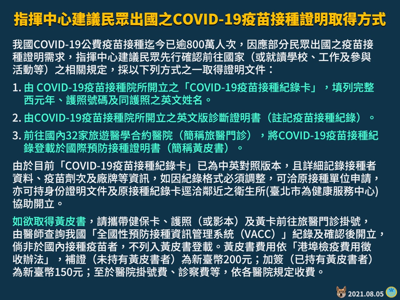 防疫宣傳 居家照護關懷手冊 防疫補助 勞工紓困 農漁畜牧 觀光紓困 企業紓困 租稅紓困 藝文紓困 中央各部會防疫專區 首頁 防疫宣傳 中央疫情指揮中心建議... 中央疫情指揮中心建議民眾出國之COVID-19疫苗接種說明取得方式 公佈單位:新聞及行政處 發佈日期:110/8/6