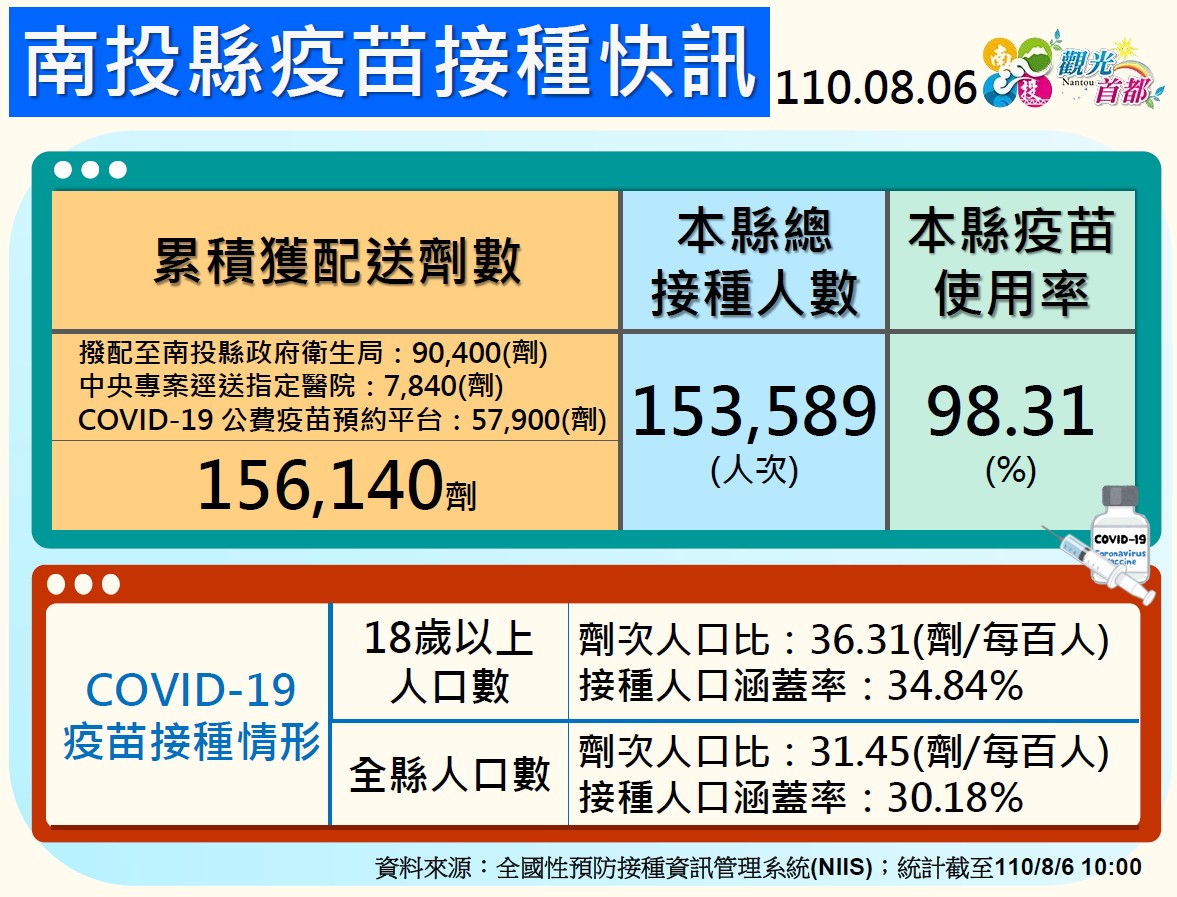 防疫宣傳 居家照護關懷手冊 防疫補助 勞工紓困 農漁畜牧 觀光紓困 企業紓困 租稅紓困 藝文紓困 中央各部會防疫專區 首頁 防疫宣傳 南投縣8月6日疫苗接... 南投縣8月6日疫苗接種快訊 公佈單位:新聞及行政處 發佈日期:110/8/6