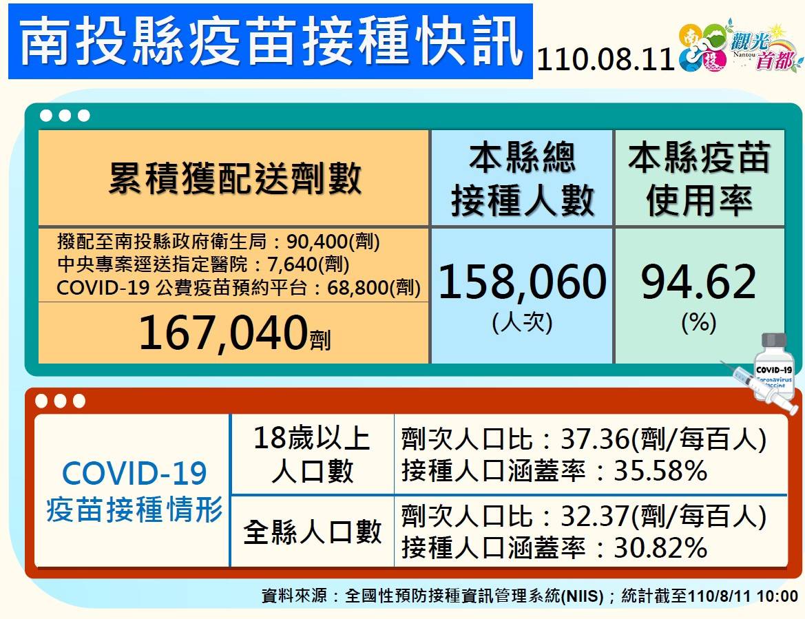 防疫宣傳 居家照護關懷手冊 防疫補助 勞工紓困 農漁畜牧 觀光紓困 企業紓困 租稅紓困 藝文紓困 中央各部會防疫專區 首頁 防疫宣傳 南投縣8月11日疫苗... 南投縣8月11日疫苗接種快訊 公佈單位:新聞及行政處 發佈日期:110/8/11