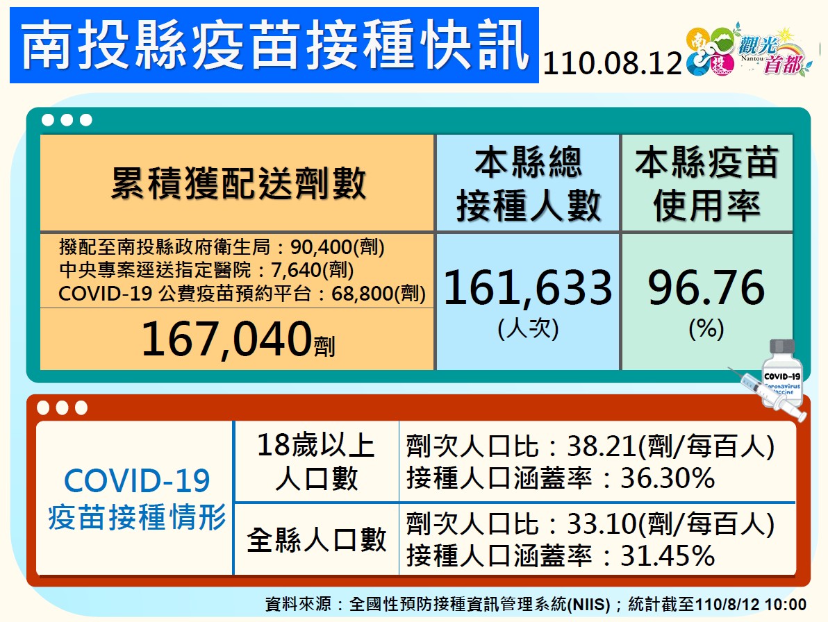 防疫宣傳 居家照護關懷手冊 防疫補助 勞工紓困 農漁畜牧 觀光紓困 企業紓困 租稅紓困 藝文紓困 中央各部會防疫專區 首頁 防疫宣傳 南投縣8月12日疫苗... 南投縣8月12日疫苗接種快訊 公佈單位:新聞及行政處 發佈日期:110/8/13