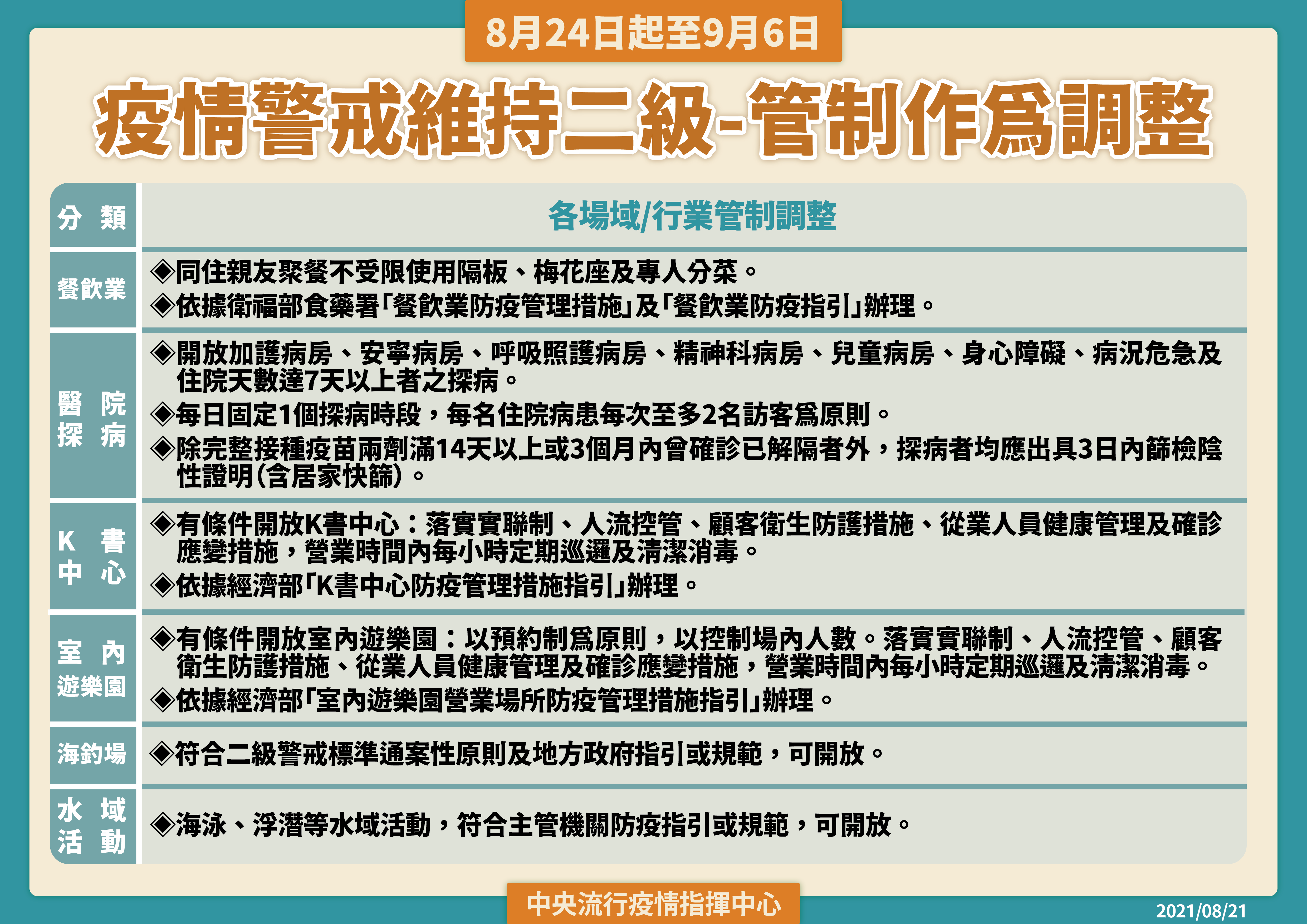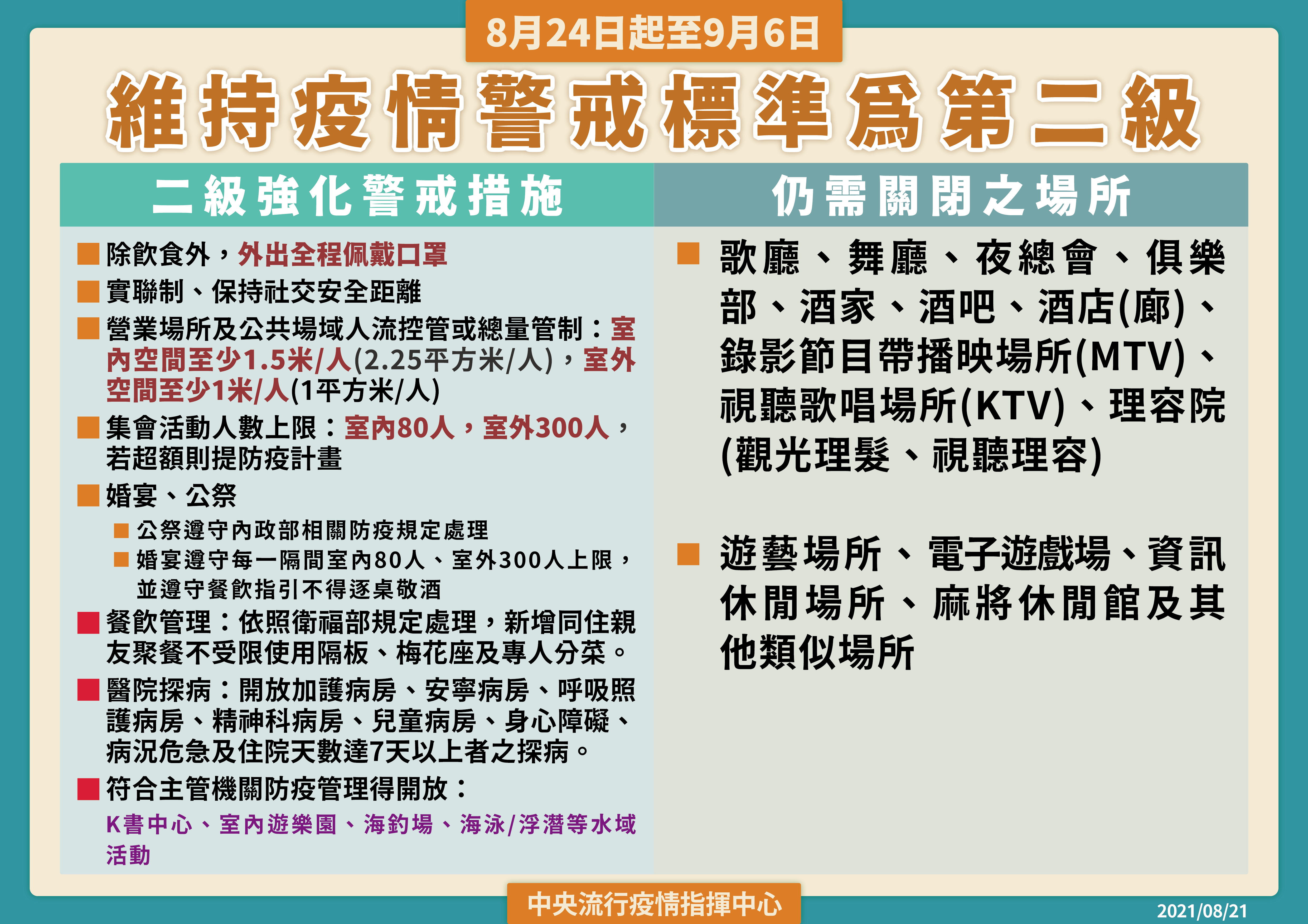 防疫宣傳 居家照護關懷手冊 防疫補助 勞工紓困 農漁畜牧 觀光紓困 企業紓困 租稅紓困 藝文紓困 中央各部會防疫專區 首頁 防疫宣傳 8月24日起至9月6... 8月24日起至9月6日疫情警戒維持二級管制措施 公佈單位:新聞及行政處 發佈日期:110/8/23