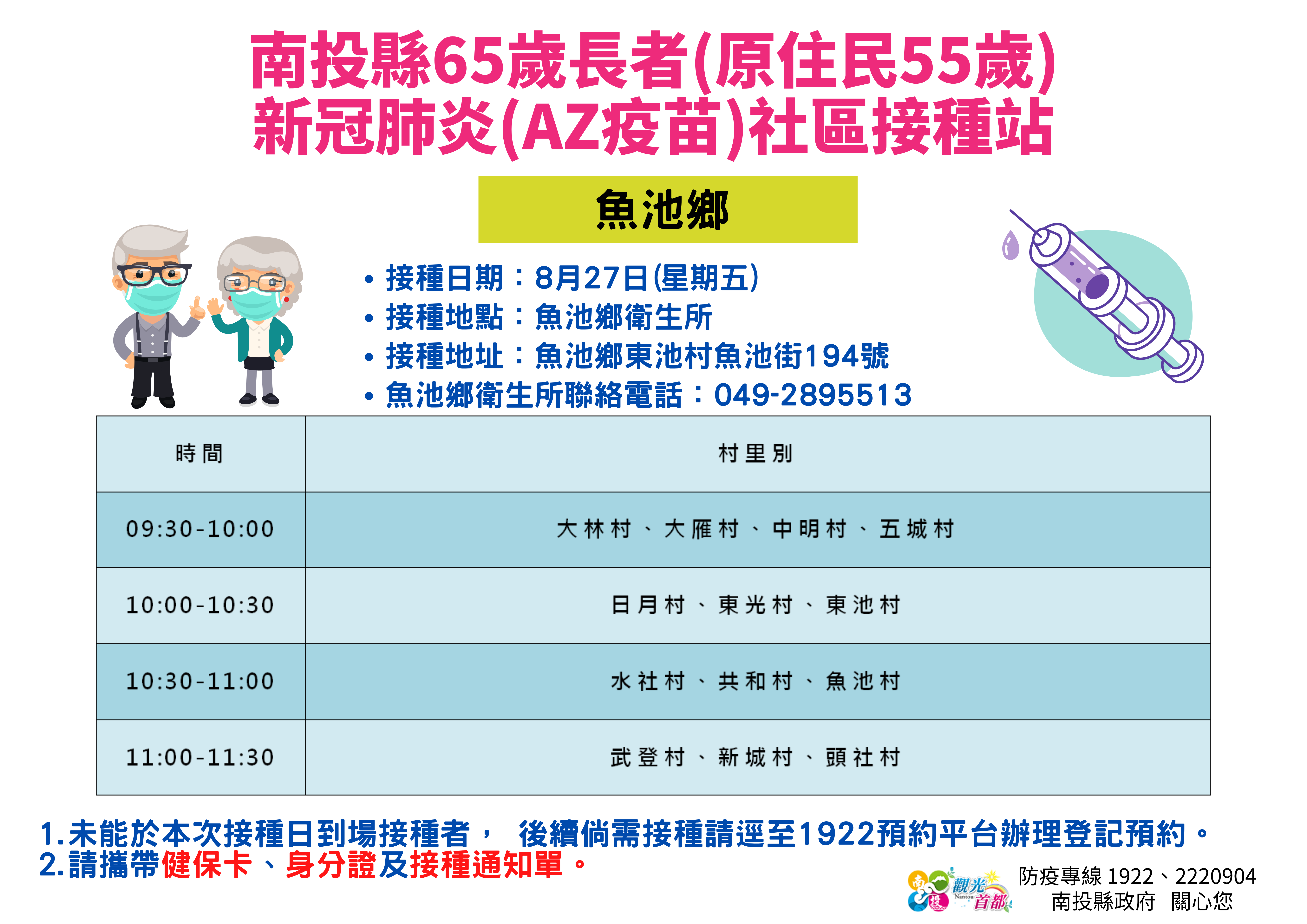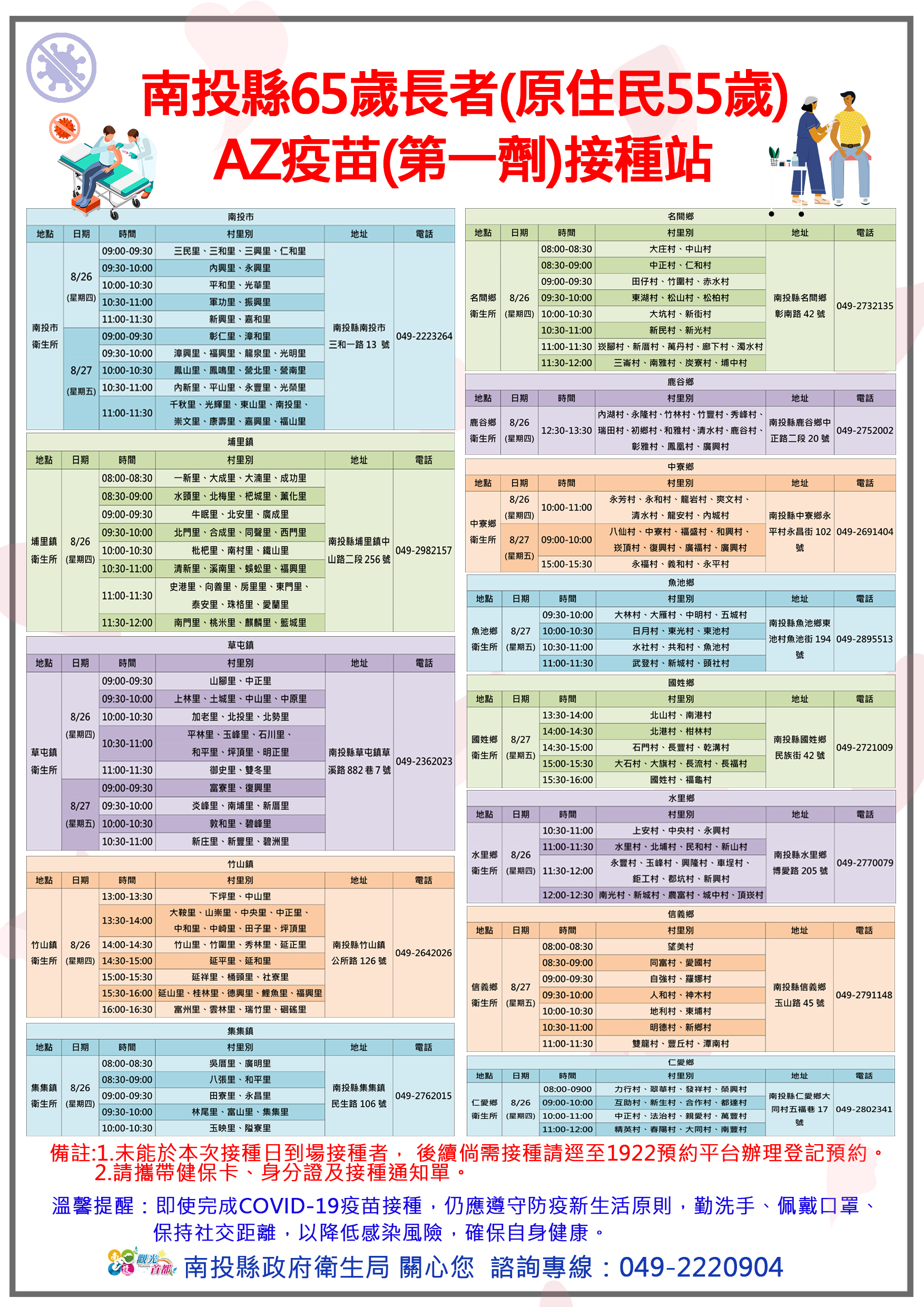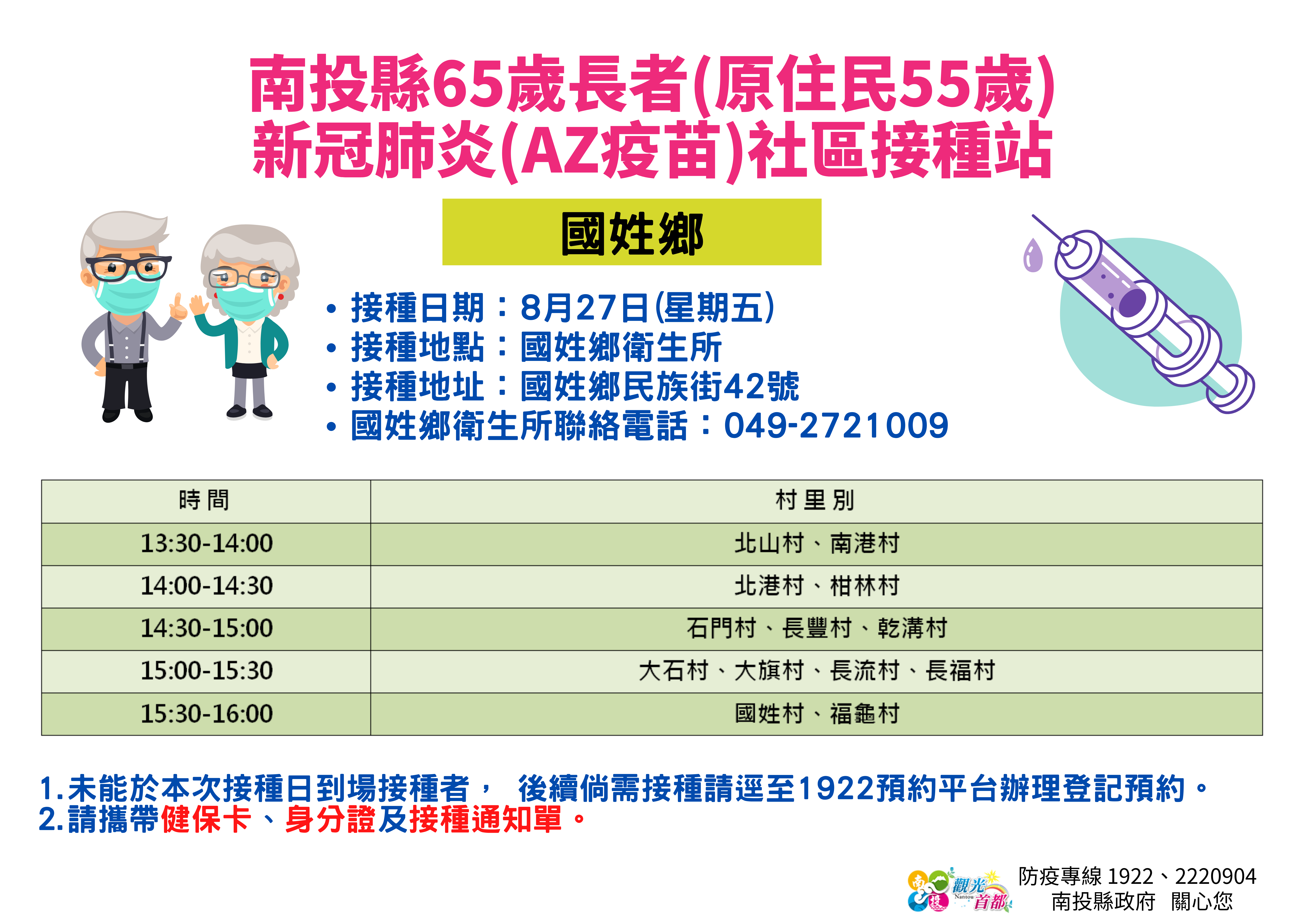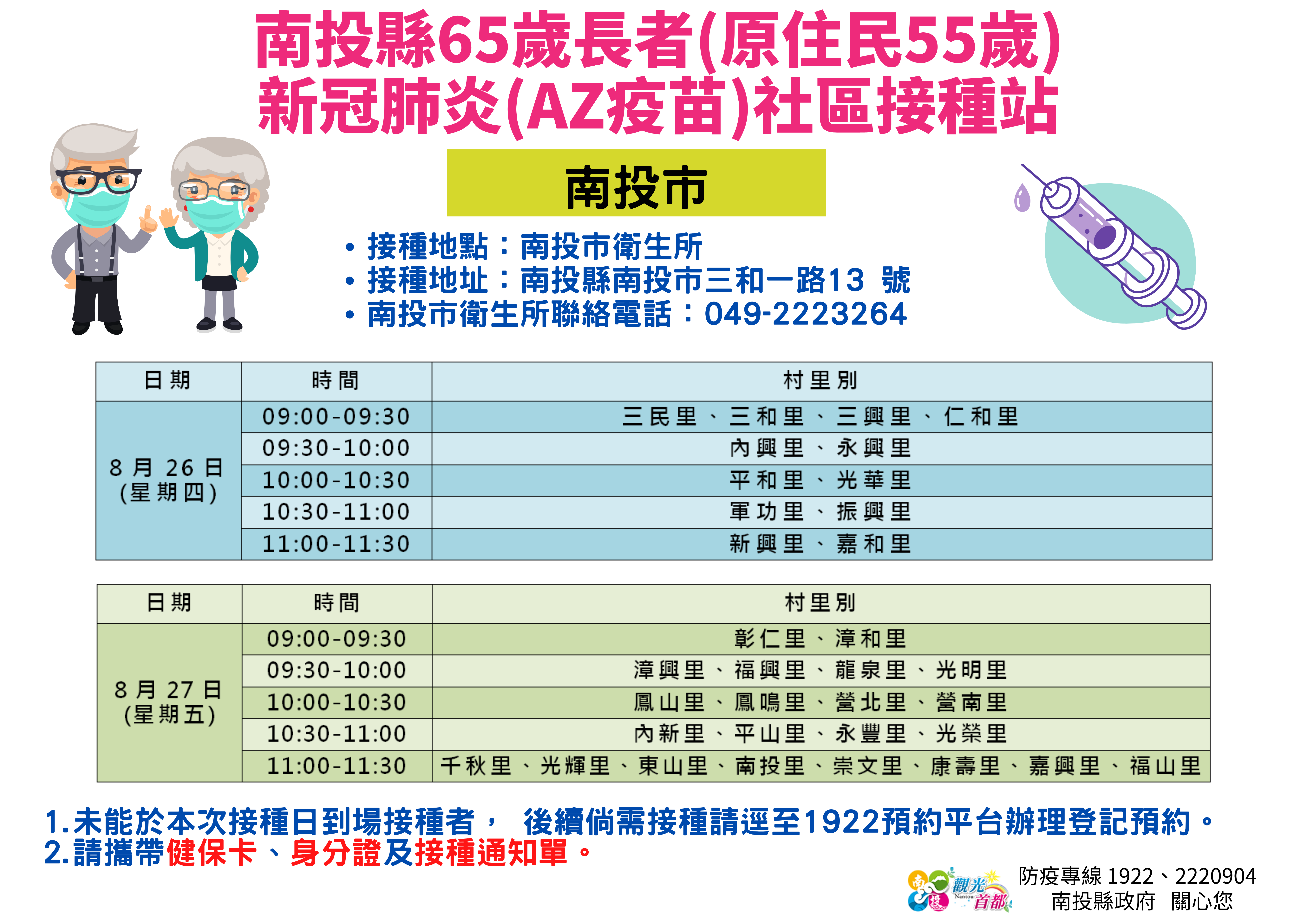 防疫宣傳 居家照護關懷手冊 防疫補助 勞工紓困 農漁畜牧 觀光紓困 企業紓困 租稅紓困 藝文紓困 中央各部會防疫專區 首頁 防疫宣傳 8月26~27日南投... 8月26~27日南投縣65歲長者(原住民55歲)新冠肺炎(AZ疫苗)社區接種站資訊 公佈單位:新聞及行政處 發佈日期:110/8/24