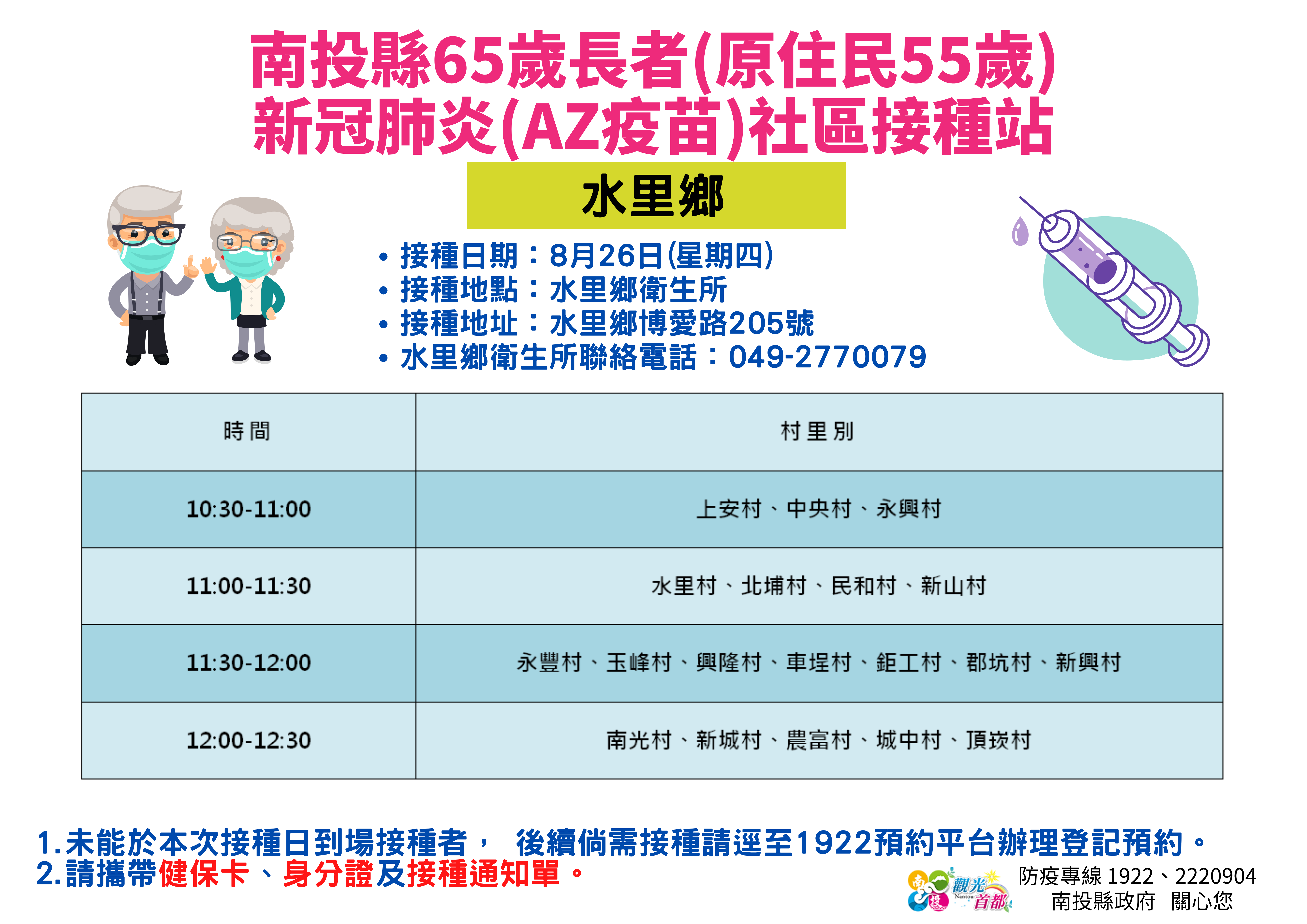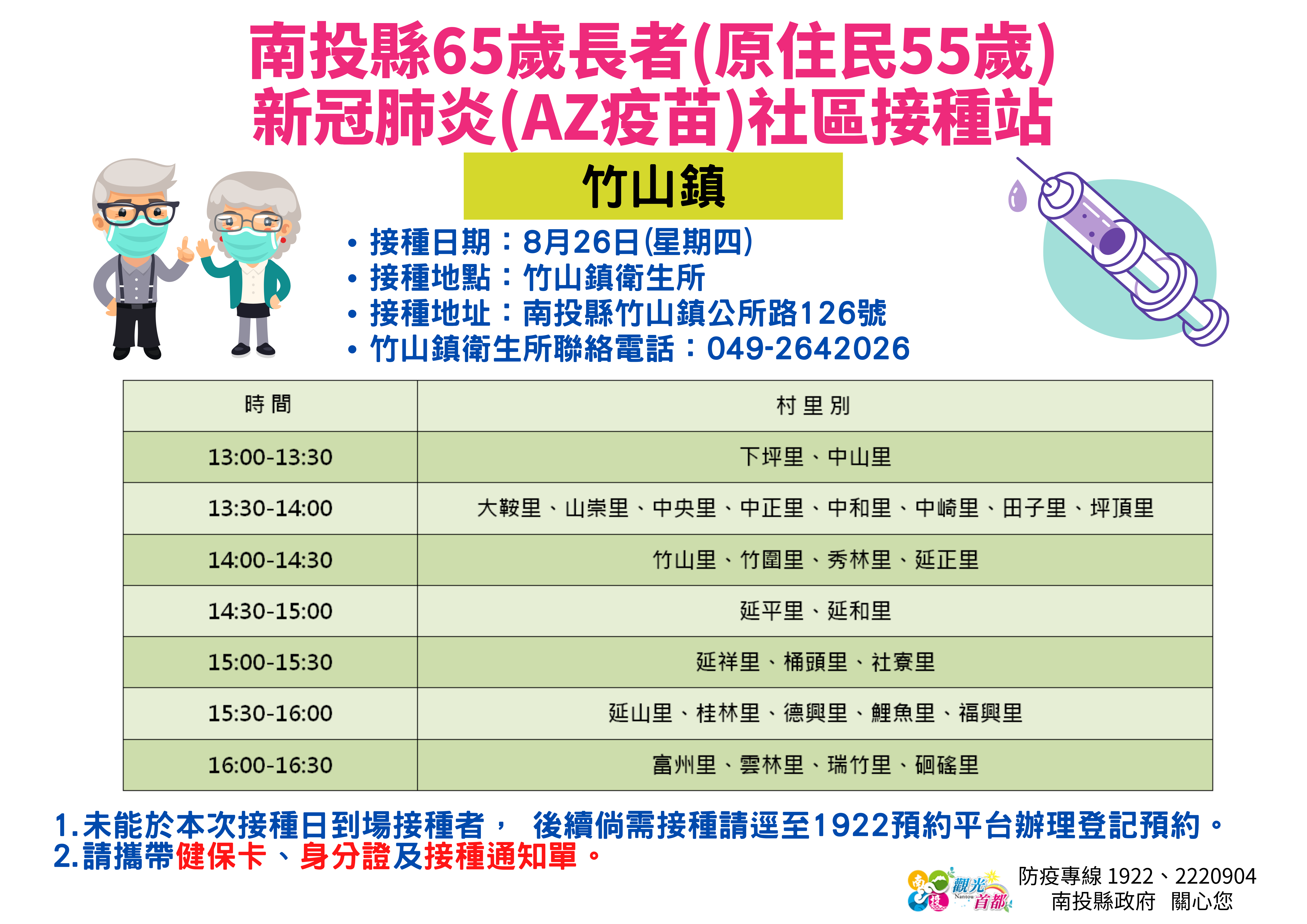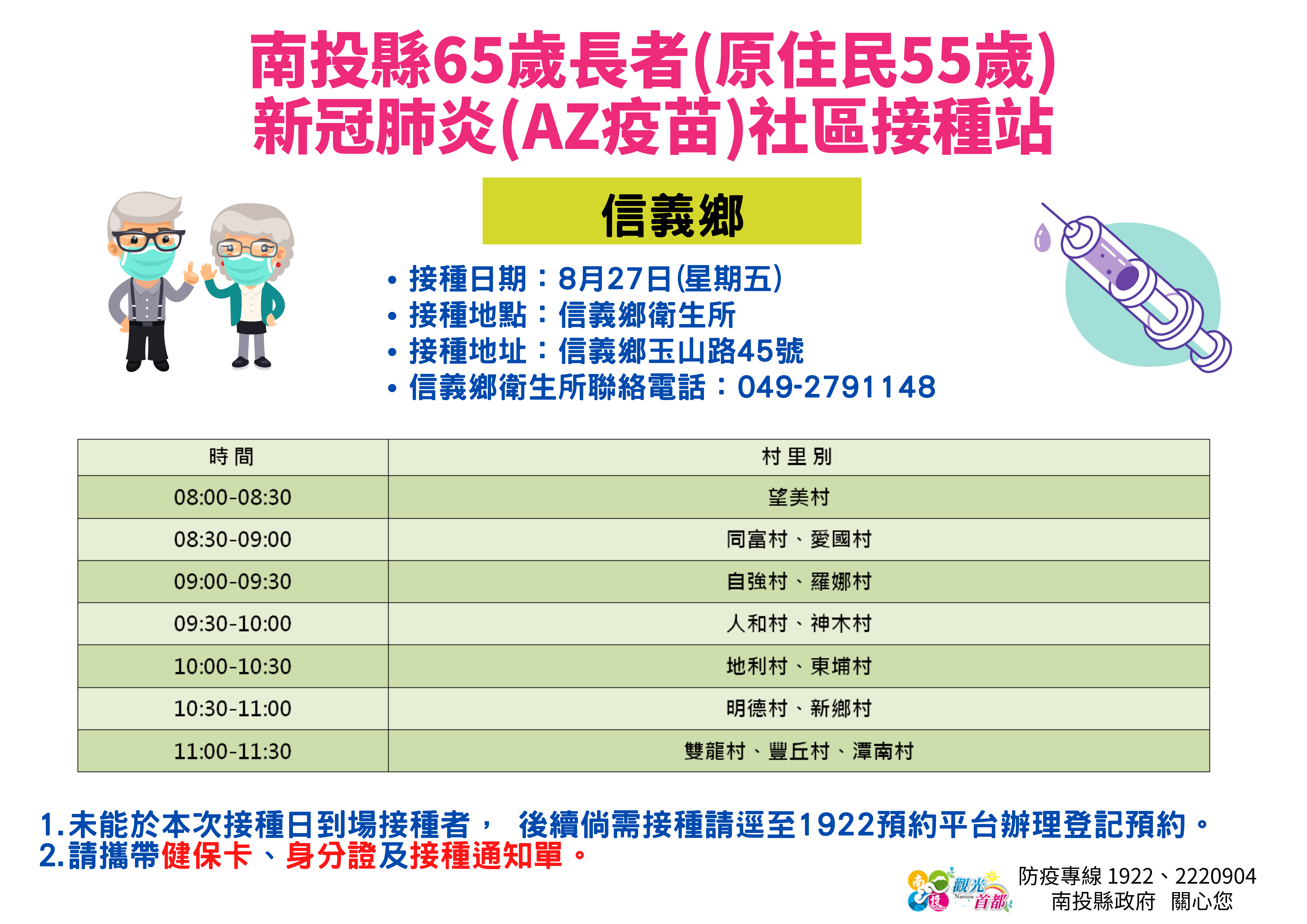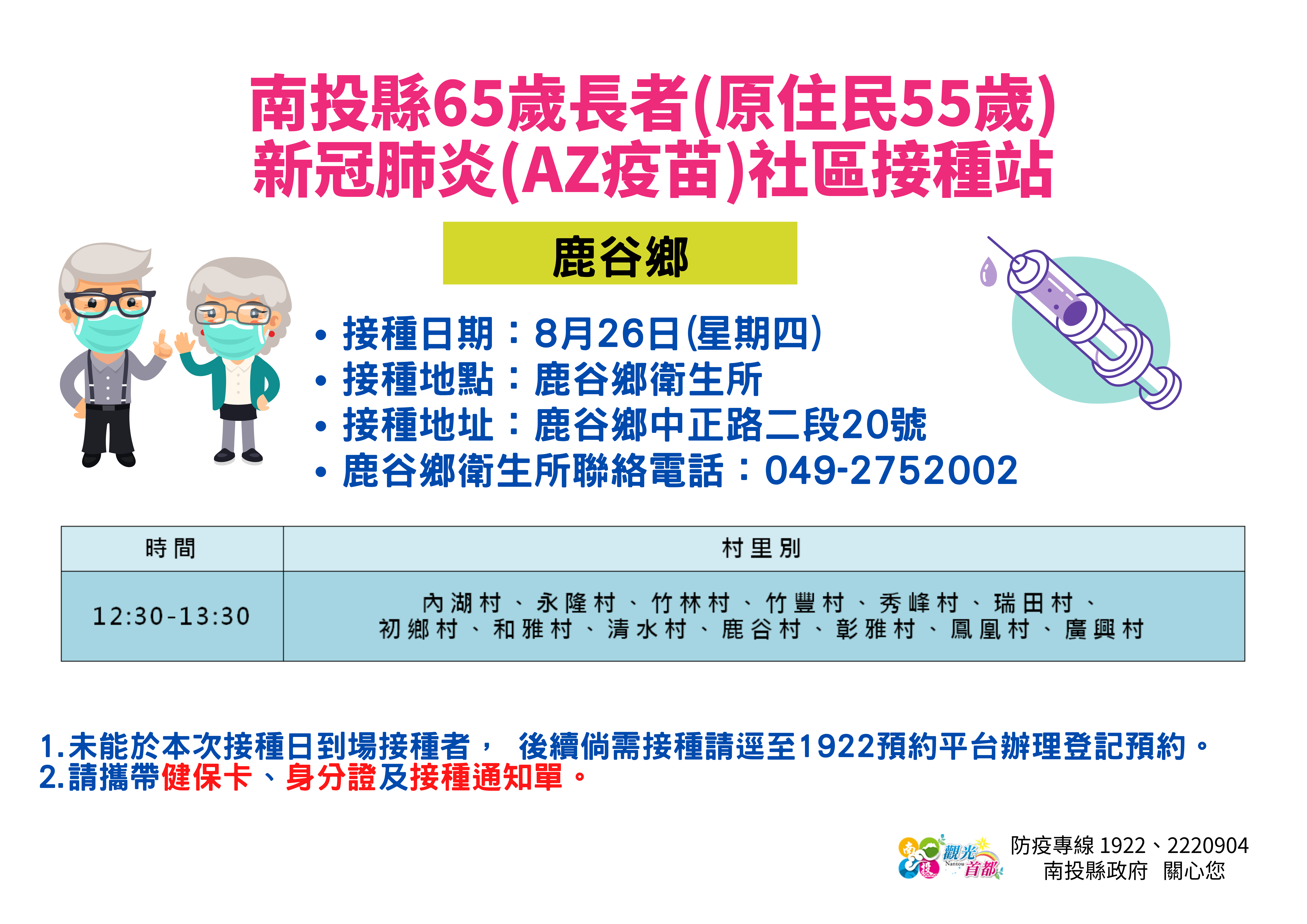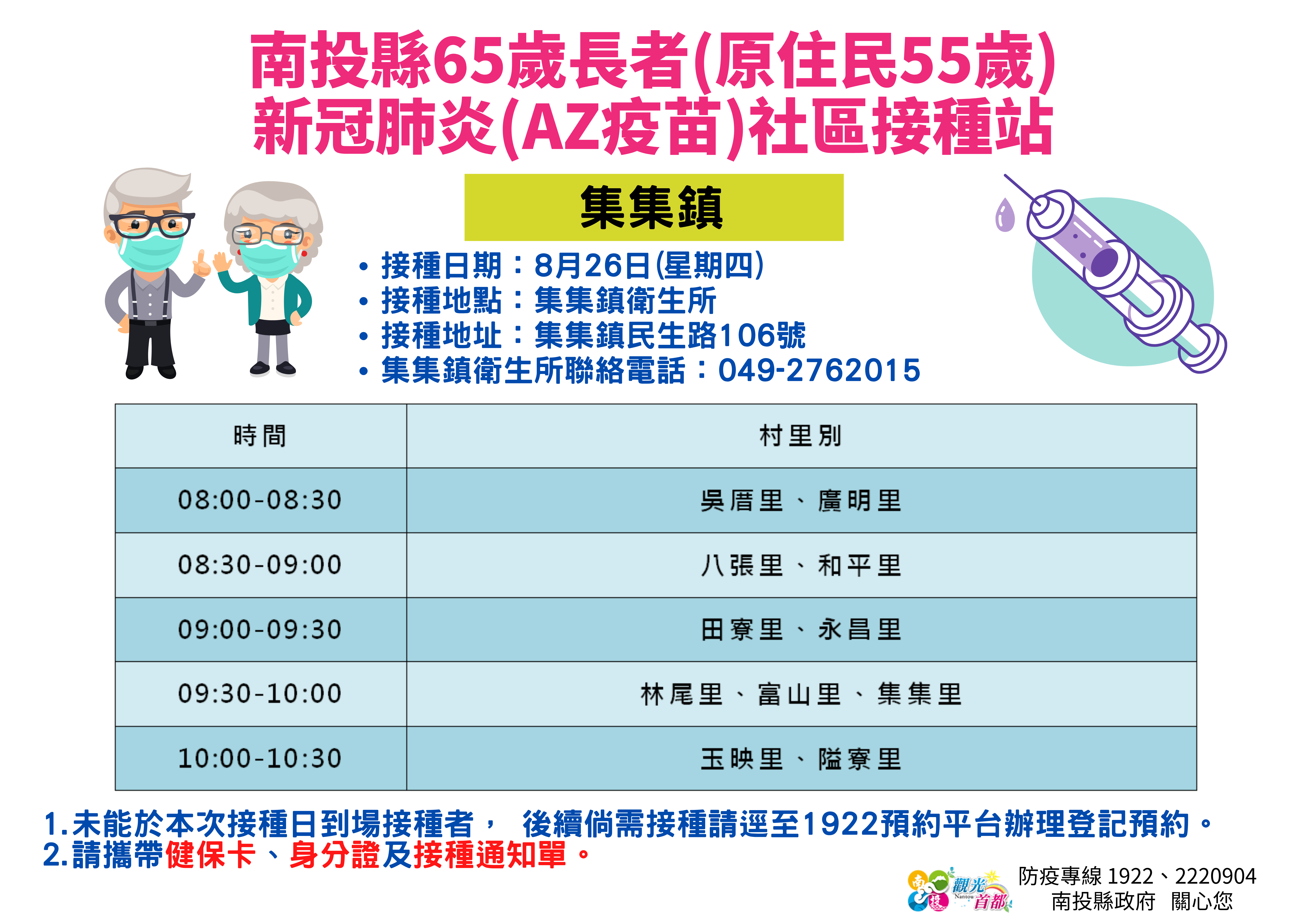 防疫宣傳 居家照護關懷手冊 防疫補助 勞工紓困 農漁畜牧 觀光紓困 企業紓困 租稅紓困 藝文紓困 中央各部會防疫專區 首頁 防疫宣傳 8月26~27日南投... 8月26~27日南投縣65歲長者(原住民55歲)新冠肺炎(AZ疫苗)社區接種站資訊 公佈單位:新聞及行政處 發佈日期:110/8/24