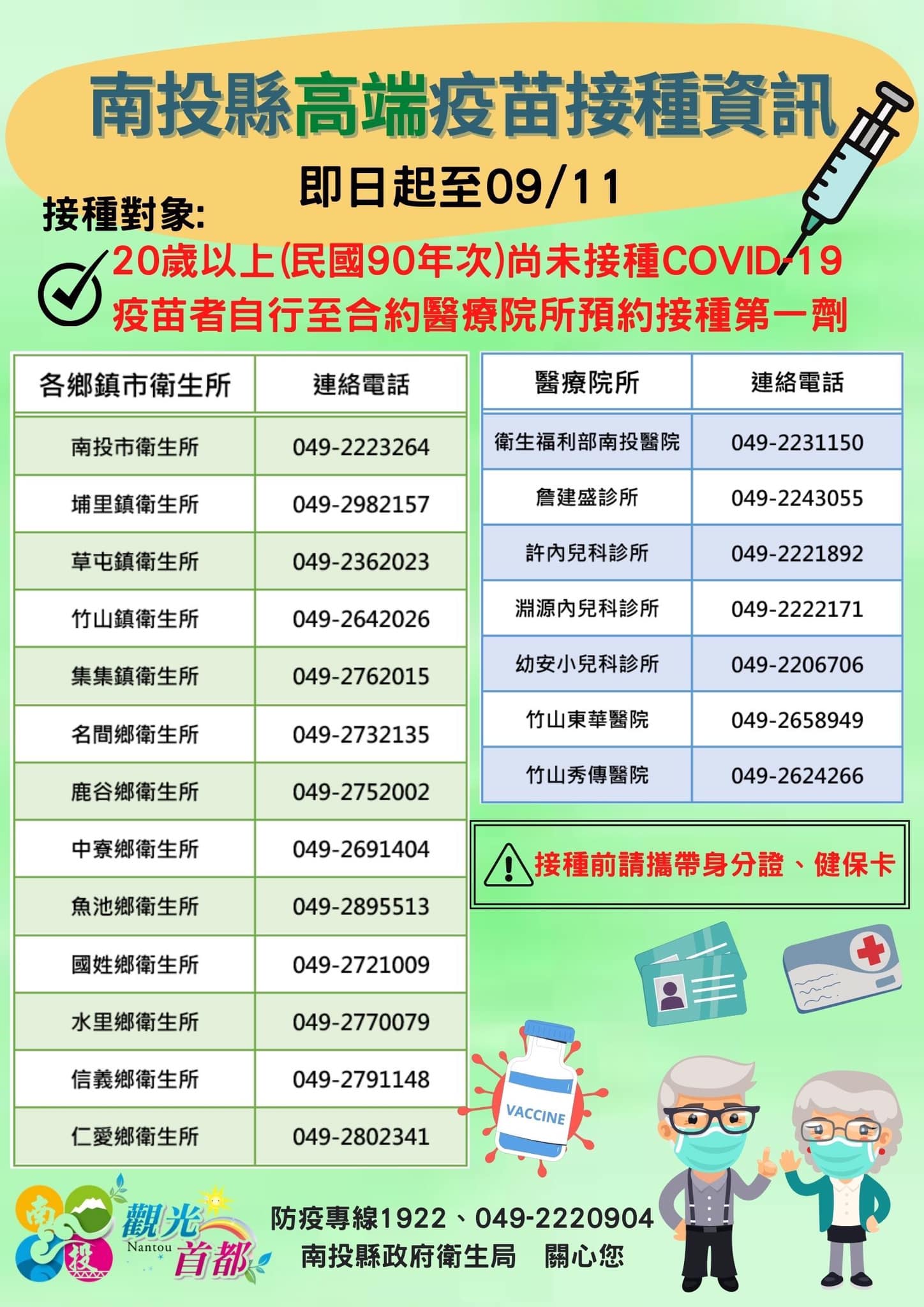 防疫宣傳 居家照護關懷手冊 防疫補助 勞工紓困 農漁畜牧 觀光紓困 企業紓困 租稅紓困 藝文紓困 中央各部會防疫專區 首頁 防疫宣傳 即日起至9月11日南... 即日起至9月11日南投縣高端疫苗接種資訊 公佈單位:新聞及行政處 發佈日期:110/9/7