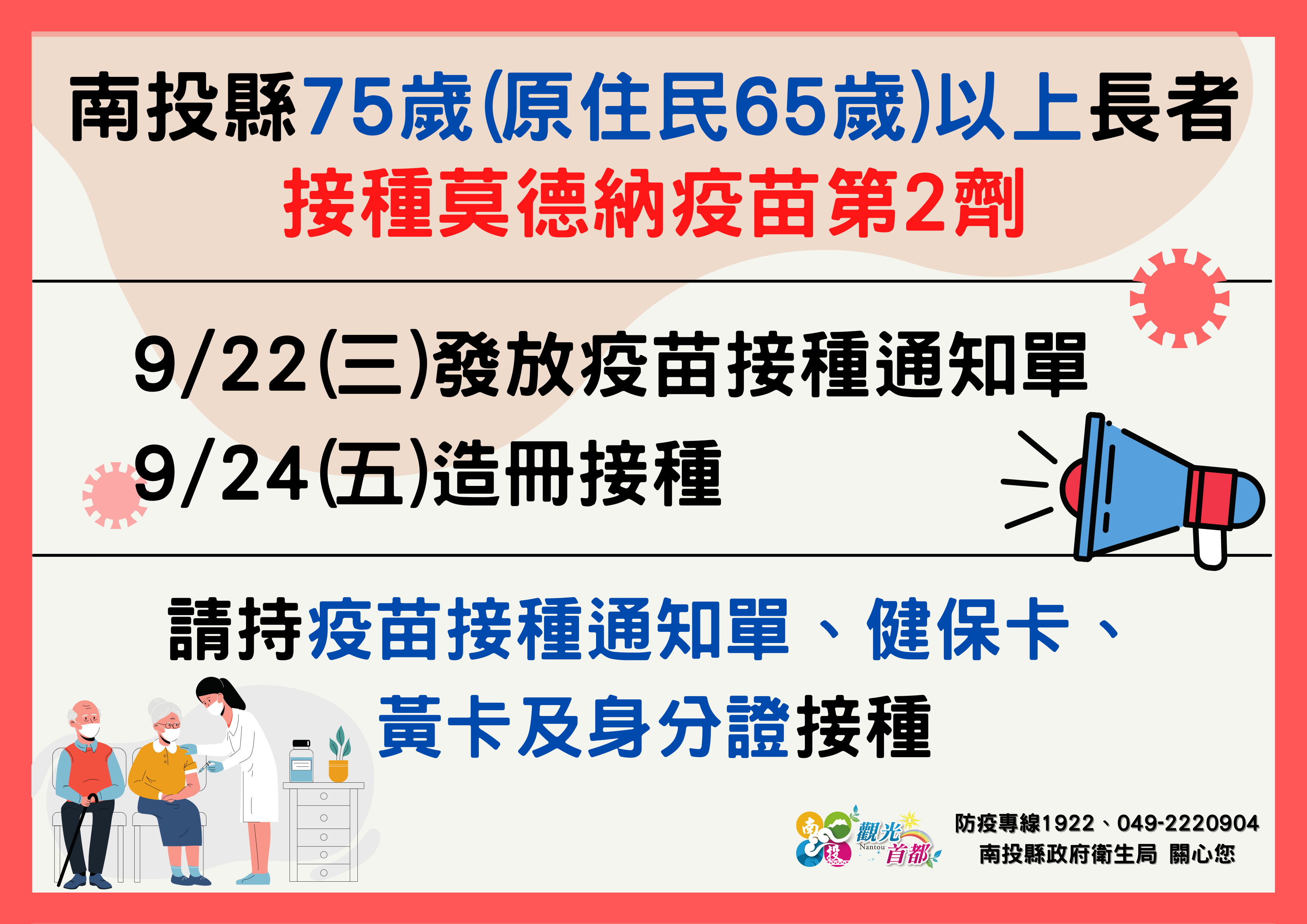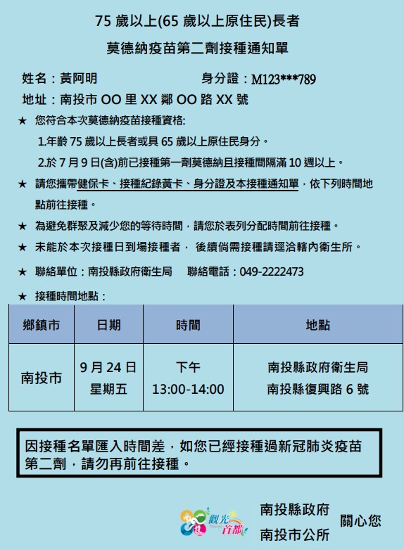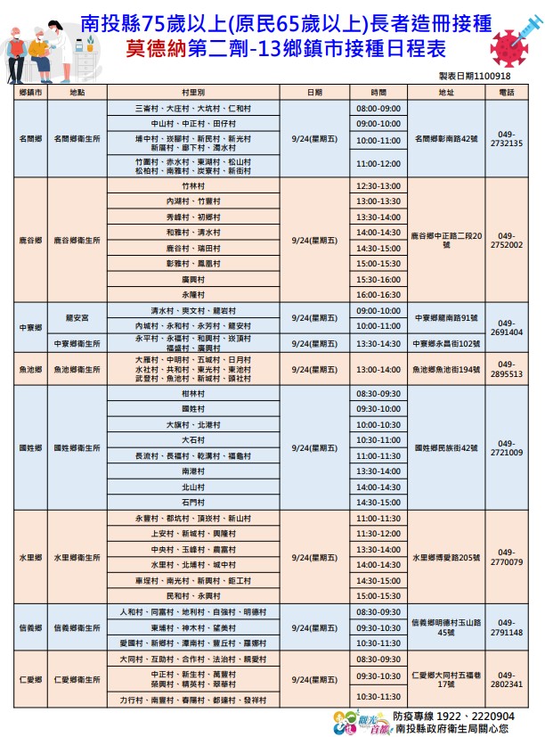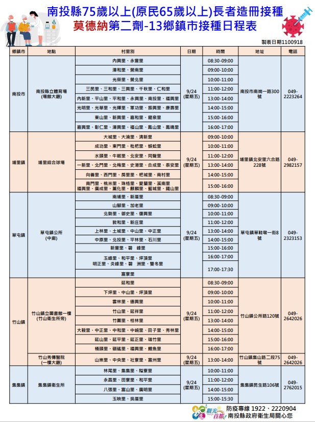 防疫宣傳 居家照護關懷手冊 防疫補助 勞工紓困 農漁畜牧 觀光紓困 企業紓困 租稅紓困 藝文紓困 中央各部會防疫專區 首頁 防疫宣傳 南投縣75歲以上(原... 南投縣75歲以上(原民65歲以上)長者接種莫德納第二劑日程資訊 公佈單位:新聞及行政處 發佈日期:110/9/22