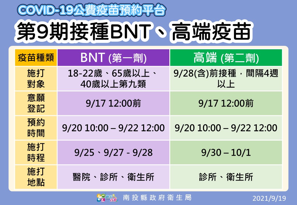 防疫宣傳 居家照護關懷手冊 防疫補助 勞工紓困 農漁畜牧 觀光紓困 企業紓困 租稅紓困 藝文紓困 中央各部會防疫專區 首頁 防疫宣傳 南投縣第9期接種BN... 南投縣第9期接種BNT、高端疫苗資訊 公佈單位:新聞及行政處 發佈日期:110/9/22
