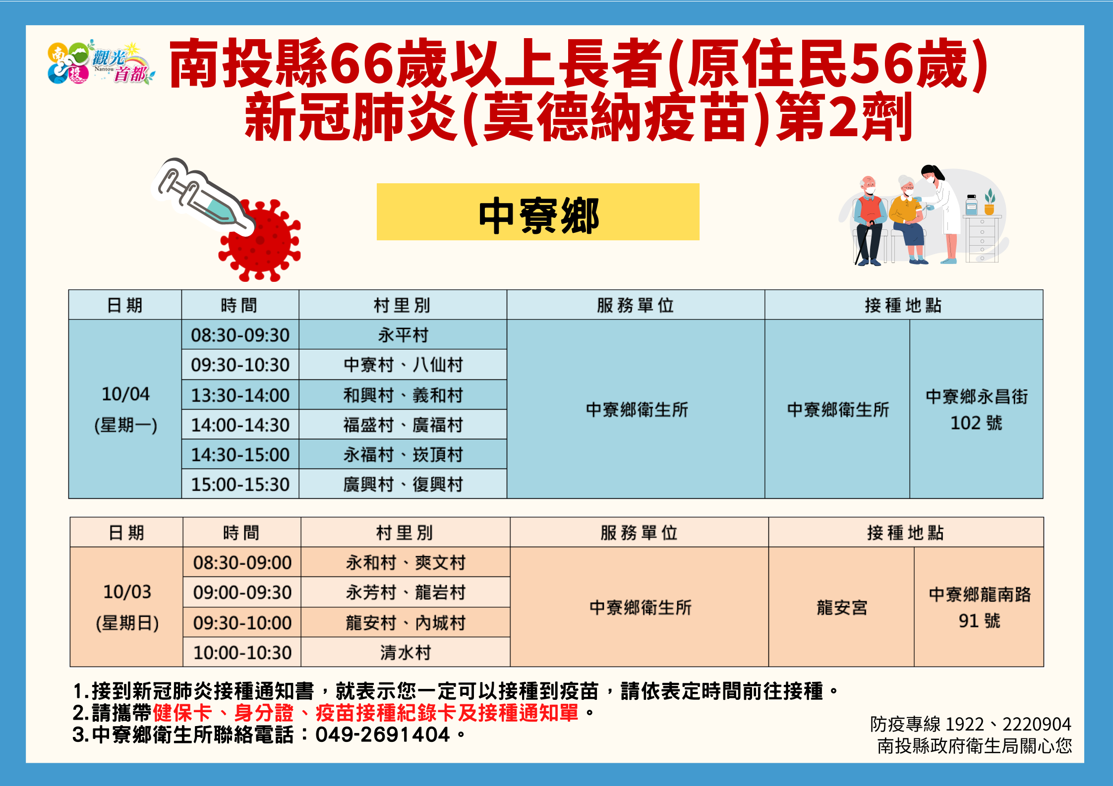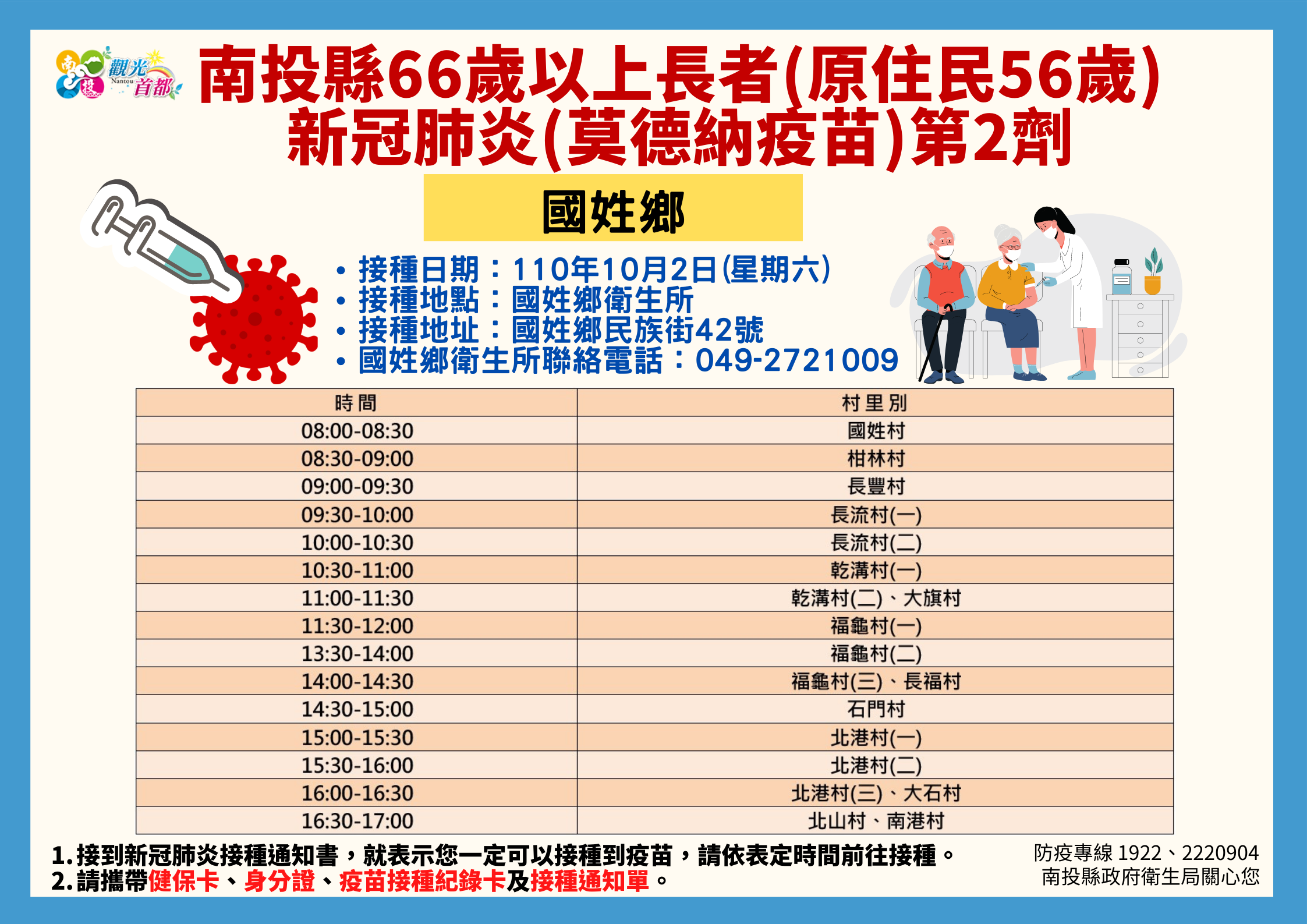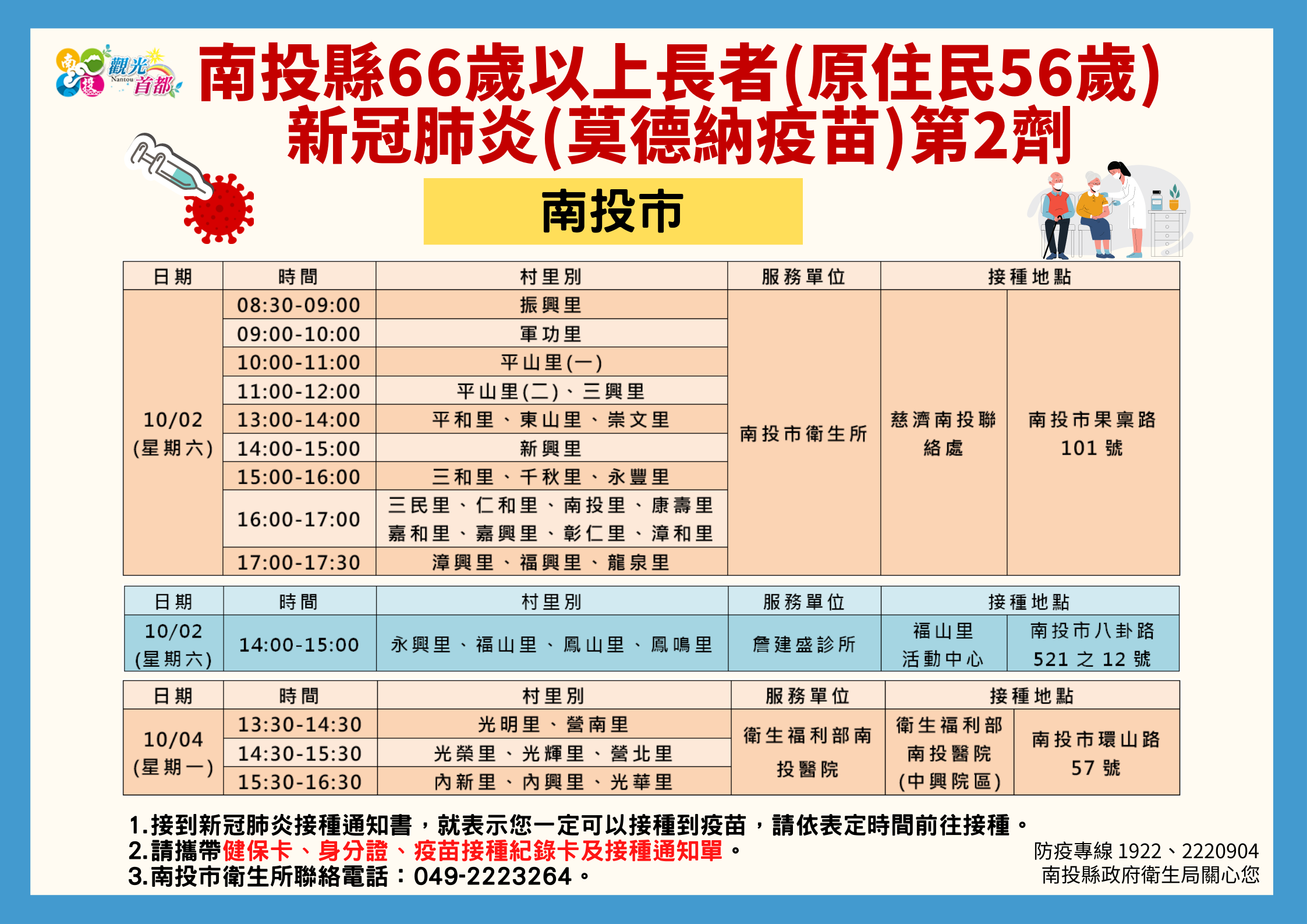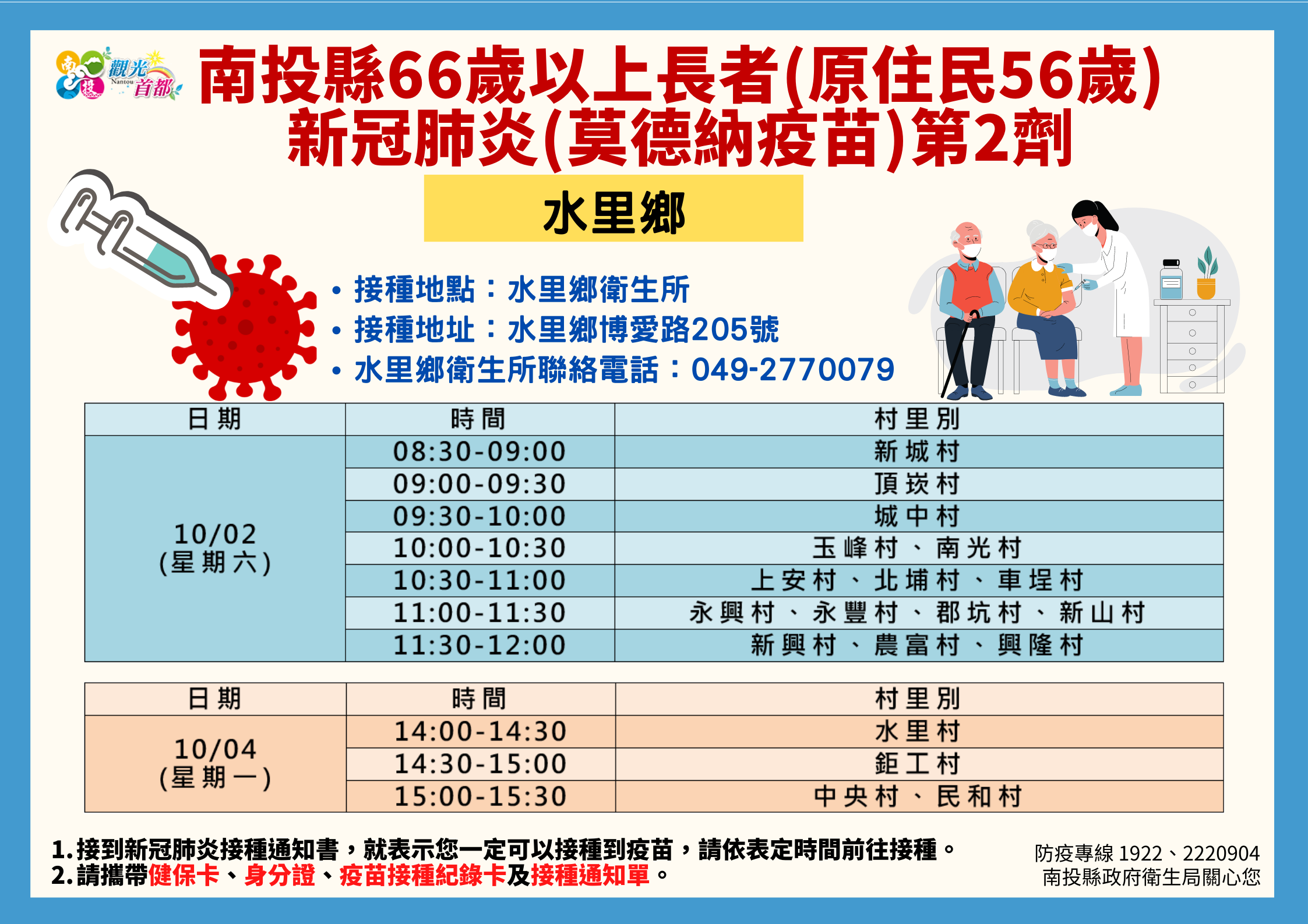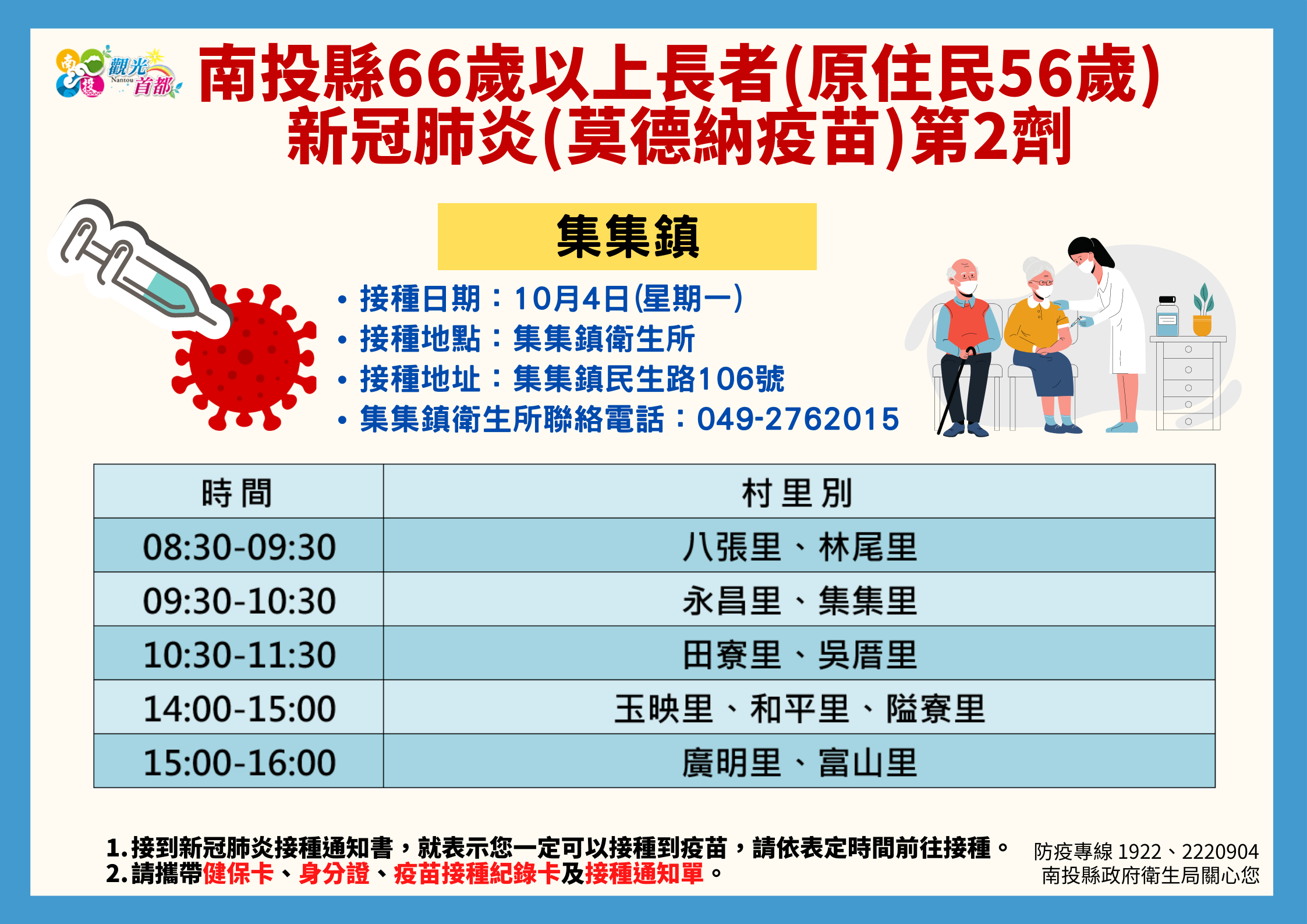 防疫宣傳 居家照護關懷手冊 防疫補助 勞工紓困 農漁畜牧 觀光紓困 企業紓困 租稅紓困 藝文紓困 中央各部會防疫專區 首頁 防疫宣傳 南投縣66歲以上(原... 南投縣66歲以上(原民56歲)長者接種莫德納第二劑各鄉鎮市日程 公佈單位:新聞及行政處 發佈日期:110/9/29