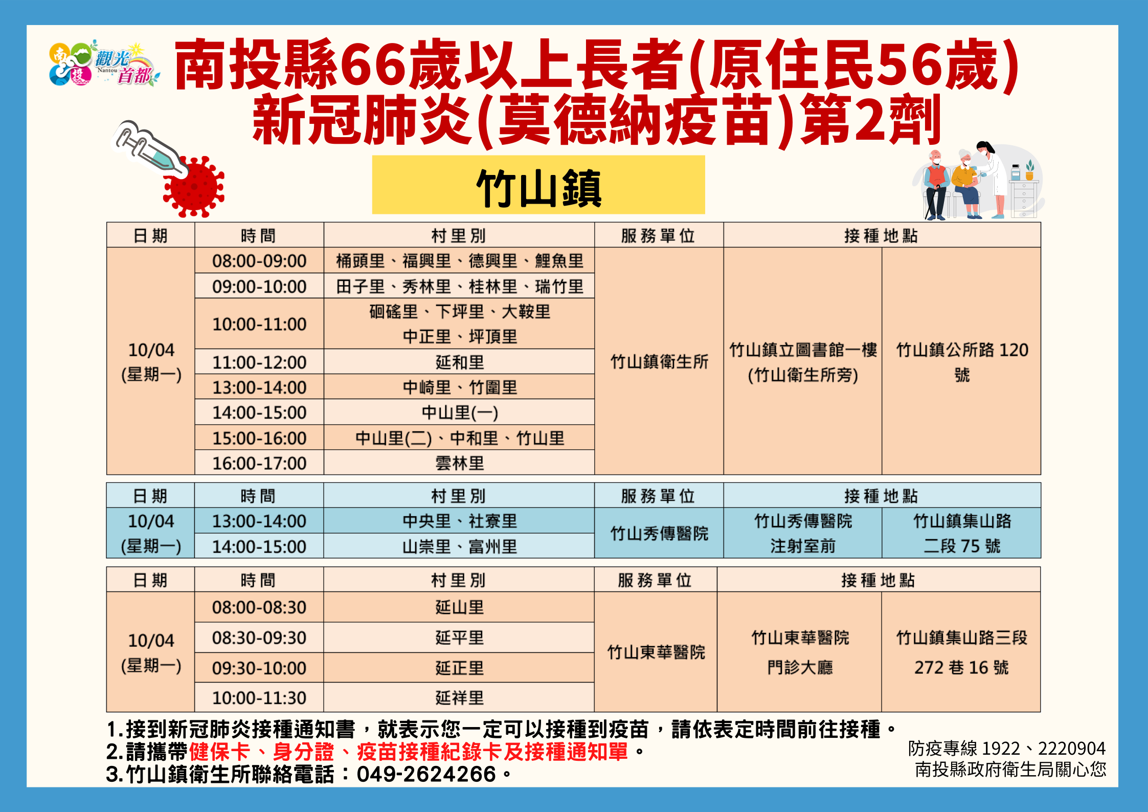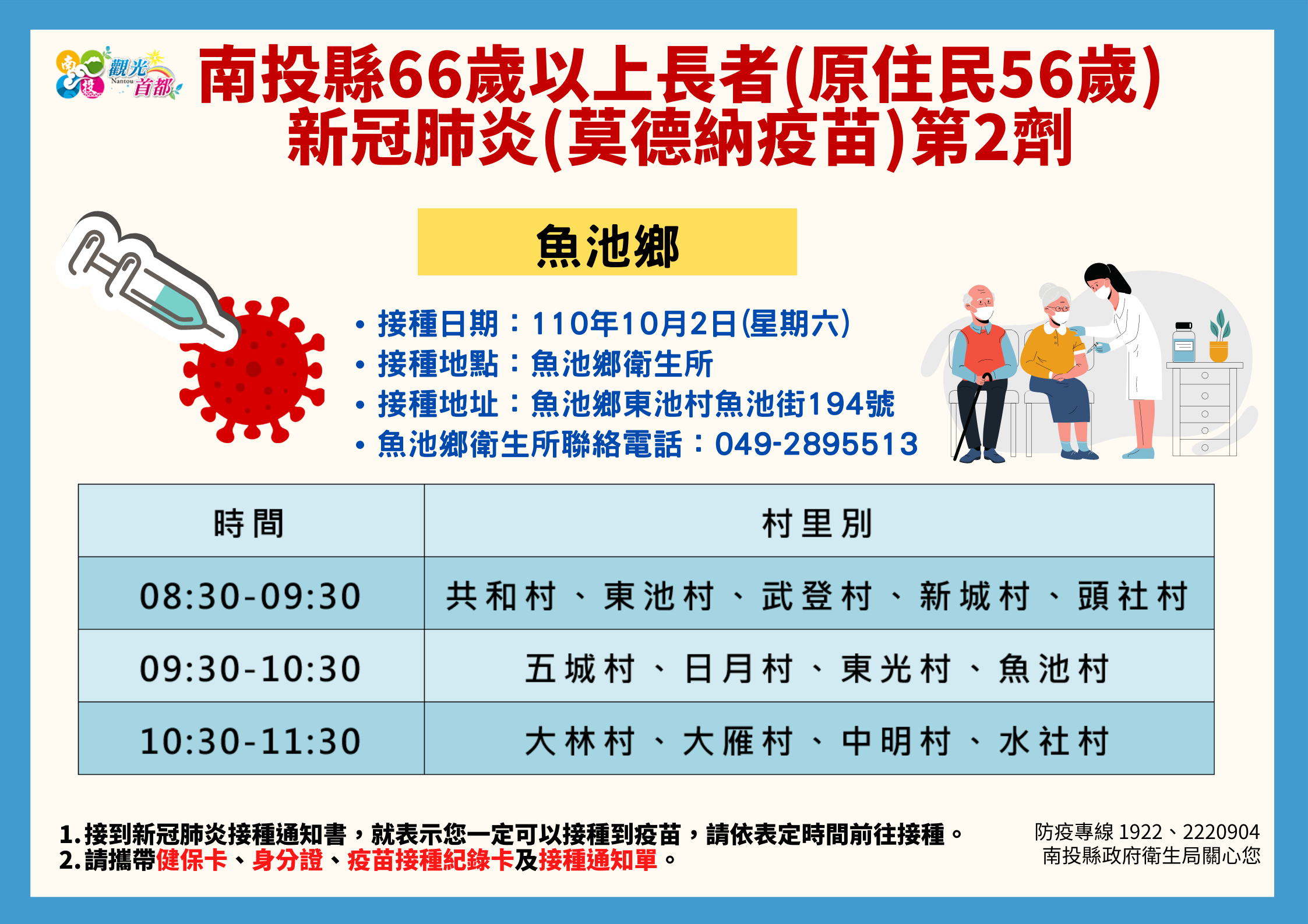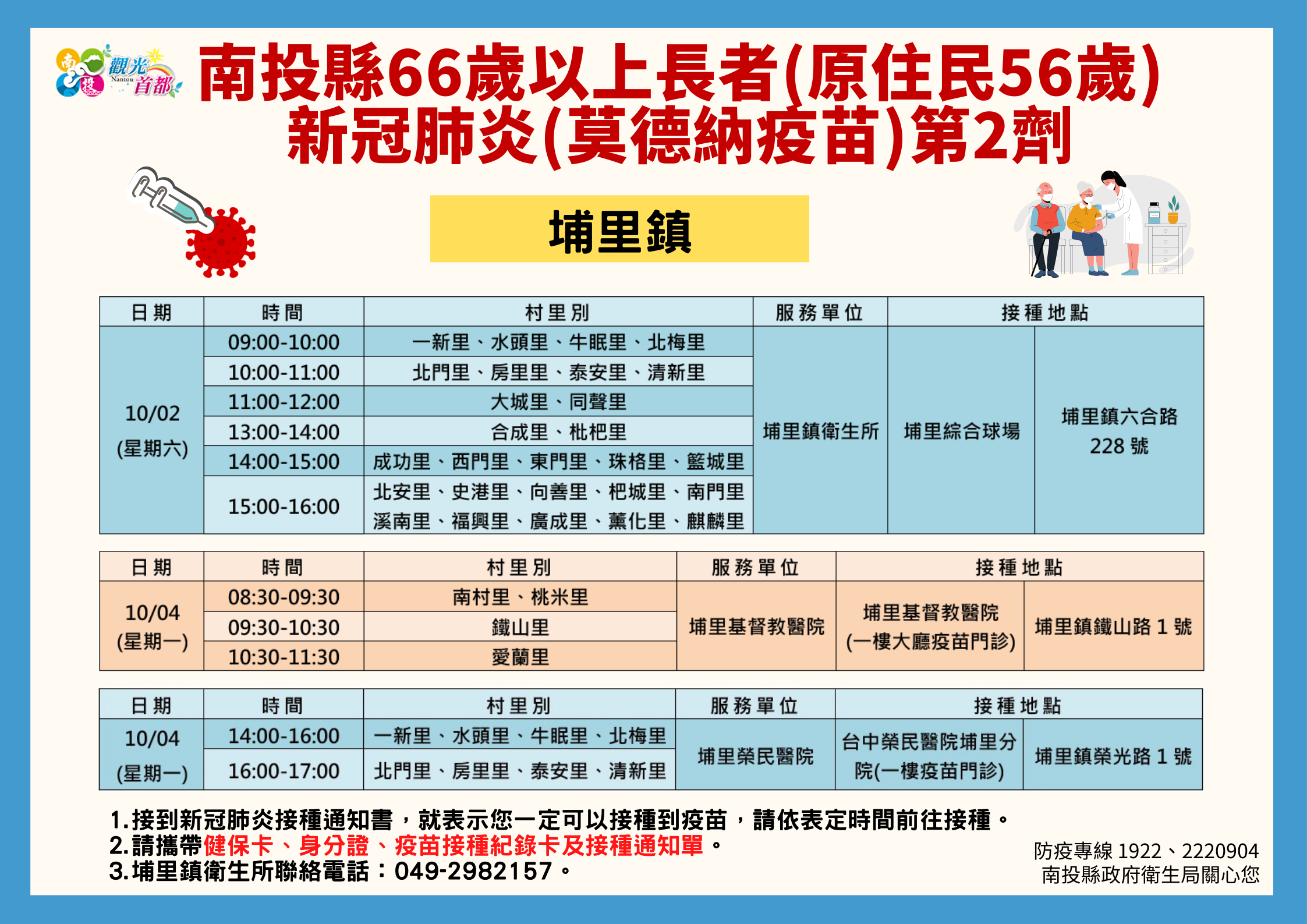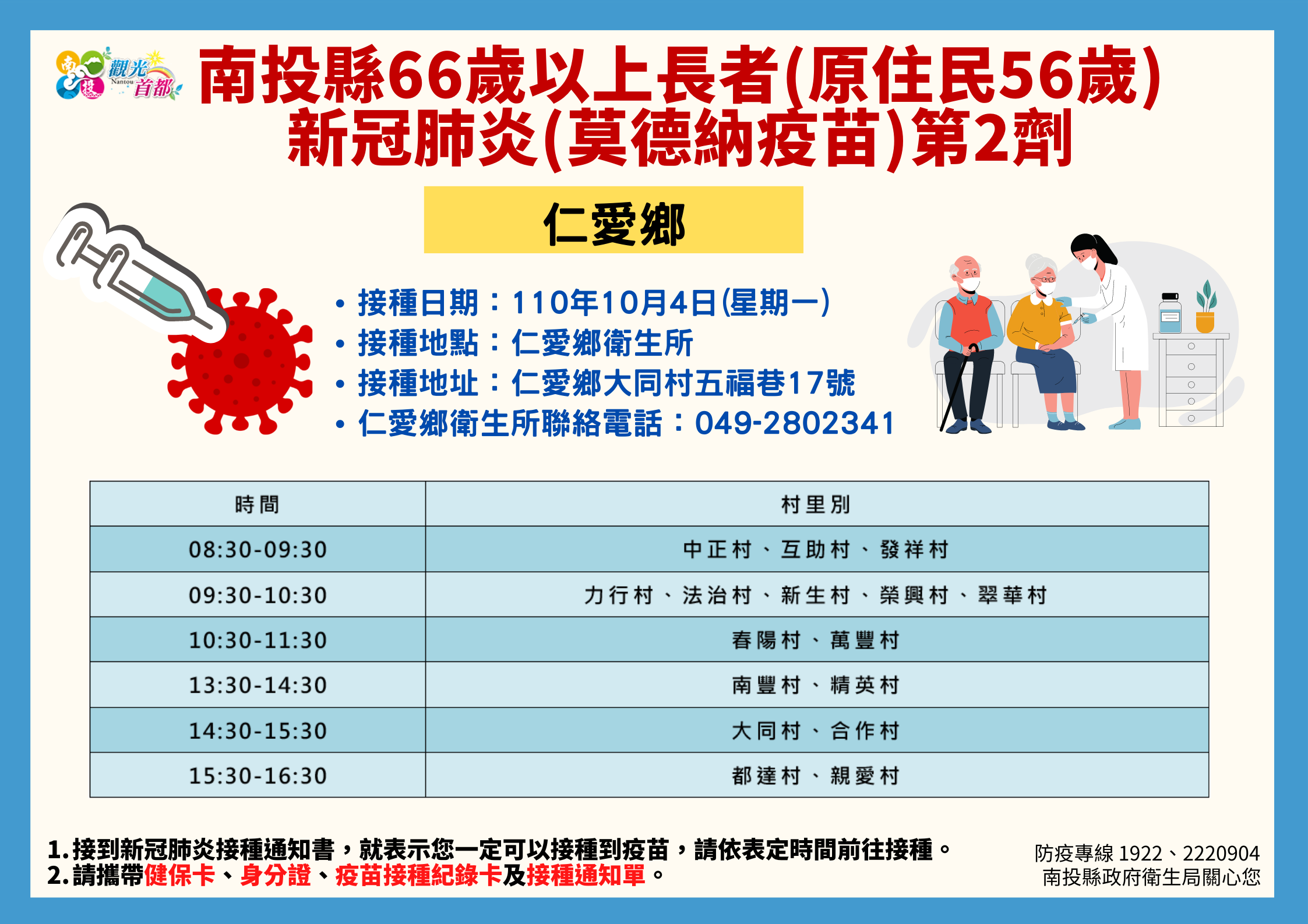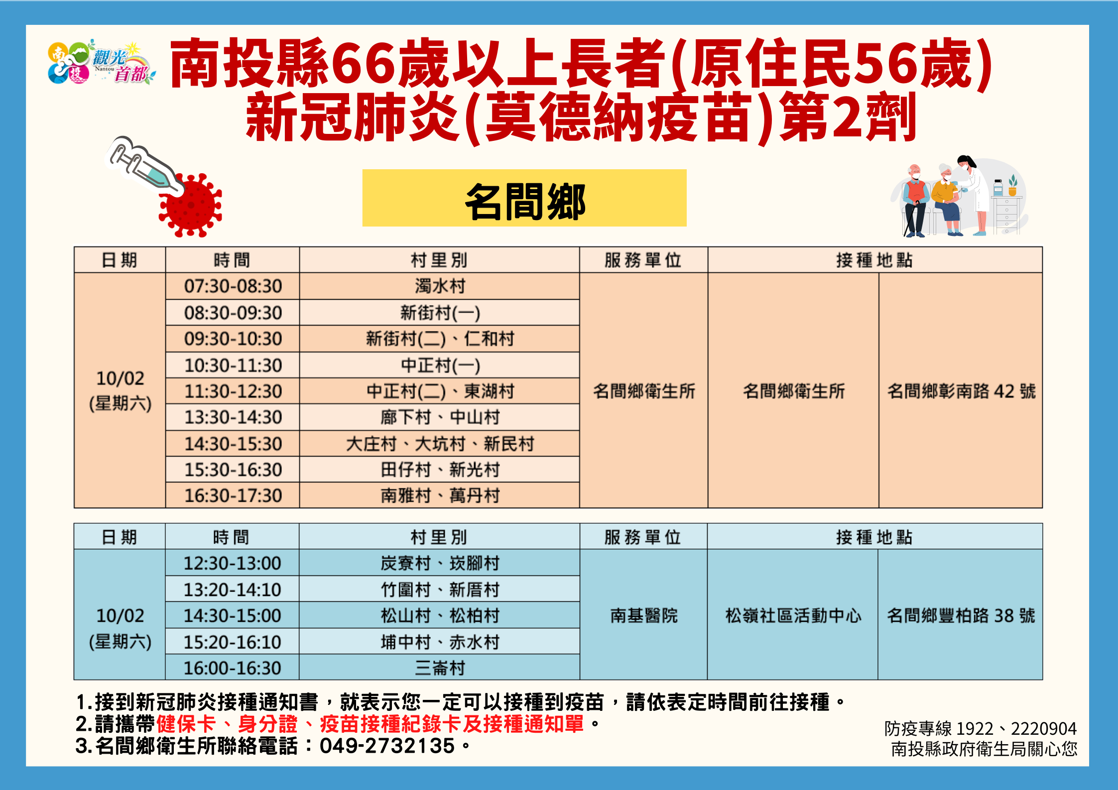 防疫宣傳 居家照護關懷手冊 防疫補助 勞工紓困 農漁畜牧 觀光紓困 企業紓困 租稅紓困 藝文紓困 中央各部會防疫專區 首頁 防疫宣傳 南投縣66歲以上(原... 南投縣66歲以上(原民56歲)長者接種莫德納第二劑各鄉鎮市日程 公佈單位:新聞及行政處 發佈日期:110/9/29