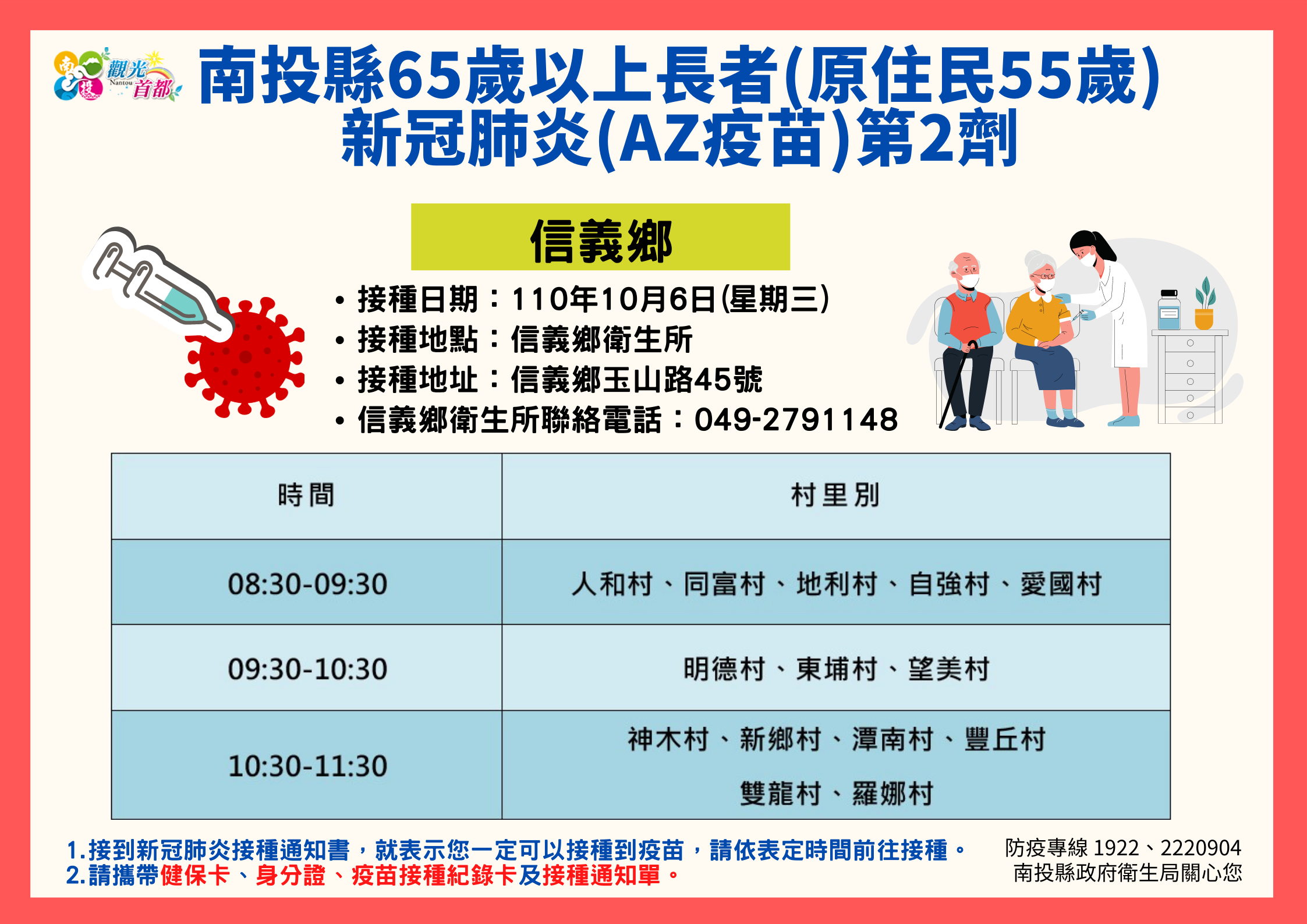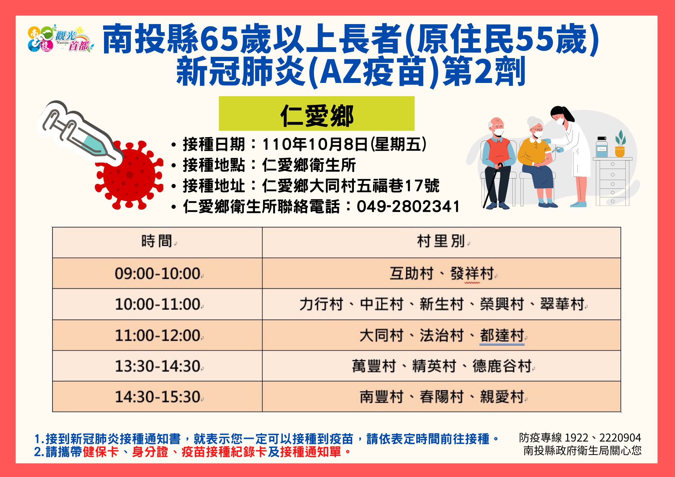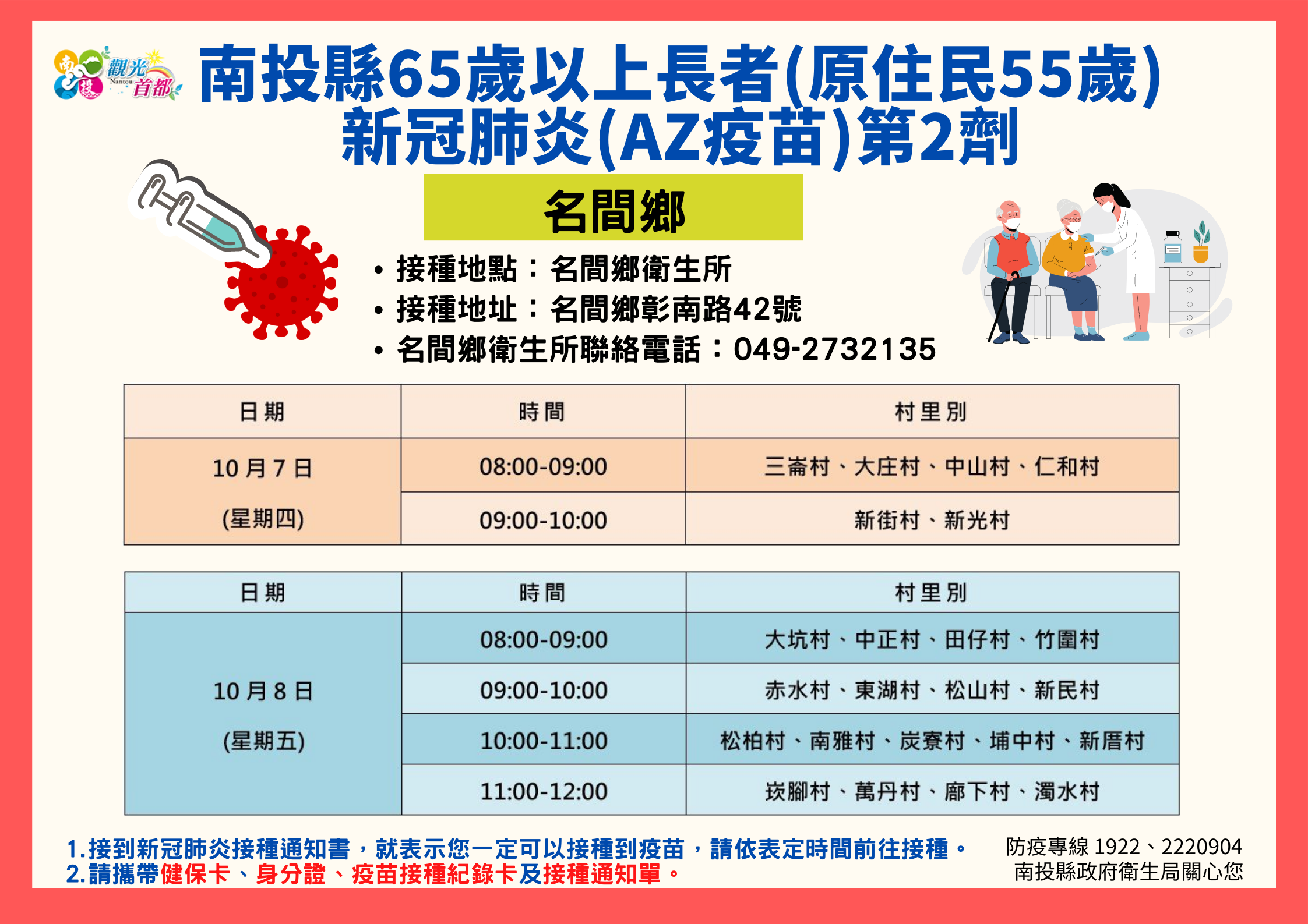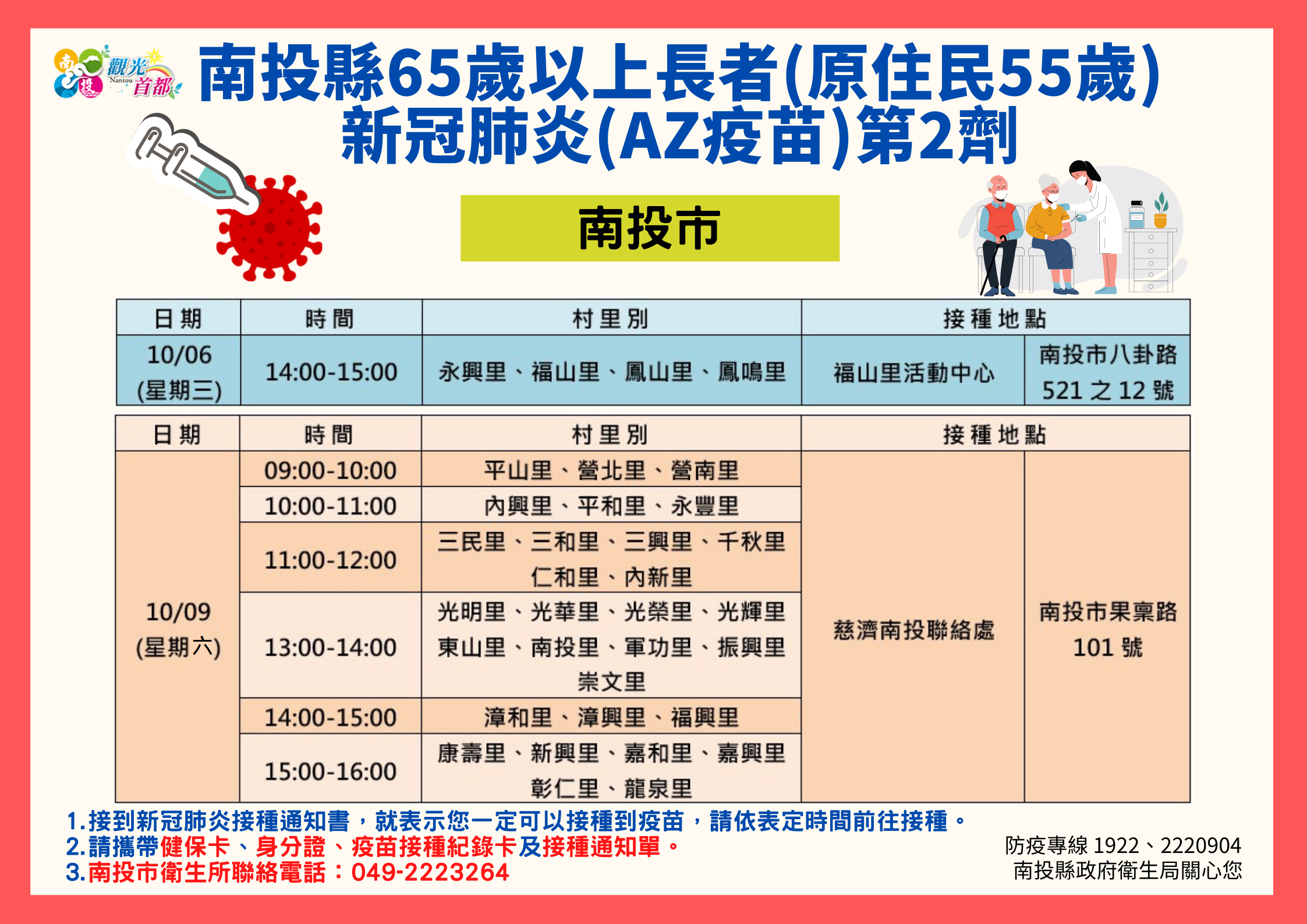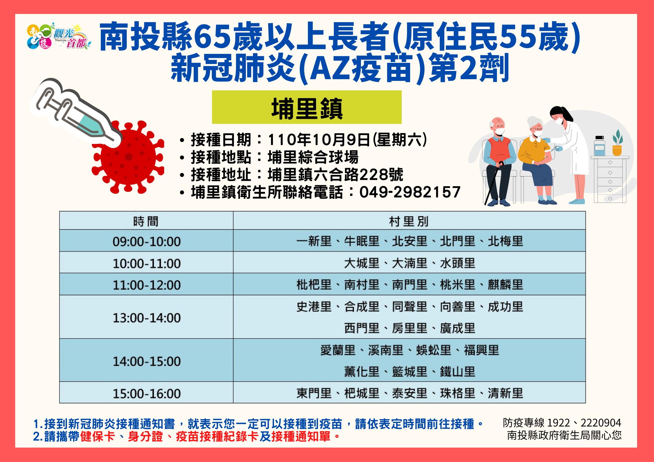 防疫宣傳 居家照護關懷手冊 防疫補助 勞工紓困 農漁畜牧 觀光紓困 企業紓困 租稅紓困 藝文紓困 中央各部會防疫專區 首頁 防疫宣傳 南投縣65歲以上(原... 南投縣65歲以上(原民55歲)長者接種AZ第2劑各鄉鎮市日程 公佈單位:新聞及行政處 發佈日期:110/10/4