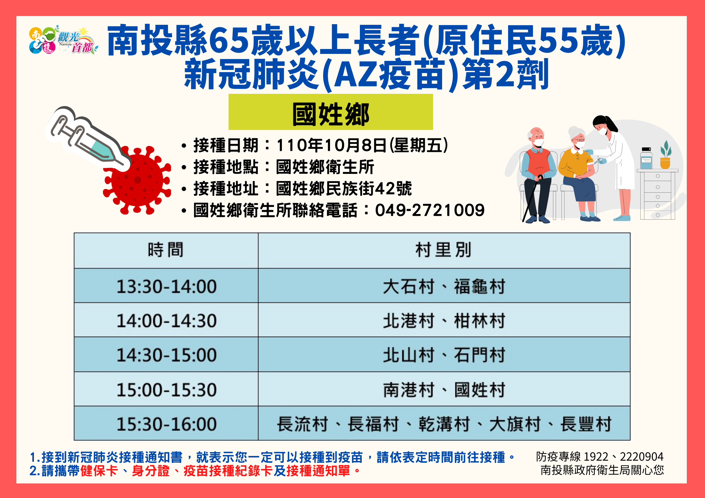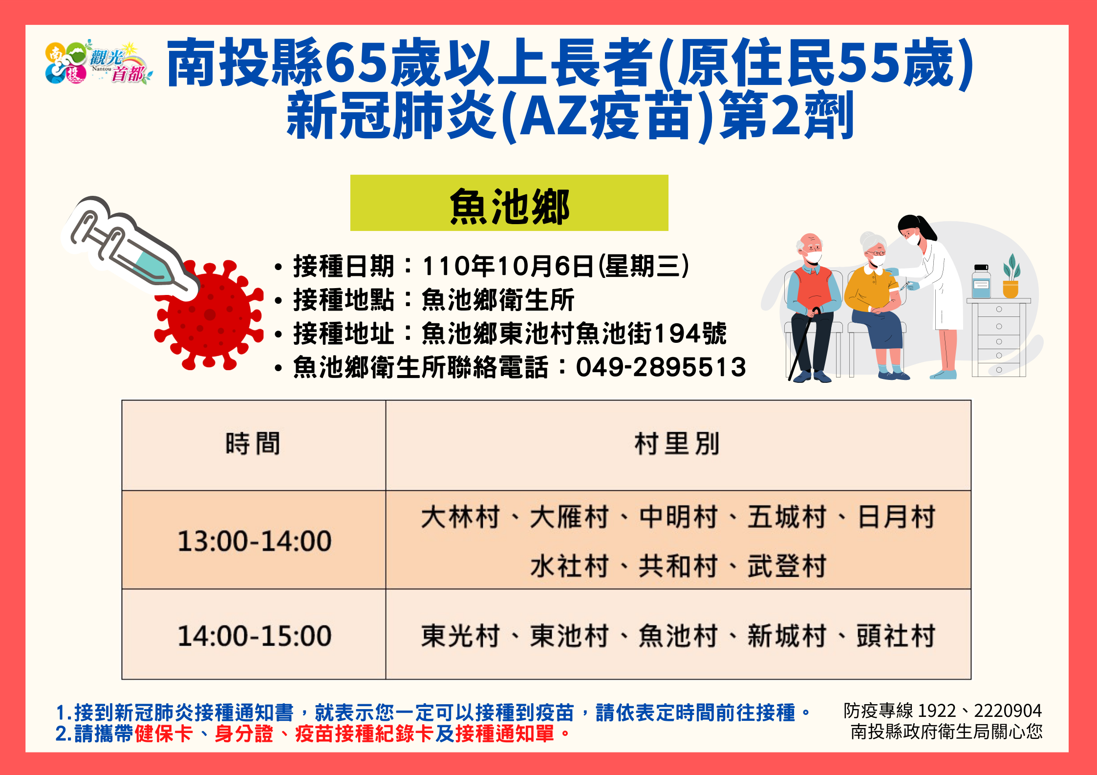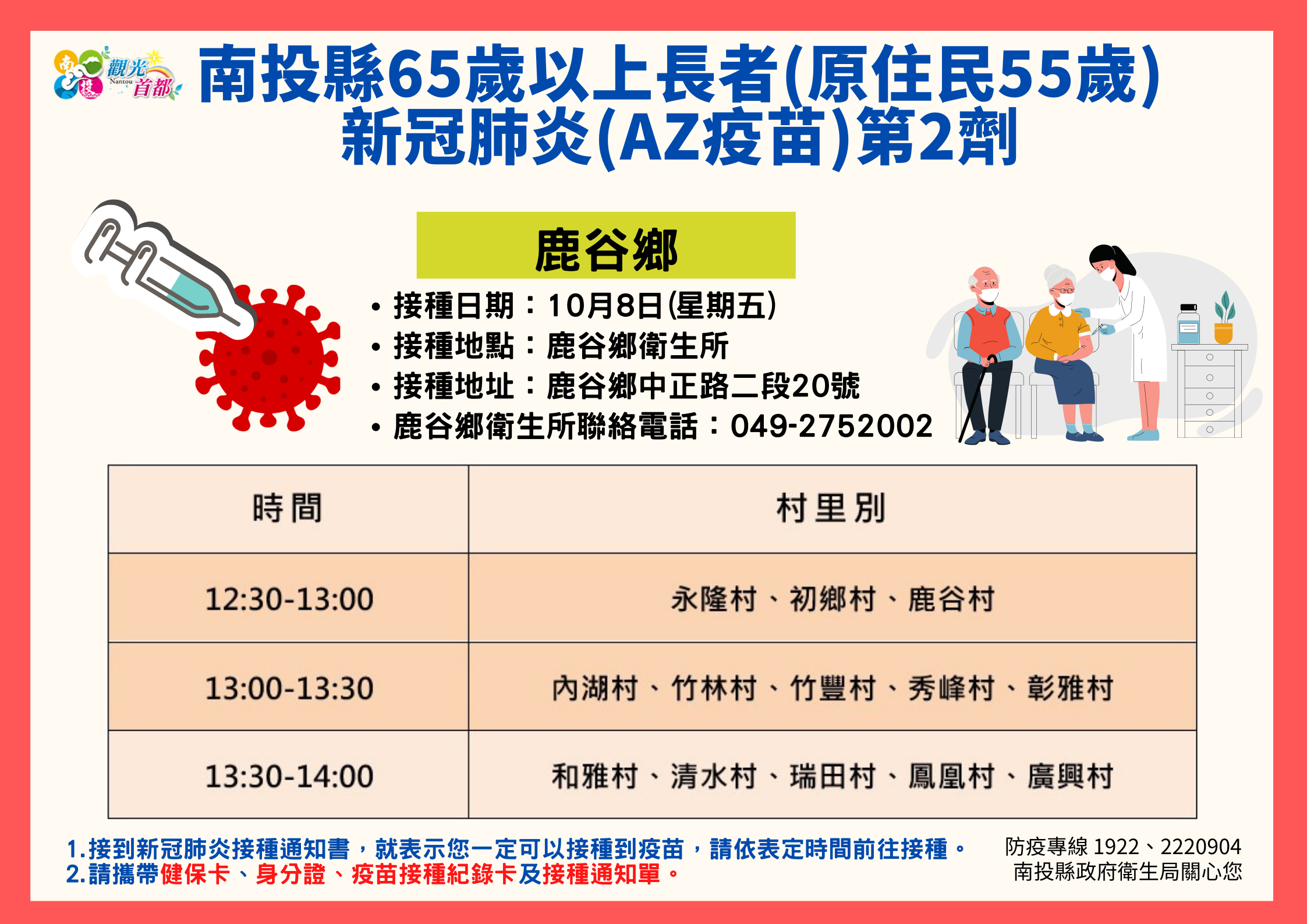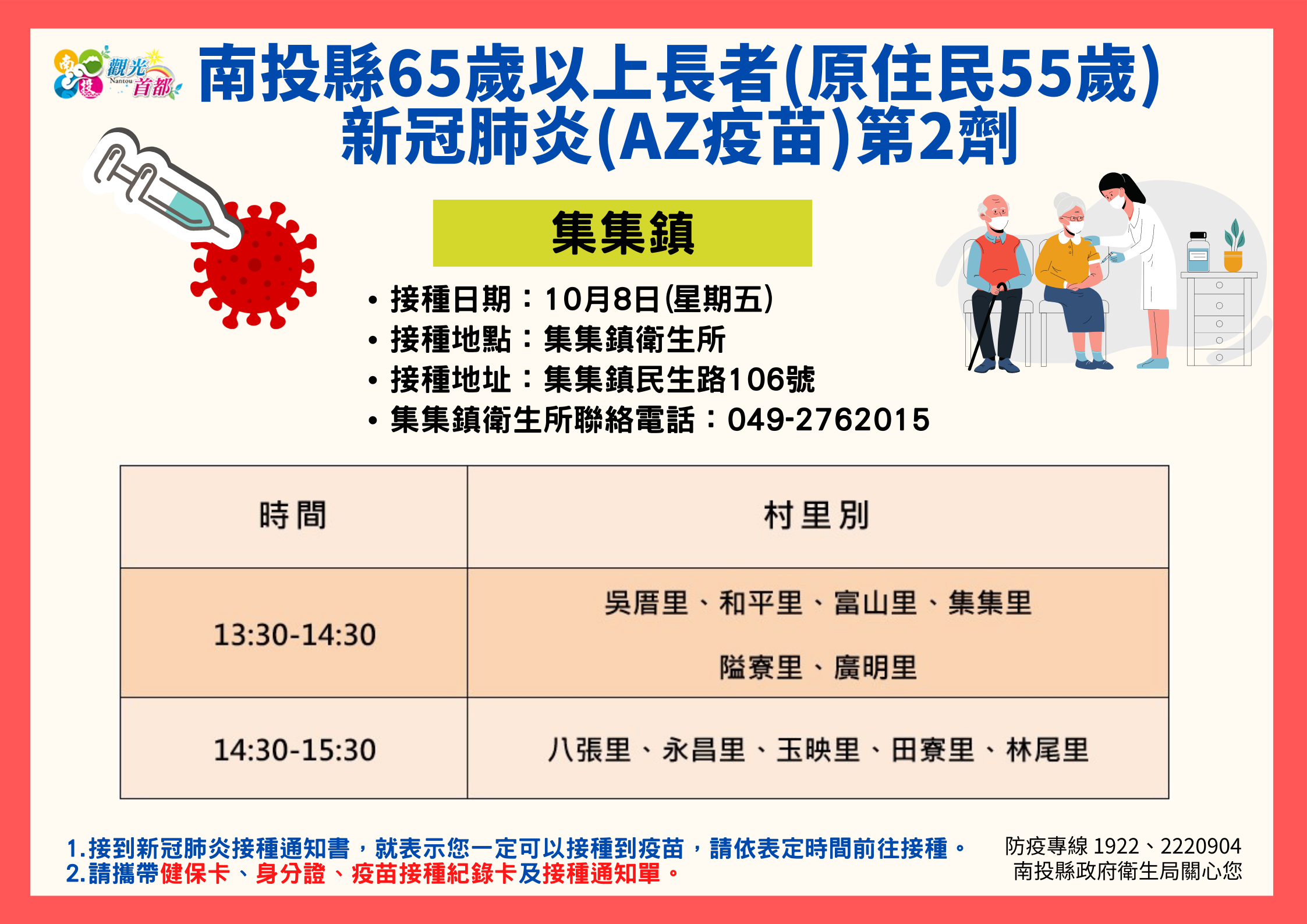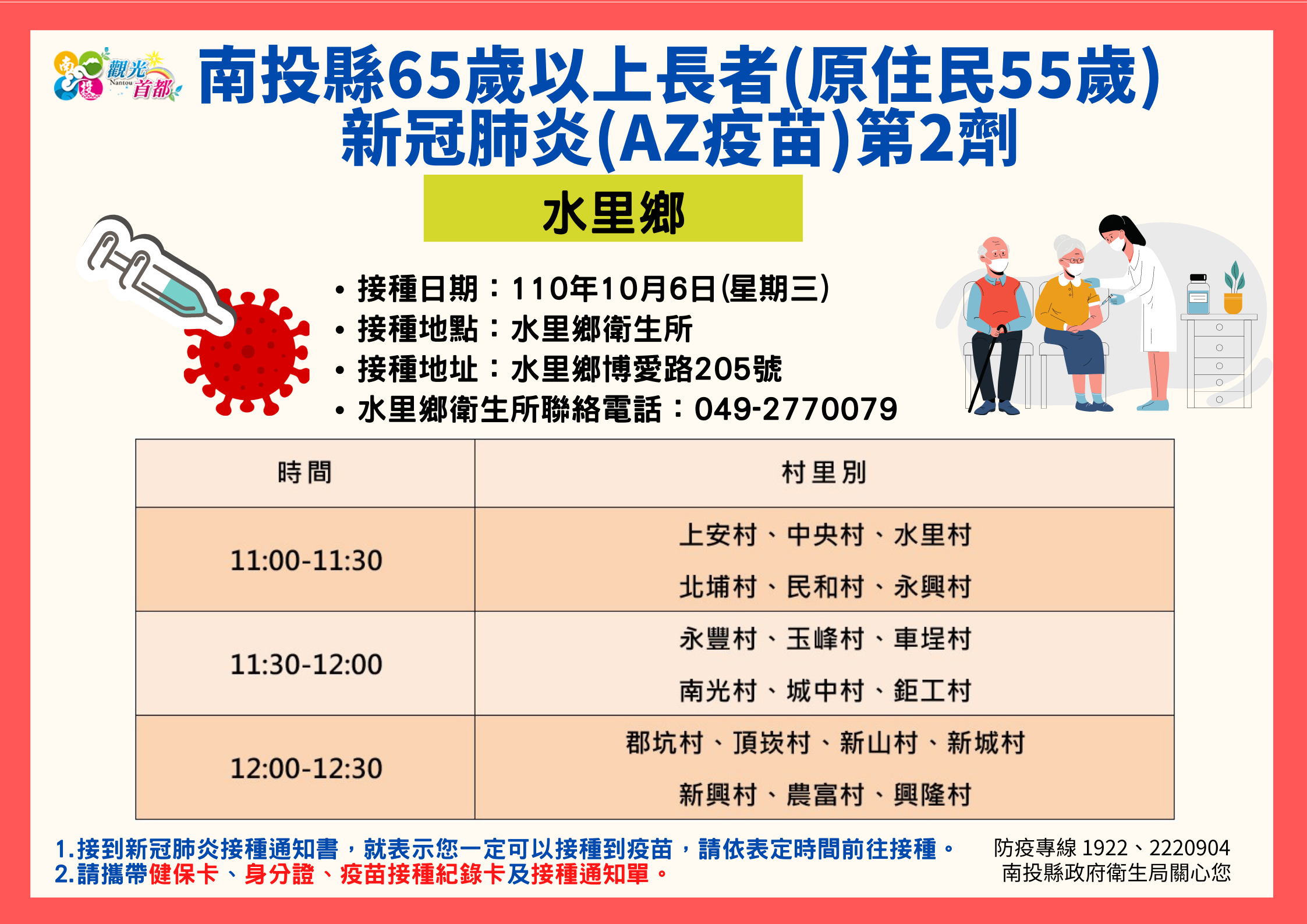 防疫宣傳 居家照護關懷手冊 防疫補助 勞工紓困 農漁畜牧 觀光紓困 企業紓困 租稅紓困 藝文紓困 中央各部會防疫專區 首頁 防疫宣傳 南投縣65歲以上(原... 南投縣65歲以上(原民55歲)長者接種AZ第2劑各鄉鎮市日程 公佈單位:新聞及行政處 發佈日期:110/10/4