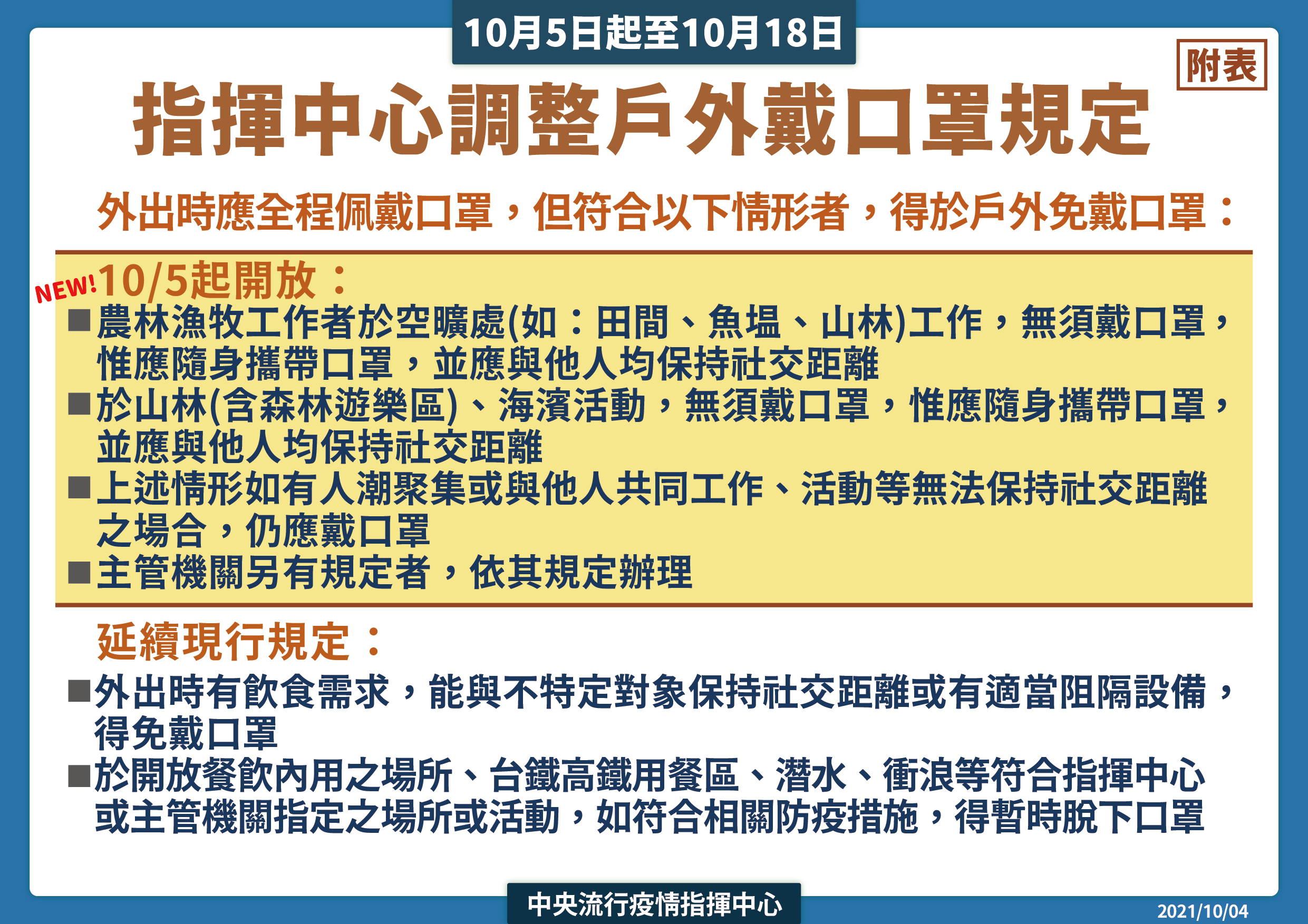 防疫宣傳 居家照護關懷手冊 防疫補助 勞工紓困 農漁畜牧 觀光紓困 企業紓困 租稅紓困 藝文紓困 中央各部會防疫專區 首頁 防疫宣傳 中央疫情指揮中心調整... 中央疫情指揮中心調整戶外戴口罩規定 公佈單位:新聞及行政處 發佈日期:110/10/4