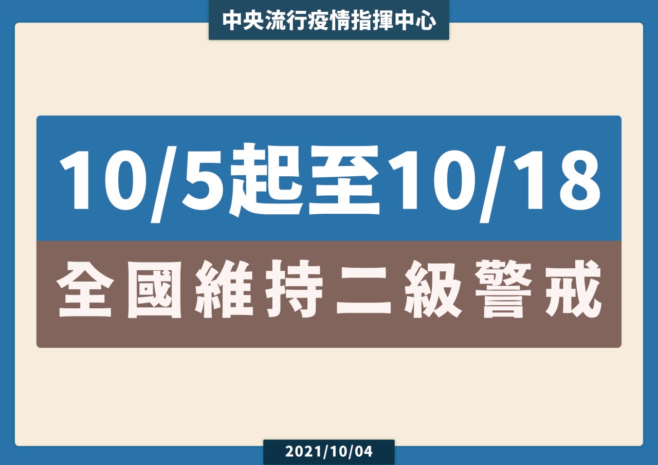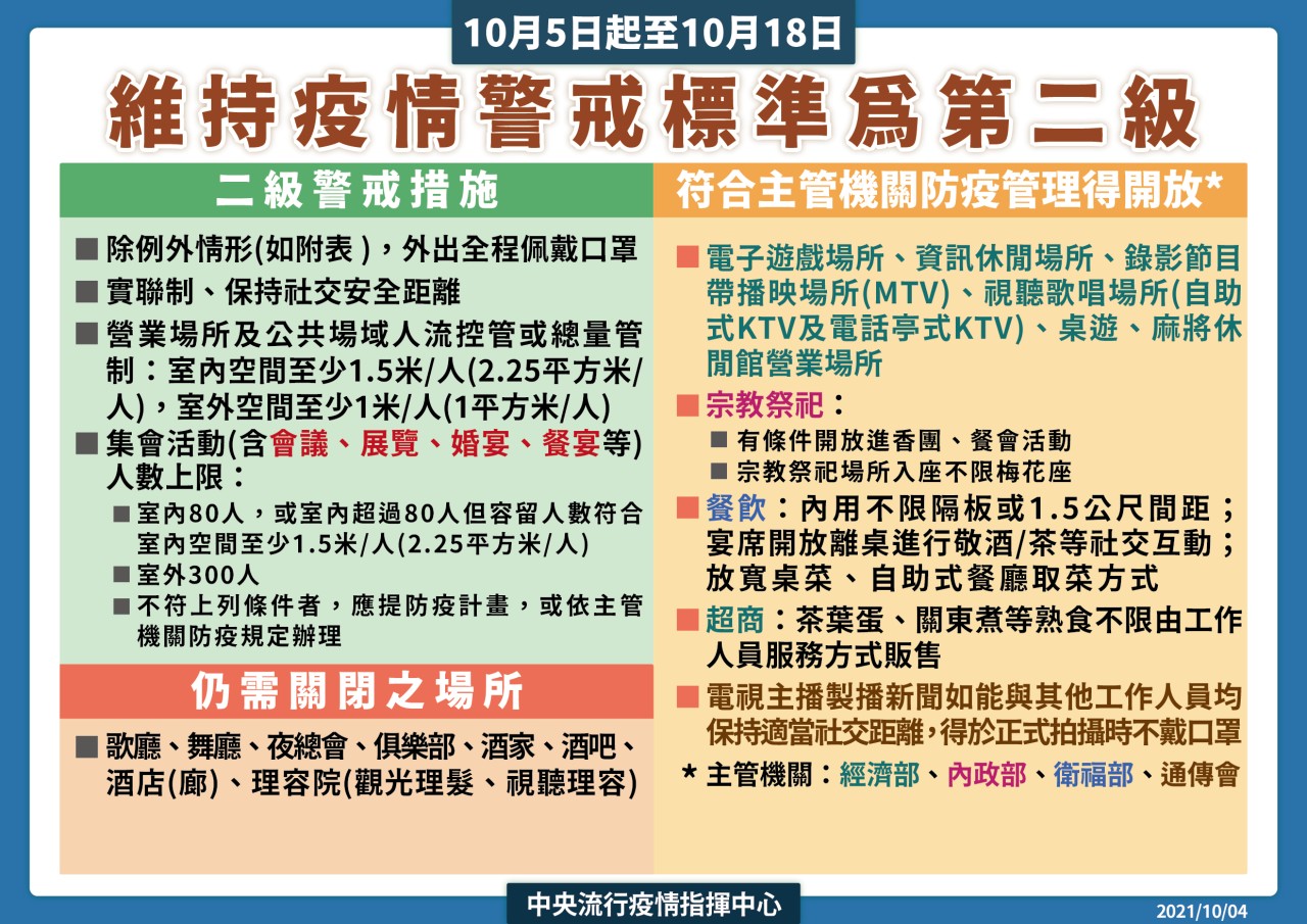 防疫宣傳 居家照護關懷手冊 防疫補助 勞工紓困 農漁畜牧 觀光紓困 企業紓困 租稅紓困 藝文紓困 中央各部會防疫專區 首頁 防疫宣傳 10/5起至10/1... 10/5起至10/18全國維持二級警戒防疫措施 公佈單位:新聞及行政處 發佈日期:110/10/4