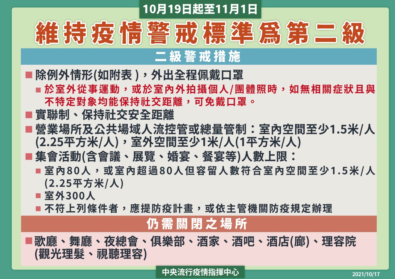 防疫宣傳 居家照護關懷手冊 防疫補助 勞工紓困 農漁畜牧 觀光紓困 企業紓困 租稅紓困 藝文紓困 中央各部會防疫專區 首頁 防疫宣傳 10/19起至11/... 10/19起至11/1全國維持二級警戒防疫措施 公佈單位:新聞及行政處 發佈日期:110/10/18