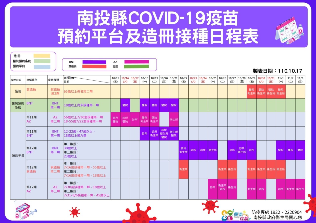 防疫宣傳 居家照護關懷手冊 防疫補助 勞工紓困 農漁畜牧 觀光紓困 企業紓困 租稅紓困 藝文紓困 中央各部會防疫專區 首頁 防疫宣傳 南投縣COVID-1... 南投縣COVID-19疫苗預約平台及造冊接種日程表 公佈單位:新聞及行政處 發佈日期:110/10/18