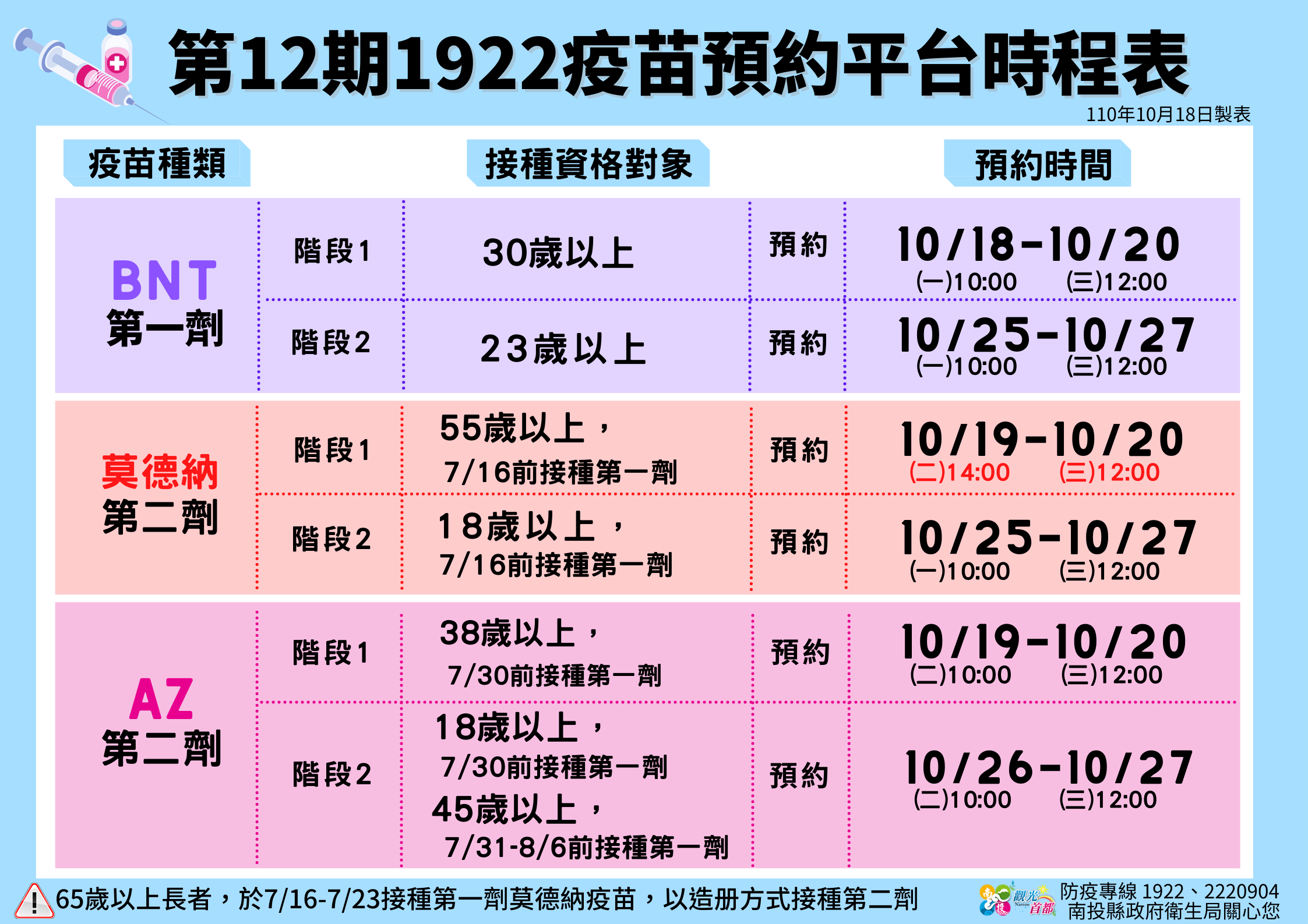 防疫宣傳 居家照護關懷手冊 防疫補助 勞工紓困 農漁畜牧 觀光紓困 企業紓困 租稅紓困 藝文紓困 中央各部會防疫專區 首頁 防疫宣傳 第12期1922疫苗... 第12期1922疫苗預約平台時程表 公佈單位:新聞及行政處 發佈日期:110/10/18