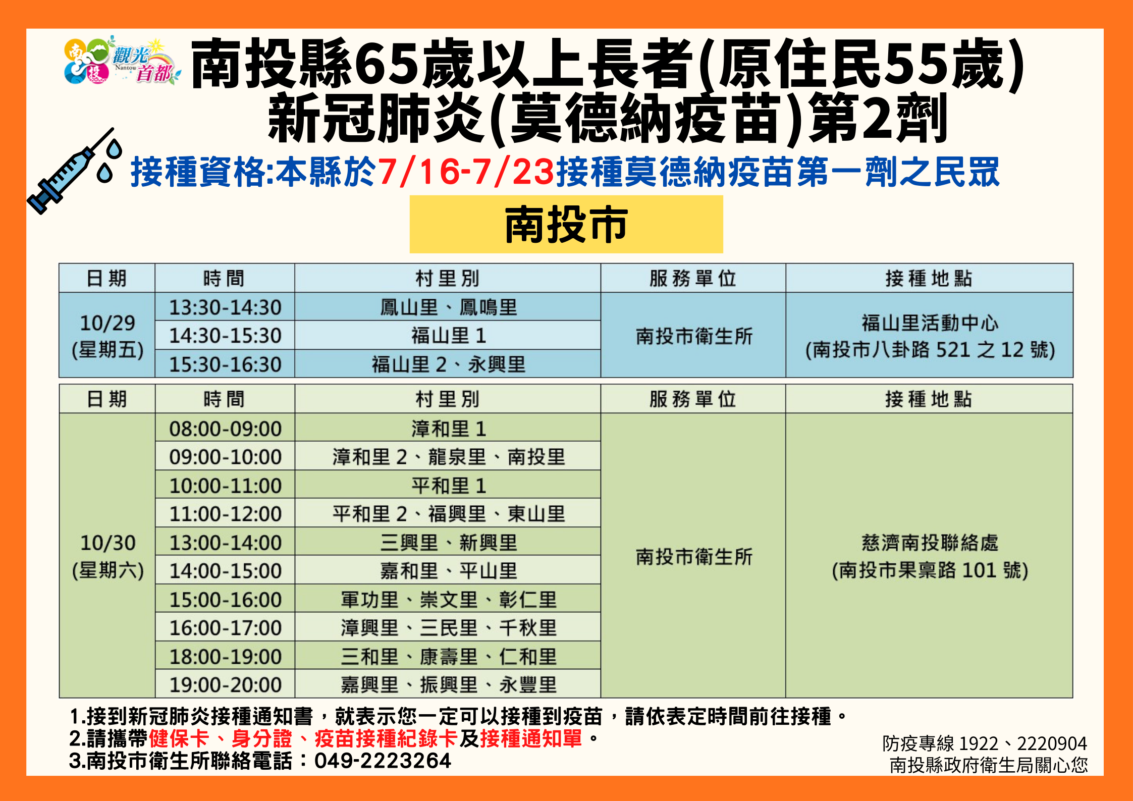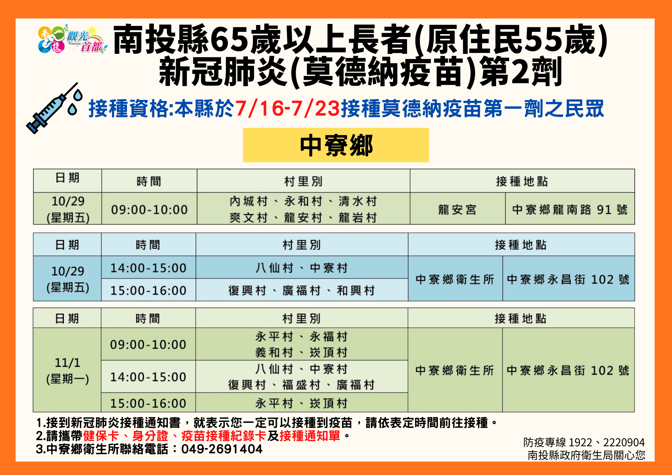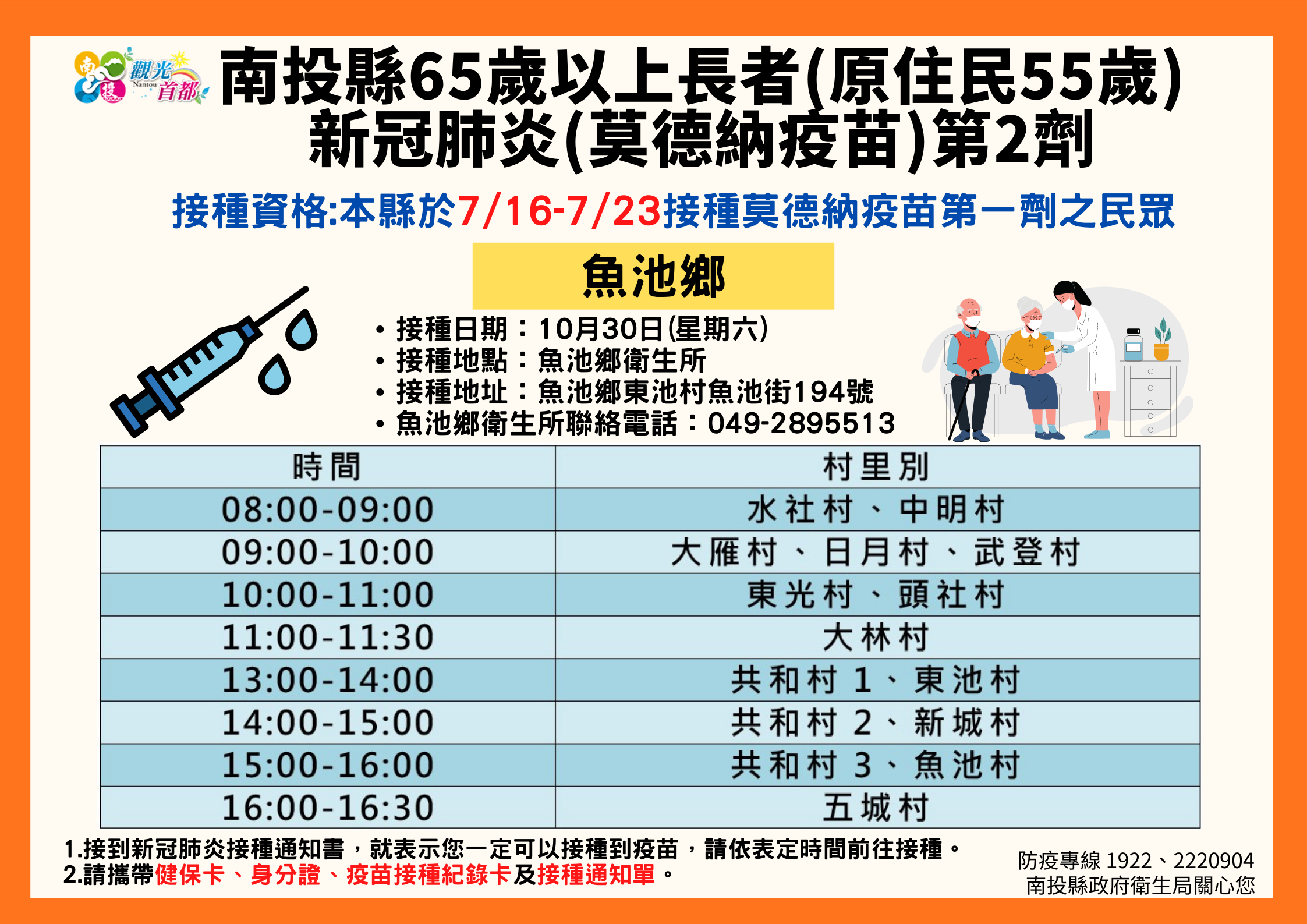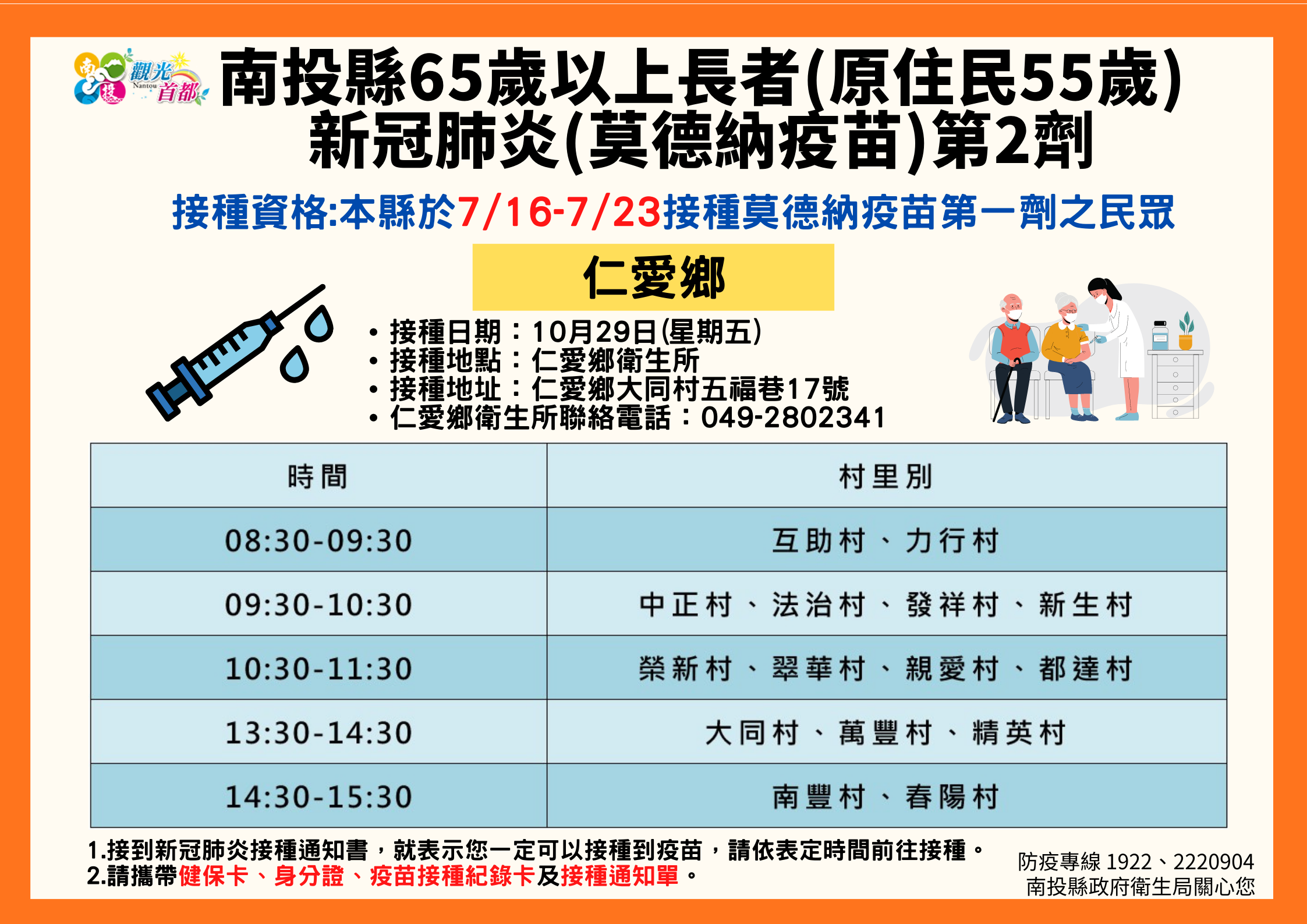 防疫宣傳 居家照護關懷手冊 防疫補助 勞工紓困 農漁畜牧 觀光紓困 企業紓困 租稅紓困 藝文紓困 中央各部會防疫專區 首頁 防疫宣傳 南投縣65歲以上(原... 南投縣65歲以上(原民55歲)長者接種莫德納第二劑13鄉鎮市時程表 公佈單位:新聞及行政處 發佈日期:110/10/19