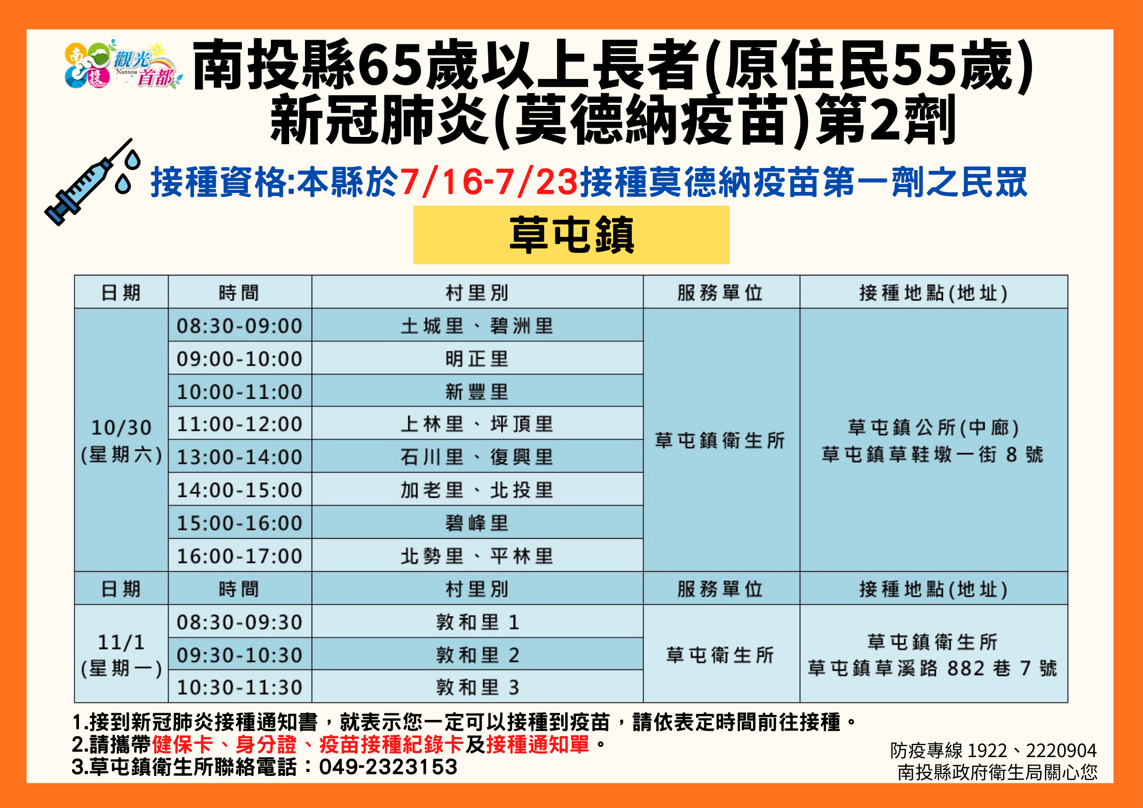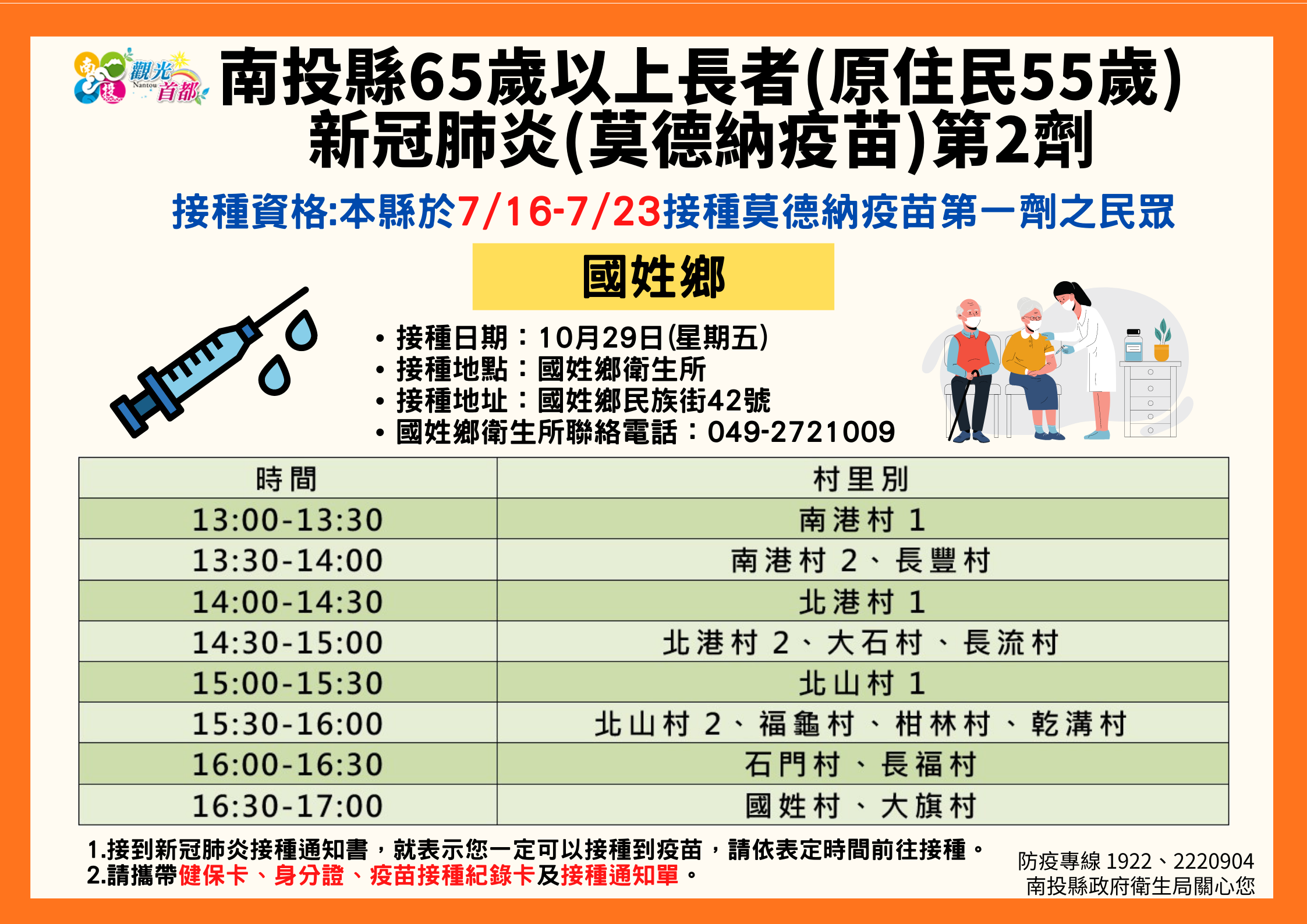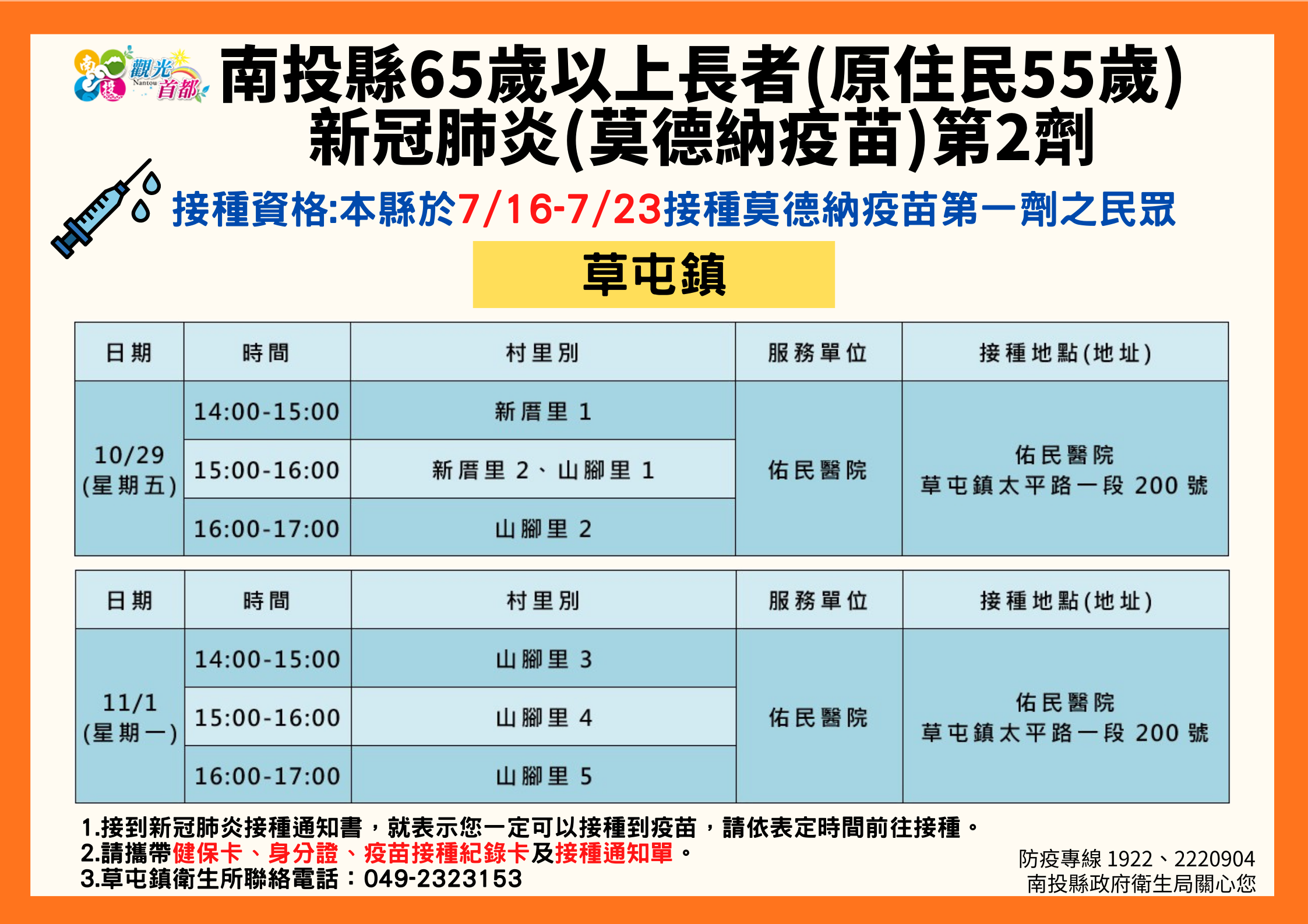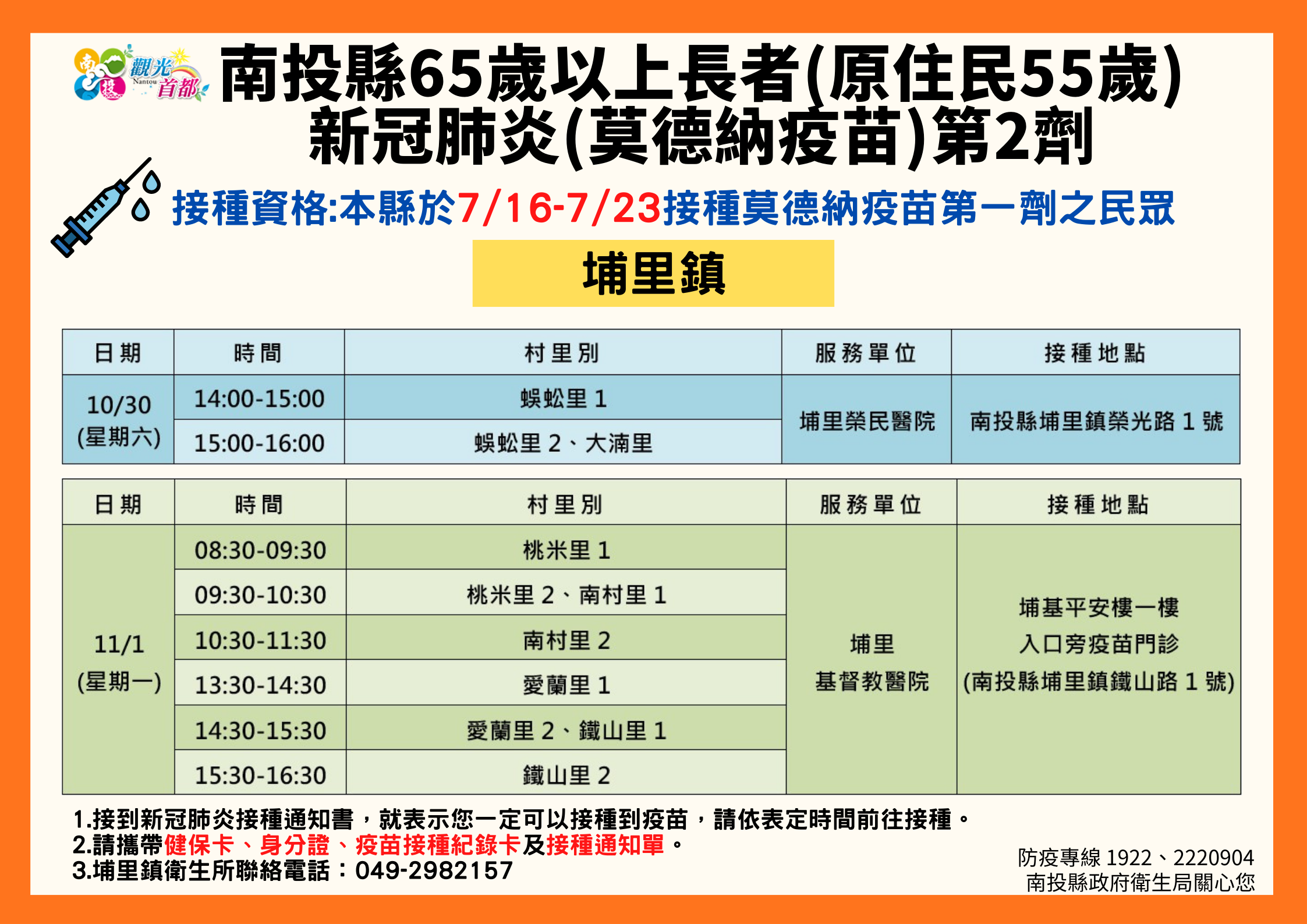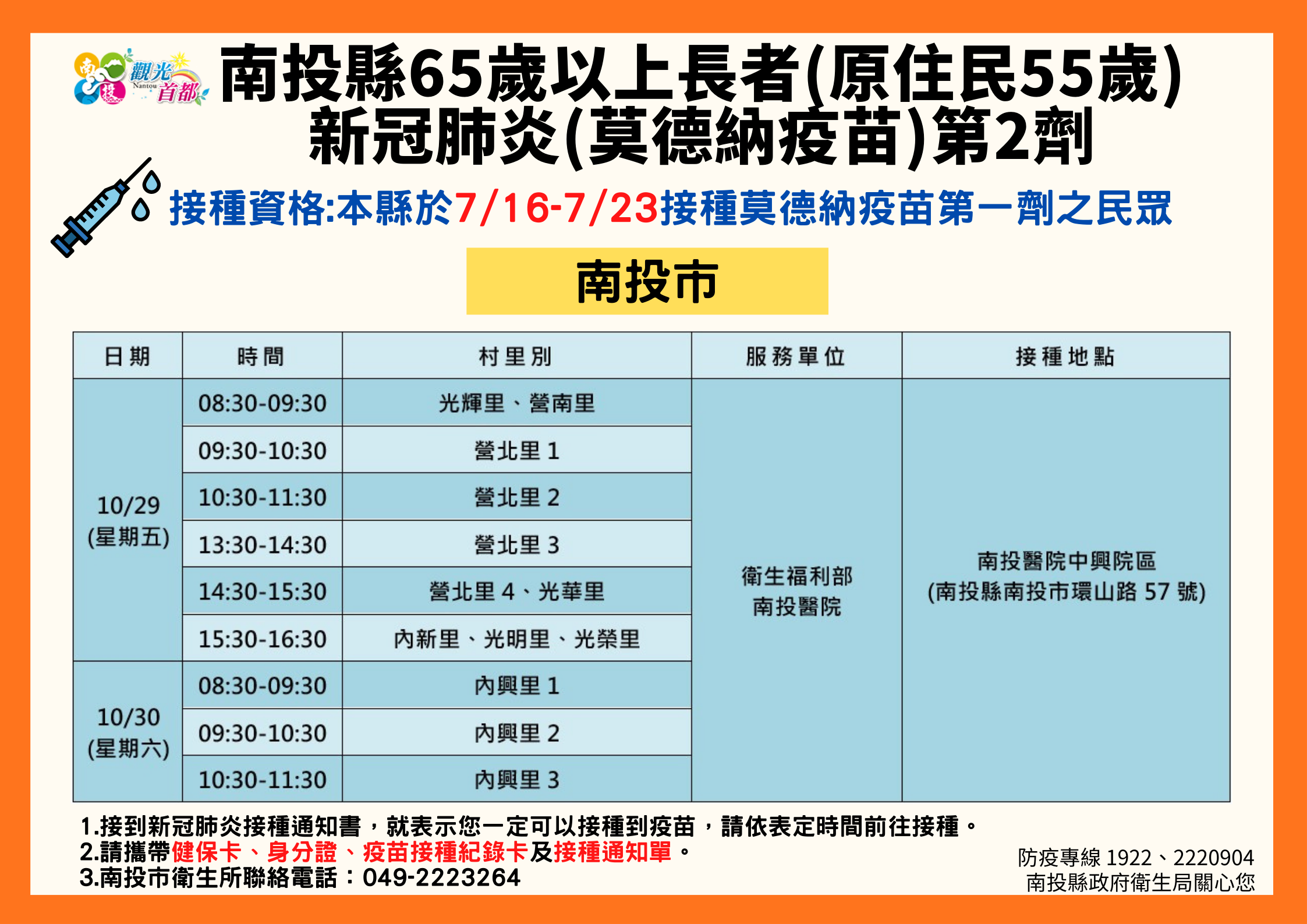 防疫宣傳 居家照護關懷手冊 防疫補助 勞工紓困 農漁畜牧 觀光紓困 企業紓困 租稅紓困 藝文紓困 中央各部會防疫專區 首頁 防疫宣傳 南投縣65歲以上(原... 南投縣65歲以上(原民55歲)長者接種莫德納第二劑13鄉鎮市時程表 公佈單位:新聞及行政處 發佈日期:110/10/19