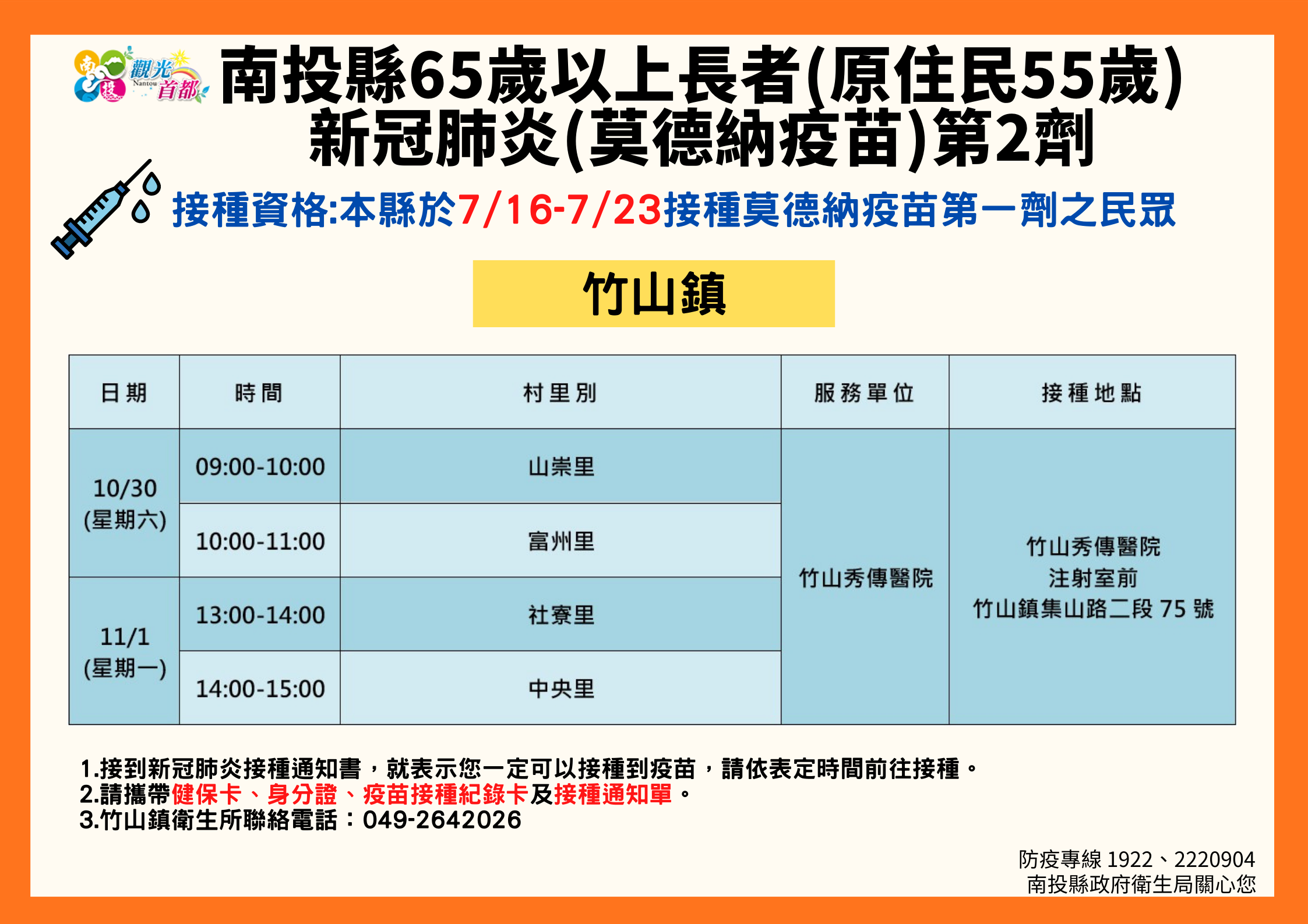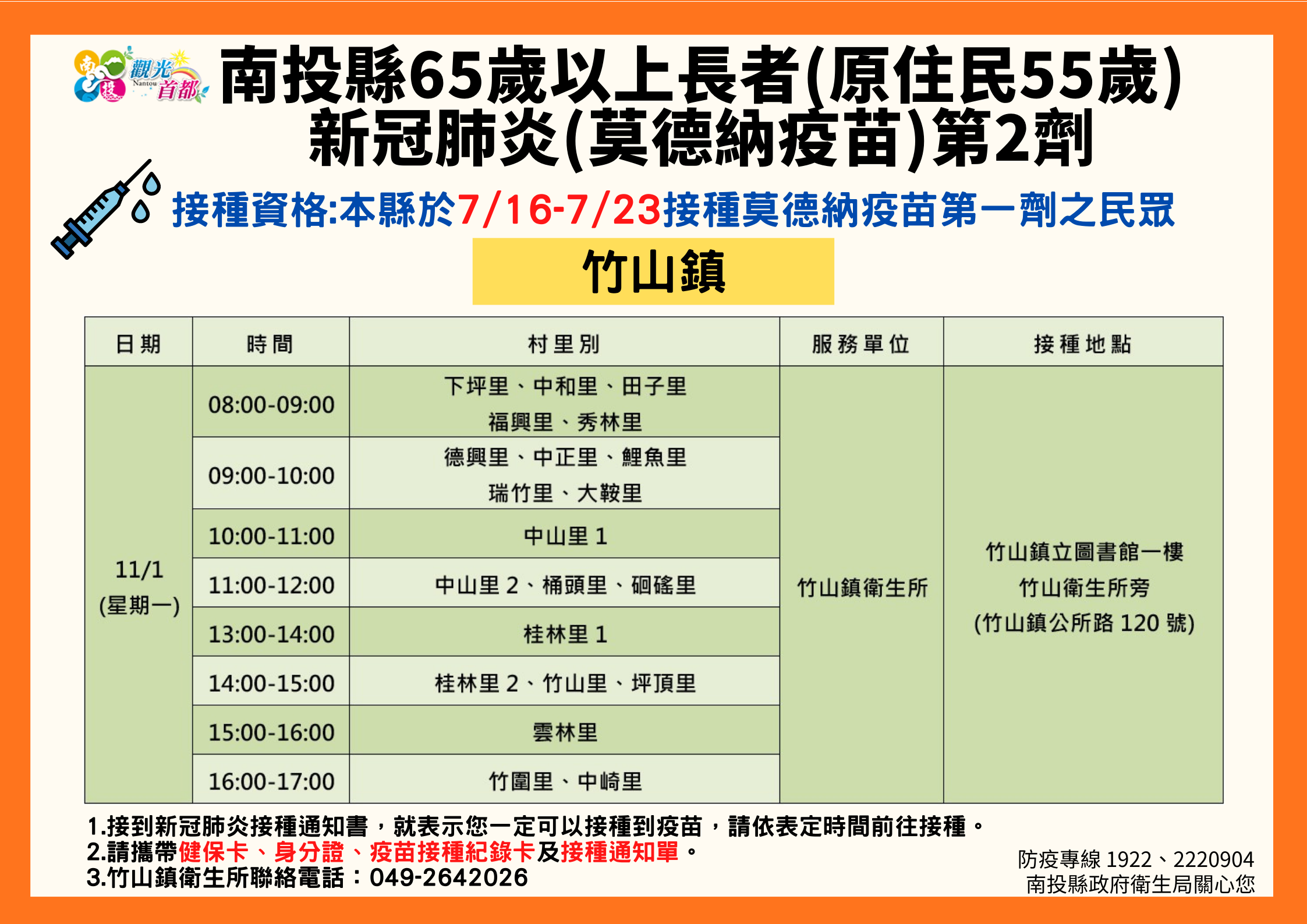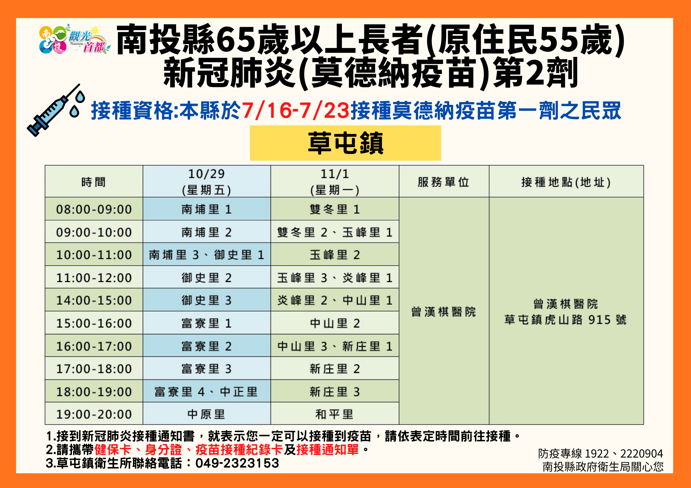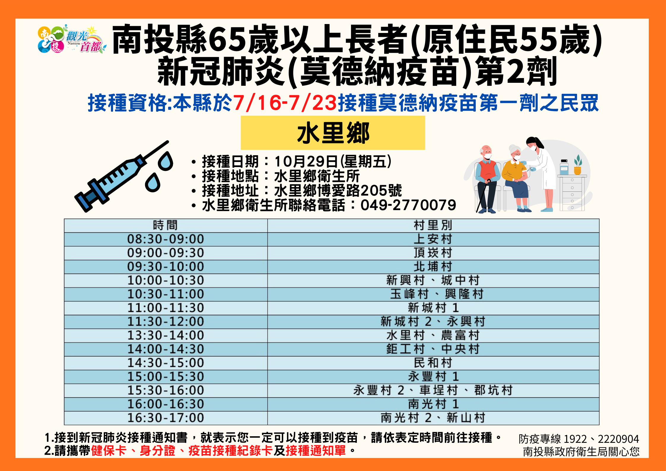 防疫宣傳 居家照護關懷手冊 防疫補助 勞工紓困 農漁畜牧 觀光紓困 企業紓困 租稅紓困 藝文紓困 中央各部會防疫專區 首頁 防疫宣傳 南投縣65歲以上(原... 南投縣65歲以上(原民55歲)長者接種莫德納第二劑13鄉鎮市時程表 公佈單位:新聞及行政處 發佈日期:110/10/19