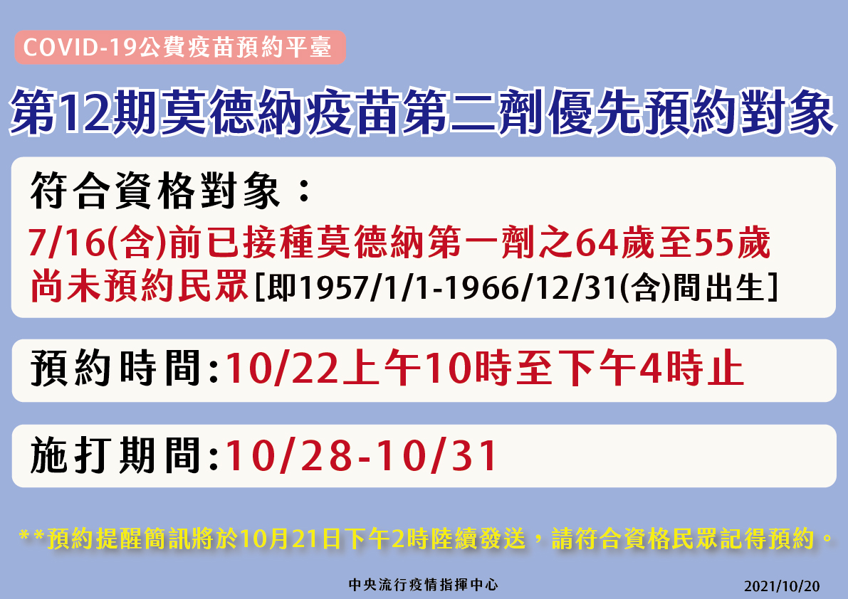 防疫宣傳 居家照護關懷手冊 防疫補助 勞工紓困 農漁畜牧 觀光紓困 企業紓困 租稅紓困 藝文紓困 中央各部會防疫專區 首頁 防疫宣傳 第12期莫德納疫苗第... 第12期莫德納疫苗第二劑優先預約對象 公佈單位:新聞及行政處 發佈日期:110/10/21