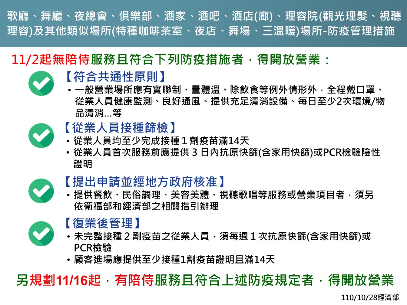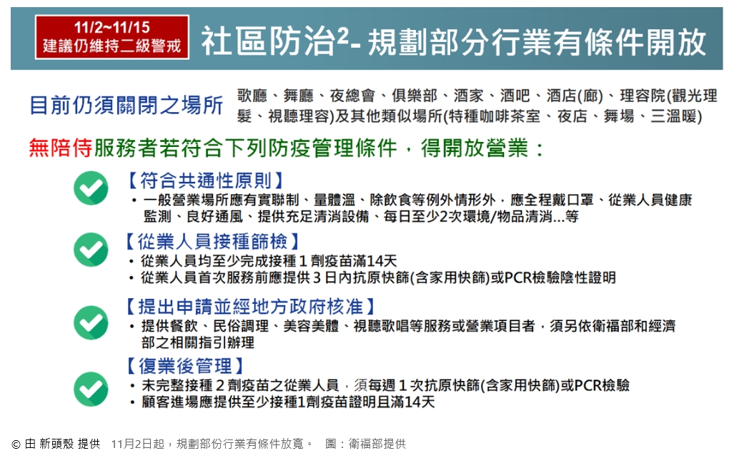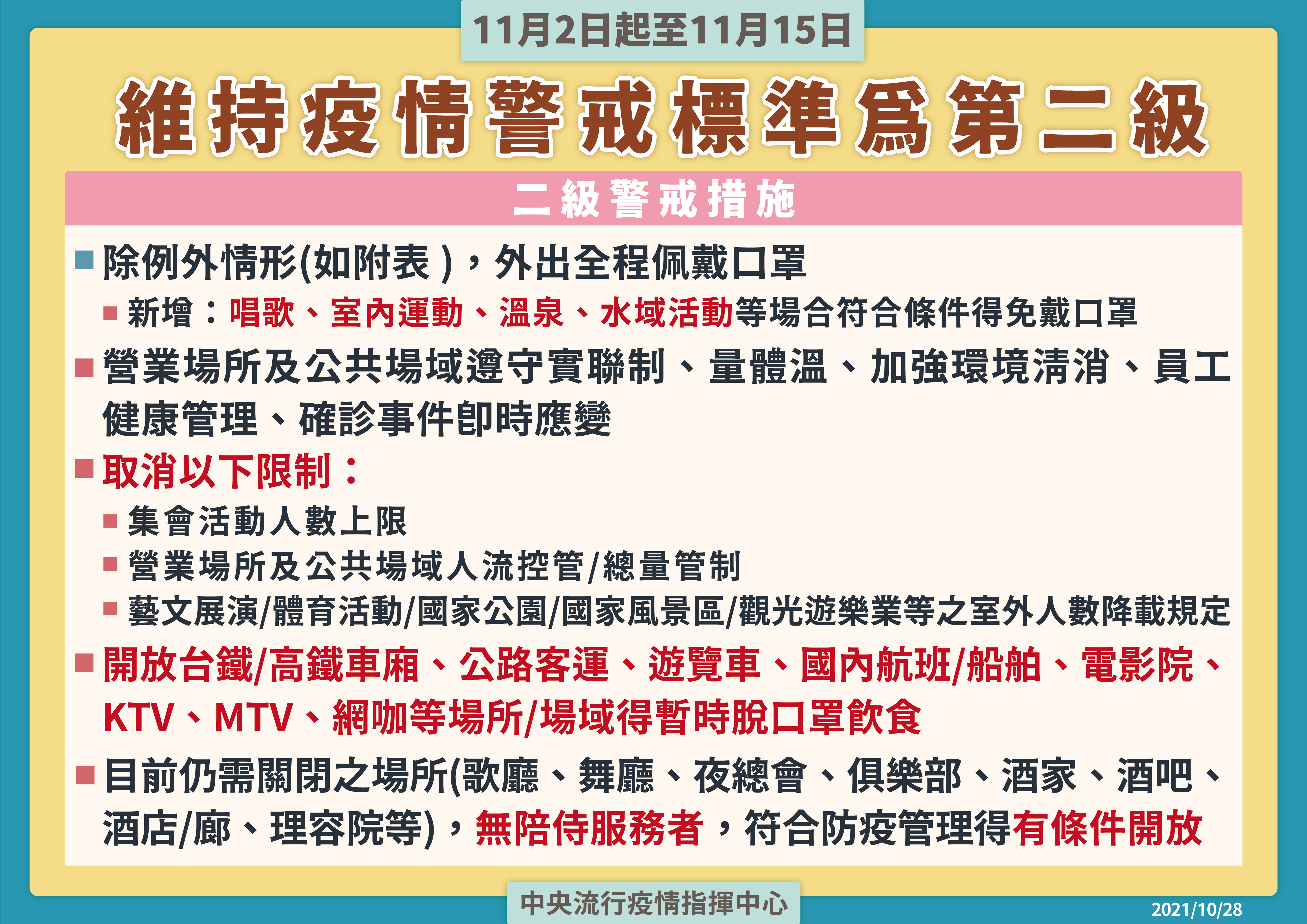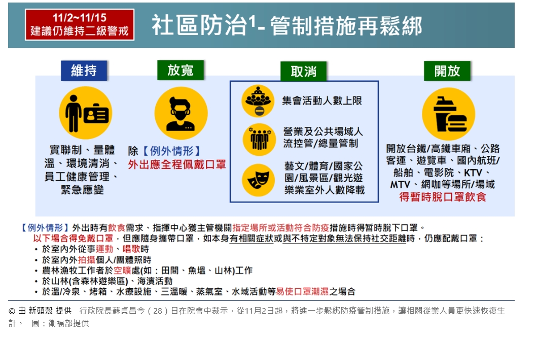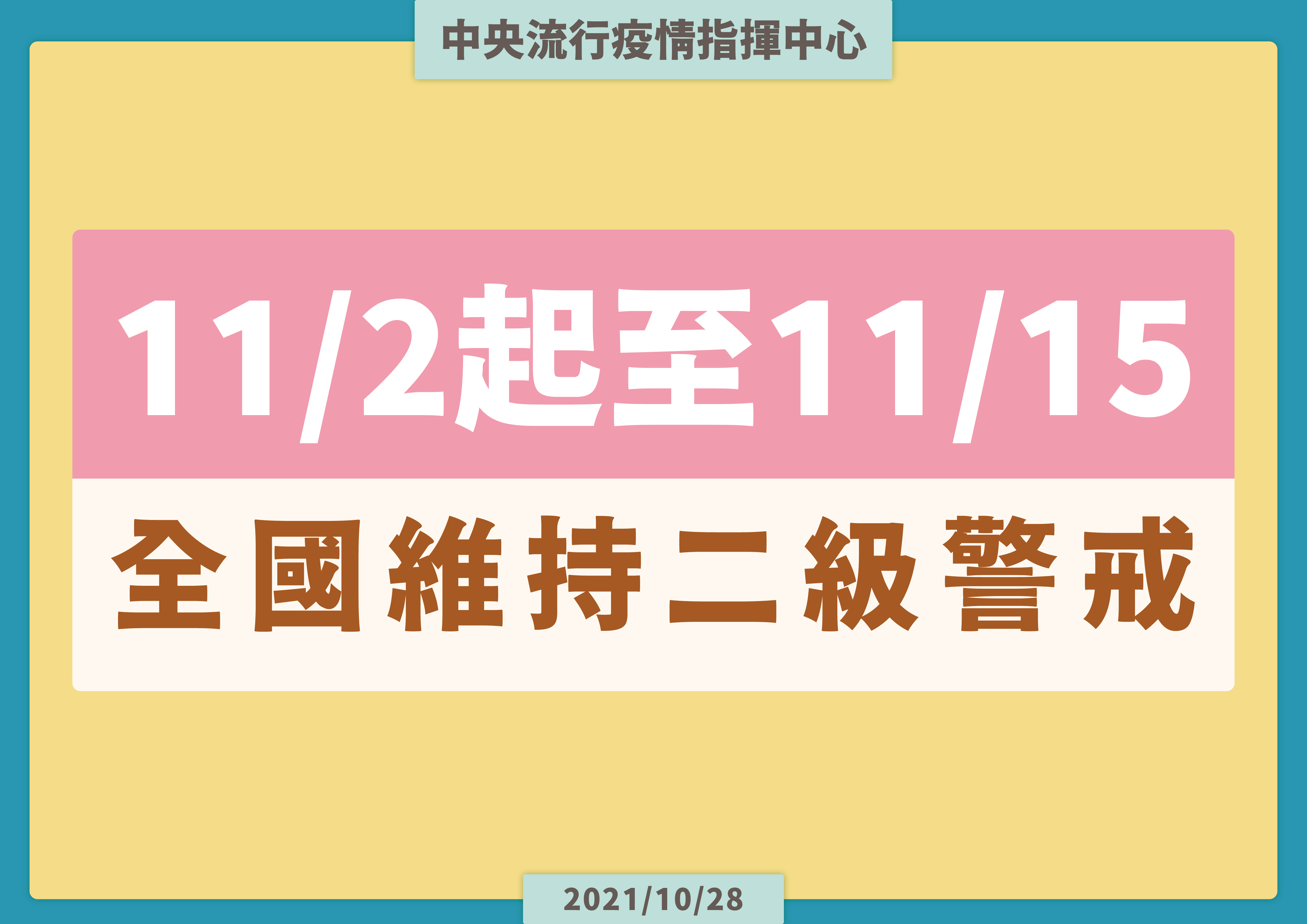 防疫宣傳 居家照護關懷手冊 防疫補助 勞工紓困 農漁畜牧 觀光紓困 企業紓困 租稅紓困 藝文紓困 中央各部會防疫專區 首頁 防疫宣傳 11/2起至11/1... 11/2起至11/15全國維持二級警戒防疫措施 公佈單位:新聞及行政處 發佈日期:110/10/28