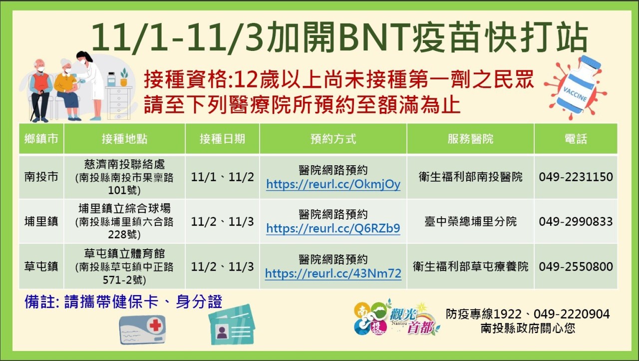 防疫宣傳 居家照護關懷手冊 防疫補助 勞工紓困 農漁畜牧 觀光紓困 企業紓困 租稅紓困 藝文紓困 中央各部會防疫專區 首頁 防疫宣傳 11/1-11/3加... 11/1-11/3加開BNT疫苗快打站 公佈單位:新聞及行政處 發佈日期:110/11/1