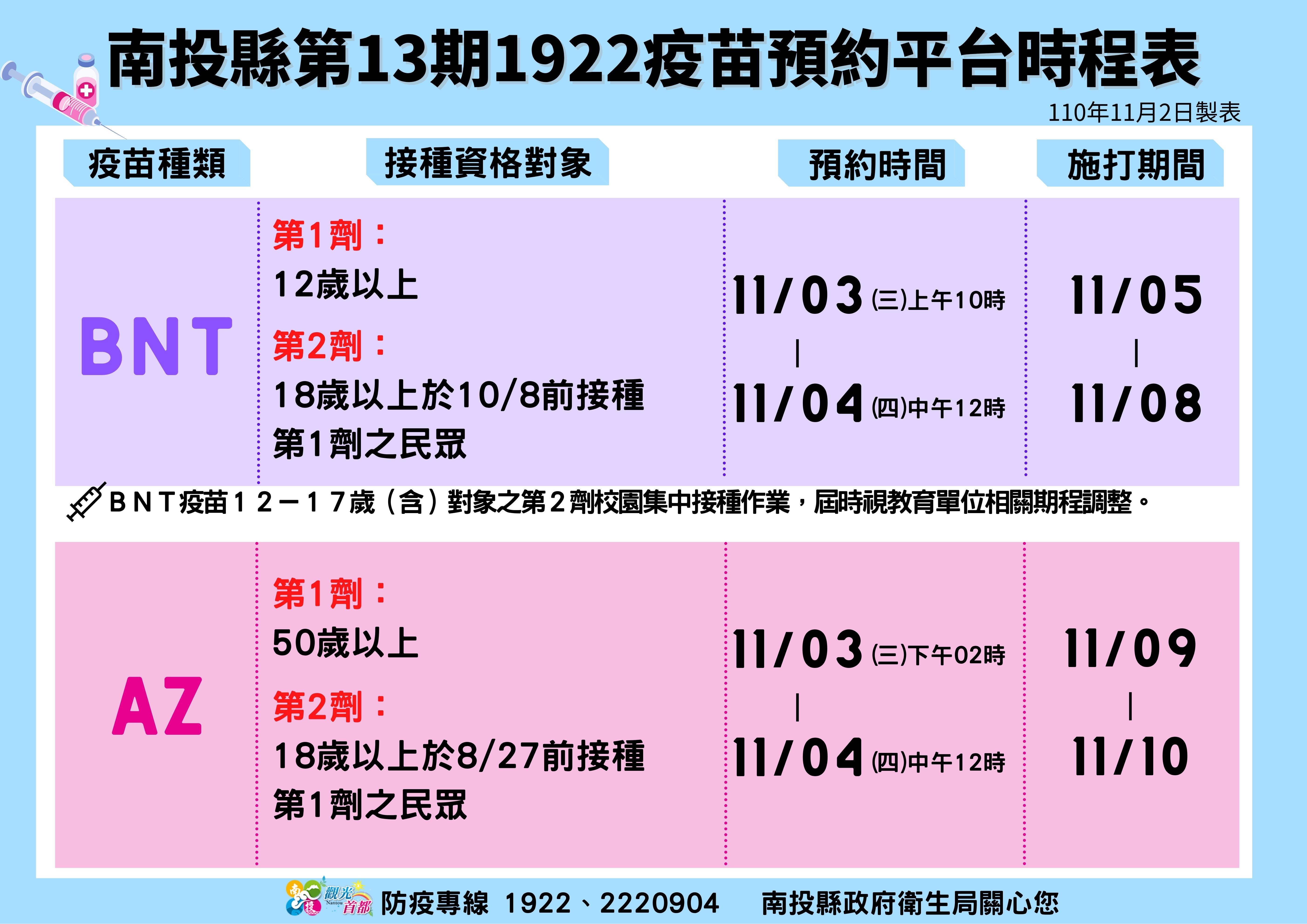 防疫宣傳 居家照護關懷手冊 防疫補助 勞工紓困 農漁畜牧 觀光紓困 企業紓困 租稅紓困 藝文紓困 中央各部會防疫專區 首頁 防疫宣傳 南投縣第13期192... 南投縣第13期1922疫苗預約平台時程表 公佈單位:新聞及行政處 發佈日期:110/11/3